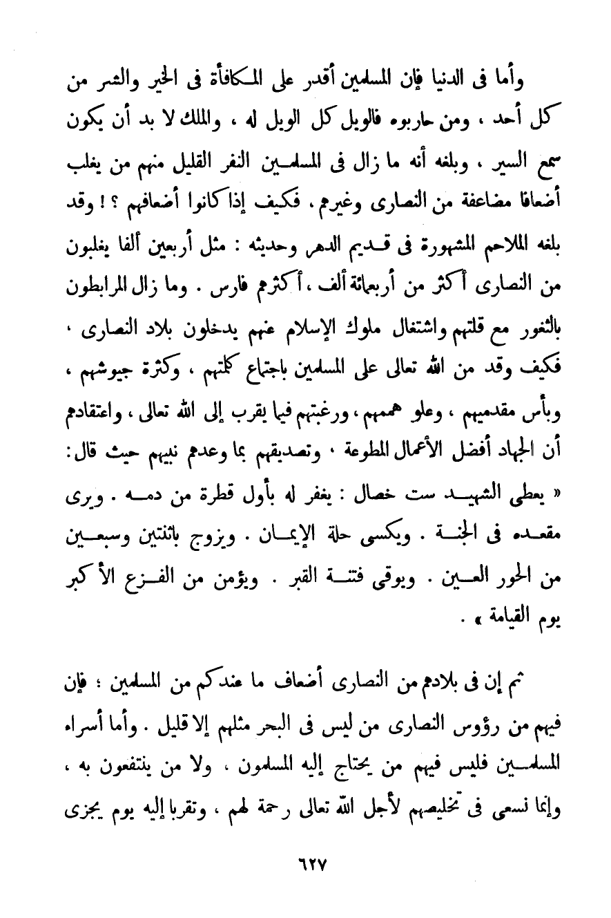 وَأَمَّا فِي الدُّنْيَا فَإِنَّ الْمُسْلِمِينَ أَقْدَرُ عَلَى الْمُكَافَأَةِ فِي الْخَيْرِ وَالشَّرِّ مِنْ كُلِّ أَحَدٍ وَمَنْ حَارَبُوهُ فَالْوَيْلُ كُلَّ الْوَيْلِ لَهُ وَالْمَلِكُ لَا بُدَّ أَنْ يَكُونَ سَمِعَ السَّيْرَ وَبَلَغَهُ أَنَّهُ مَا زَالَ فِي الْمُسْلِمِينَ النَّفَرُ الْقَلِيلُ مِنْهُمْ مَنْ يَغْلِبُ أَضْعَافًا مُضَاعَفَةً مِنْ النَّصَارَى وَغَيْرِهِمْ فَكَيْفَ إذَا كَانُوا أَضْعَافَهُمْ وَقَدْ بَلَغَهُ الْمَلَاحِمُ الْمَشْهُورَةُ فِي قَدِيمِ الدَّهْرِ وَحَدِيثِهِ: مِثْلَ أَرْبَعِينَ أَلْفًا يَغْلِبُونَ مِنْ النَّصَارَى أَكْثَرَ مِنْ أَرْبَعمِائَةِ أَلْفٍ أَكْثَرُهُمْ فَارِسٌ. وَمَا زَالَ الْمُرَابِطُونَ بِالثُّغُورِ مَعَ قِلَّتِهِمْ وَاشْتِغَالِ مُلُوكِ الْإِسْلَامِ عَنْهُمْ يَدْخُلُونَ بِلَادَ النَّصَارَى فَكَيْفَ وَقَدْ مَنَّ اللَّهُ تَعَالَى عَلَى الْمُسْلِمِينَ بِاجْتِمَاعِ كَلِمَتِهِمْ وَكَثْرَةِ جُيُوشِهِمْ وَبَأْسِ مُقَدِّمِيهِمْ وَعُلُوِّ هِمَمِهِمْ وَرَغْبَتِهِمْ فِيمَا يُقَرِّبُ إلَى اللَّهِ تَعَالَى وَاعْتِقَادِهِمْ أَنَّ الْجِهَادَ أَفْضَلُ الْأَعْمَالِ الْمُطَوَّعَةِ وَتَصْدِيقِهِمْ بِمَا وَعَدَهُمْ نَبِيُّهُمْ حَيْثُ قَالَ: {يُعْطَى الشَّهِيدُ سِتُّ خِصَالٍ: يُغْفَرُ لَهُ بِأَوَّلِ قَطْرَةٍ مِنْ دَمِهِ. وَيَرَى مَقْعَدَهُ فِي الْجَنَّةِ. وَيُكْسَى حُلَّةَ الْإِيمَانِ. وَيُزَوَّجُ بِاثْنَتَيْنِ وَسَبْعِينَ مِنْ الْحُورِ الْعِينِ. وَيُوقَى فِتْنَةَ الْقَبْرِ. وَيُؤْمَنُ مِنْ الْفَزَعِ الْأَكْبَرِ يَوْمَ الْقِيَامَةِ} . ثُمَّ إنَّ فِي بِلَادِهِمْ مِنْ النَّصَارَى أَضْعَافَ مَا عِنْدَكُمْ مِنْ الْمُسْلِمِينَ؛ فَإِنَّ فِيهِمْ مِنْ رُءُوسِ النَّصَارَى مَنْ لَيْسَ فِي الْبَحْرِ مِثْلُهُمْ إلَّا قَلِيلٌ. وَأَمَّا أُسَرَاءُ الْمُسْلِمِينَ فَلَيْسَ فِيهِمْ مَنْ يَحْتَاجُ إلَيْهِ الْمُسْلِمُونَ وَلَا مَنْ يَنْتَفِعُونَ بِهِ وَإِنَّمَا نَسْعَى فِي تَخْلِيصِهِمْ لِأَجْلِ اللَّهِ تَعَالَى رَحْمَةً لَهُمْ وَتَقَرُّبًا إلَيْهِ يَوْمَ يَجْزِي