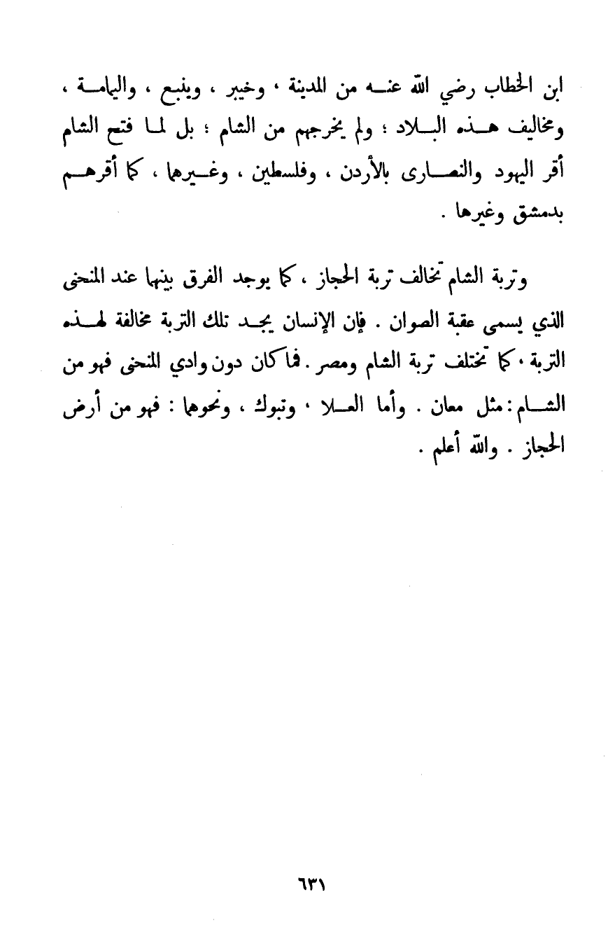 بْنُ الْخَطَّابِ رَضِيَ اللَّهُ عَنْهُ مِنْ الْمَدِينَةِ وَخَيْبَرَ وَيَنْبُعَ وَالْيَمَامَةِ وَمَخَالِيفِ هَذِهِ الْبِلَادِ؛ وَلَمْ يُخْرِجْهُمْ مِنْ الشَّامِ؛ بَلْ لَمَّا فَتَحَ الشَّامَ أَقَرَّ الْيَهُودَ وَالنَّصَارَى بِالْأُرْدُنِّ وَفِلَسْطِينَ وَغَيْرِهِمَا كَمَا أَقَرَّهُمْ بِدِمَشْقَ وَغَيْرِهَا. وَتُرْبَةُ الشَّامِ تُخَالِفُ تُرْبَةَ الْحِجَازِ كَمَا يُوجَدُ الْفَرْقُ بَيْنَهُمَا عِنْدَ الْمُنْحَنَى الَّذِي يُسَمَّى عَقَبَةَ الصُّوَانِ. فَإِنَّ الْإِنْسَانَ يَجِدُ تِلْكَ التُّرْبَةَ مُخَالِفَةً لِهَذِهِ التُّرْبَةِ كَمَا تَخْتَلِفُ تُرْبَةُ الشَّامِ وَمِصْرَ. فَمَا كَانَ دُونَ وَادِي الْمُنْحَنَى فَهُوَ مِنْ الشَّامِ: مِثْلَ مَعَانٍ. وَأَمَّا الْعُلَى وَتَبُوكَ وَنَحْوُهُمَا: فَهُوَ مِنْ أَرْضِ الْحِجَازِ. وَاَللَّهُ أَعْلَمُ.