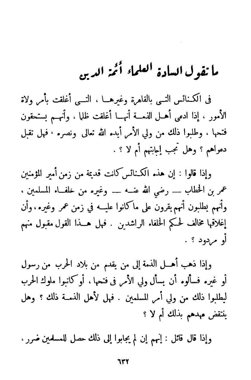 فِي الْكَنَائِسِ الَّتِي بِالْقَاهِرَةِ وَغَيْرِهَا الَّتِي أُغْلِقَتْ بِأَمْرِ وُلَاةِ الْأُمُورِ إذَا ادَّعَى أَهْلُ الذِّمَّةِ أَنَّهَا أُغْلِقَتْ ظُلْمًا وَأَنَّهُمْ يَسْتَحِقُّونَ فَتْحَهَا وَطَلَبُوا ذَلِكَ مِنْ وَلِيِّ الْأَمْرِ أَيَّدَهُ اللَّهُ تَعَالَى وَنَصَرَهُ فَهَلْ تُقْبَلُ دَعْوَاهُمْ؟ وَهَلْ تَجِبُ إجَابَتُهُمْ أَمْ لَا؟ . وَإِذَا قَالُوا: إنَّ هَذِهِ الْكَنَائِسَ كَانَتْ قَدِيمَةً مِنْ زَمَنِ أَمِيرِ الْمُؤْمِنِينَ عُمَرَ بْنِ الْخَطَّابِ - رَضِيَ اللَّهُ عَنْهُ - وَغَيْرِهِ مِنْ خُلَفَاءِ الْمُسْلِمِينَ وَأَنَّهُمْ يَطْلُبُونَ أَنَّهُمْ يُقَرُّونَ عَلَى مَا كَانُوا عَلَيْهِ فِي زَمَنِ عُمَرَ وَغَيْرِهِ وَأَنَّ إغْلَاقَهَا مُخَالِفٌ لِحُكْمِ الْخُلَفَاءِ الرَّاشِدِينَ. فَهَلْ هَذَا الْقَوْلُ مَقْبُولٌ مِنْهُمْ أَوْ مَرْدُودٌ؟ . وَإِذَا ذَهَبَ أَهْلُ الذِّمَّةِ إلَى مَنْ يَقْدَمُ مِنْ بِلَادِ الْحَرْبِ مِنْ رَسُولٍ أَوْ غَيْرِهِ فَسَأَلُوهُ أَنْ يَسْأَلَ وَلِيَّ الْأَمْرِ فِي فَتْحِهَا أَوْ كَاتَبُوا مُلُوكَ الْحَرْبِ لِيَطْلُبُوا ذَلِكَ مِنْ وَلِيِّ أَمْرِ الْمُسْلِمِينَ. فَهَلْ لِأَهْلِ الذِّمَّةِ ذَلِكَ؟ وَهَلْ يَنْتَقِضُ عَهْدُهُمْ بِذَلِكَ أَمْ لَا؟ وَإِذَا قَالَ قَائِلٌ: أَنَّهُمْ إنْ لَمْ يُجَابُوا إلَى ذَلِكَ حَصَلَ لِلْمُسْلِمِينَ ضَرَرٌ