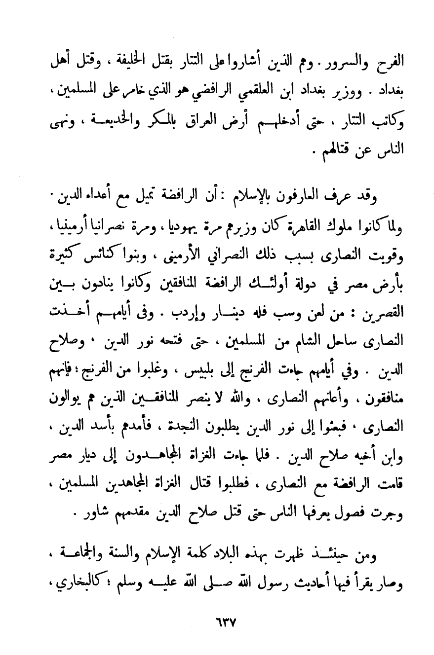 الْفَرَحَ وَالسُّرُورَ. وَهُمْ الَّذِينَ أَشَارُوا عَلَى التَّتَارِ بِقَتْلِ الْخَلِيفَةِ وَقَتْلِ أَهْلِ بَغْدَادَ. وَوَزِيرِ بَغْدَادَ ابْنِ العلقمي الرَّافِضِي هُوَ الَّذِي خَامَرَ عَلَى الْمُسْلِمِينَ وَكَاتَبَ التَّتَارَ حَتَّى أَدْخَلَهُمْ أَرْضَ الْعِرَاقِ بِالْمَكْرِ وَالْخَدِيعَةِ وَنَهَى النَّاسَ عَنْ قِتَالِهِمْ. وَقَدْ عَرَفَ الْعَارِفُونَ بِالْإِسْلَامِ: أَنَّ الرَّافِضَةَ تَمِيلُ مَعَ أَعْدَاءِ الدِّينِ. وَلَمَّا كَانُوا مُلُوكَ الْقَاهِرَةِ كَانَ وَزِيرُهُمْ مَرَّةً يَهُودِيًّا وَمَرَّةً نَصْرَانِيًّا أَرْمِينِيًّا وَقَوِيَتْ النَّصَارَى بِسَبَبِ ذَلِكَ النَّصْرَانِيِّ الْأَرْمِينِيِّ وَبَنَوْا كَنَائِسَ كَثِيرَةً بِأَرْضِ مِصْرَ فِي دَوْلَةِ أُولَئِكَ الرَّافِضَةِ الْمُنَافِقِينَ وَكَانُوا يُنَادُونَ بَيْنَ الْقَصْرَيْنِ: مَنْ لَعَنَ وَسَبَّ فَلَهُ دِينَارٌ وَإِرْدَبٌّ. وَفِي أَيَّامِهِمْ أَخَذَتْ النَّصَارَى سَاحِلَ الشَّامِ مِنْ الْمُسْلِمِينَ حَتَّى فَتَحَهُ نُورُ الدِّينِ وَصَلَاحُ الدِّينِ. وَفِي أَيَّامِهِمْ جَاءَتْ الفرنج إلَى بلبيس وَغَلَبُوا مِنْ الفرنج؛ فَإِنَّهُمْ مُنَافِقُونَ وَأَعَانَهُمْ النَّصَارَى وَاَللَّهُ لَا يَنْصُرُ الْمُنَافِقِينَ الَّذِينَ هُمْ يُوَالُونَ النَّصَارَى فَبَعَثُوا إلَى نُورِ الدِّينِ يَطْلُبُونَ النَّجْدَةَ فَأَمَدَّهُمْ بِأَسَدِ الدِّينِ وَابْنِ أَخِيهِ صَلَاحِ الدِّينِ. فَلَمَّا جَاءَتْ الْغُزَاةُ الْمُجَاهِدُونَ إلَى دِيَارِ مِصْرَ قَامَتْ الرَّافِضَةُ مَعَ النَّصَارَى فَطَلَبُوا قِتَالَ الْغُزَاةِ الْمُجَاهِدِينَ الْمُسْلِمِينَ وَجَرَتْ فُصُولٌ يَعْرِفُهَا النَّاسُ حَتَّى قَتَلَ صَلَاحُ الدِّينِ مُقَدِّمَهُمْ شَاوَرَ. وَمِنْ حِينَئِذٍ ظَهَرَتْ بِهَذِهِ الْبِلَادِ كَلِمَةُ الْإِسْلَامِ وَالسُّنَّةُ وَالْجَمَاعَةُ وَصَارَ يُقْرَأُ فِيهَا أَحَادِيثُ رَسُولِ اللَّهِ صَلَّى اللَّهُ عَلَيْهِ وَسَلَّمَ كَالْبُخَارِيِّ