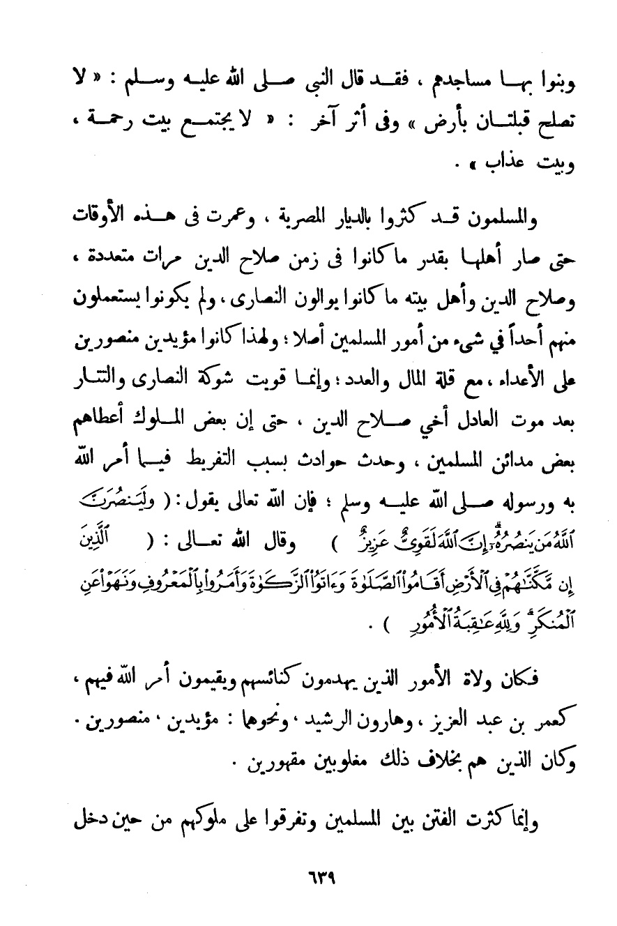 وَبَنَوْا بِهَا مَسَاجِدَهُمْ فَقَدْ قَالَ النَّبِيُّ صَلَّى اللَّهُ عَلَيْهِ وَسَلَّمَ {لَا تَصْلُحُ قِبْلَتَانِ بِأَرْضِ} وَفِي أَثَرٍ آخَرَ: {لَا يَجْتَمِعُ بَيْتُ رَحْمَةٍ وَبَيْتُ عَذَابٍ} . وَالْمُسْلِمُونَ قَدْ كَثُرُوا بِالدِّيَارِ الْمِصْرِيَّةِ وَعَمُرَتْ فِي هَذِهِ الْأَوْقَاتِ حَتَّى صَارَ أَهْلُهَا بِقَدْرِ مَا كَانُوا فِي زَمَنِ صَلَاحِ الدِّينِ مَرَّاتٍ مُتَعَدِّدَةٍ وَصَلَاحِ الدِّينِ وَأَهْلِ بَيْتِهِ مَا كَانُوا يُوَالُونَ النَّصَارَى وَلَمْ يَكُونُوا يَسْتَعْمِلُونَ مِنْهُمْ أَحَدًا فِي شَيْءٍ مِنْ أُمُورِ الْمُسْلِمِينَ أَصْلًا؛ وَلِهَذَا كَانُوا مُؤَيِّدِينَ مَنْصُورِينَ عَلَى الْأَعْدَاءِ مَعَ قِلَّةِ الْمَالِ وَالْعَدَدِ؛ وَإِنَّمَا قَوِيَتْ شَوْكَةُ النَّصَارَى وَالتَّتَارِ بَعْدَ مَوْتِ الْعَادِلِ أَخِي صَلَاحِ الدِّينِ حَتَّى إنَّ بَعْضَ الْمُلُوكِ أَعْطَاهُمْ بَعْضَ مَدَائِنِ الْمُسْلِمِينَ وَحَدَثَ حَوَادِثُ بِسَبَبِ التَّفْرِيطِ فِيمَا أَمَرَ اللَّهُ بِهِ وَرَسُولُهُ صَلَّى اللَّهُ عَلَيْهِ وَسَلَّمَ فَإِنَّ اللَّهَ تَعَالَى يَقُولُ: {وَلَيَنْصُرَنَّ اللَّهُ مَنْ يَنْصُرُهُ إنَّ اللَّهَ لَقَوِيٌّ عَزِيزٌ} وَقَالَ اللَّهُ تَعَالَى: {الَّذِينَ إنْ مَكَّنَّاهُمْ فِي الْأَرْضِ أَقَامُوا الصَّلَاةَ وَآتَوُا الزَّكَاةَ وَأَمَرُوا بِالْمَعْرُوفِ وَنَهَوْا عَنِ الْمُنْكَرِ وَلِلَّهِ عَاقِبَةُ الْأُمُورِ} . فَكَانَ وُلَاةُ الْأُمُورِ الَّذِينَ يَهْدِمُونَ كَنَائِسَهُمْ وَيُقِيمُونَ أَمْرَ اللَّهِ فِيهِمْ كَعُمَرِ بْنِ عَبْدِ الْعَزِيزِ وَهَارُونَ الرَّشِيدِ وَنَحْوِهِمَا: مُؤَيِّدِينَ مَنْصُورِينَ. وَكَانَ الَّذِينَ هُمْ بِخِلَافِ ذَلِكَ مَغْلُوبِينَ مَقْهُورِينَ. وَإِنَّمَا كَثُرَتْ الْفِتَنُ بَيْنَ الْمُسْلِمِينَ وَتَفَرَّقُوا عَلَى مُلُوكِهِمْ مِنْ حِينِ دَخَلَ
