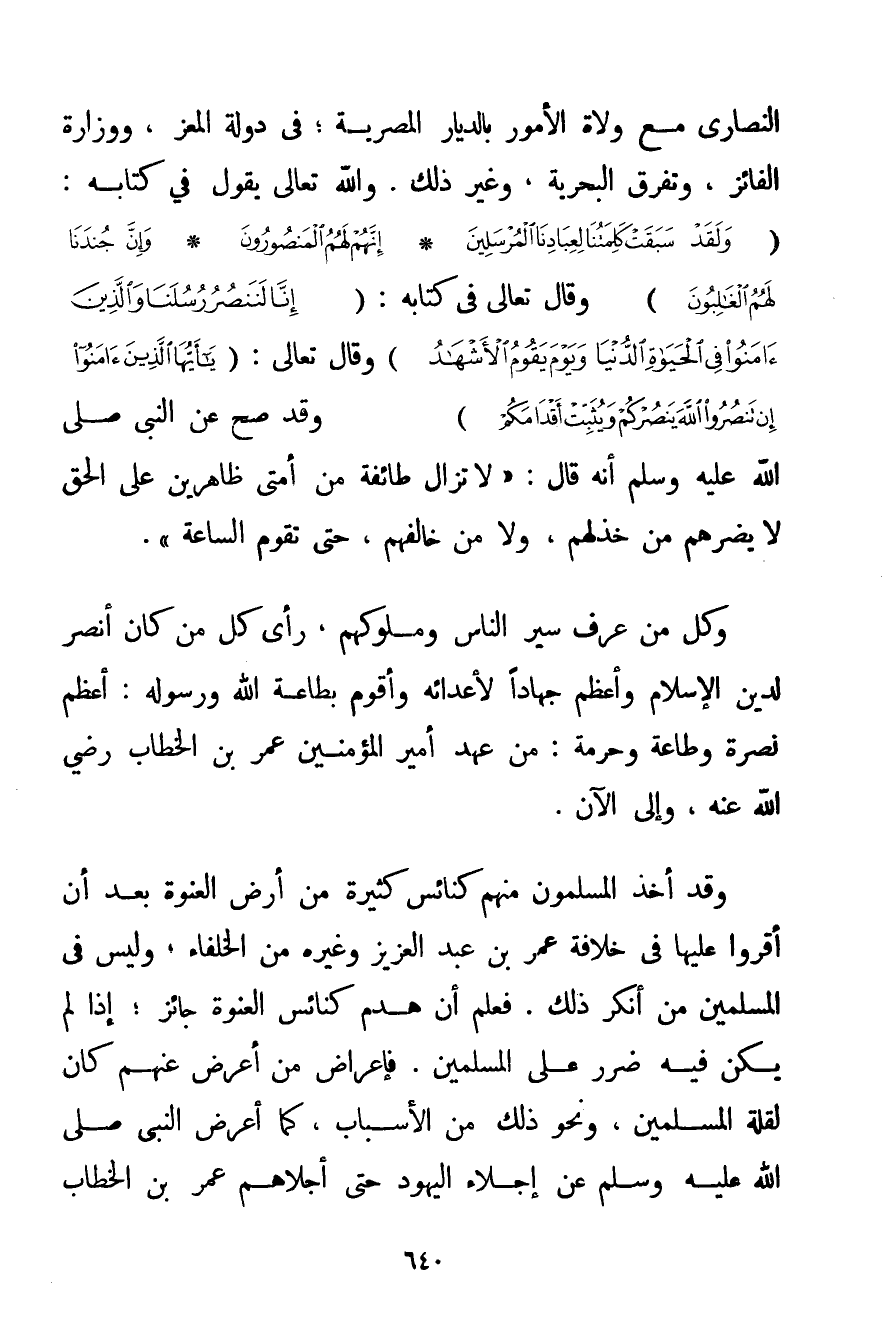 النَّصَارَى مَعَ وُلَاةِ الْأُمُورِ بِالدِّيَارِ الْمِصْرِيَّةِ؛ فِي دَوْلَةِ الْمُعِزِّ وَوِزَارَةِ الْفَائِزِ وَتَفَرُّقِ الْبَحْرِيَّةِ وَغَيْرِ ذَلِكَ. وَاَللَّهُ تَعَالَى يَقُولُ فِي كِتَابِهِ: {وَلَقَدْ سَبَقَتْ كَلِمَتُنَا لِعِبَادِنَا الْمُرْسَلِينَ} {إنَّهُمْ لَهُمُ الْمَنْصُورُونَ} {وَإِنَّ جُنْدَنَا لَهُمُ الْغَالِبُونَ} وَقَالَ تَعَالَى فِي كِتَابِهِ: {إنَّا لَنَنْصُرُ رُسُلَنَا وَالَّذِينَ آمَنُوا فِي الْحَيَاةِ الدُّنْيَا وَيَوْمَ يَقُومُ الْأَشْهَادُ} وَقَالَ تَعَالَى: {يَا أَيُّهَا الَّذِينَ آمَنُوا إنْ تَنْصُرُوا اللَّهَ يَنْصُرْكُمْ وَيُثَبِّتْ أَقْدَامَكُمْ} وَقَدْ صَحَّ عَنْ النَّبِيِّ صَلَّى اللَّهُ عَلَيْهِ وَسَلَّمَ أَنَّهُ قَالَ: {لَا تَزَالُ طَائِفَةٌ مِنْ أُمَّتِي ظَاهِرِينَ عَلَى الْحَقِّ لَا يَضُرُّهُمْ مَنْ خَذَلَهُمْ وَلَا مَنْ خَالَفَهُمْ حَتَّى تَقُومَ السَّاعَةُ} . وَكُلُّ مَنْ عَرَفَ سَيْرَ النَّاسِ وَمُلُوكَهُمْ رَأَى كُلَّ مَنْ كَانَ أَنْصَرَ لِدِينِ الْإِسْلَامِ وَأَعْظَمَ جِهَادًا لِأَعْدَائِهِ وَأَقْوَمَ بِطَاعَةِ اللَّهِ وَرَسُولِهِ: أَعْظَمَ نُصْرَةً وَطَاعَةً وَحُرْمَةً: مِنْ عَهْدِ أَمِيرِ الْمُؤْمِنِينَ عُمَرَ بْنِ الْخَطَّابِ رَضِيَ اللَّهُ عَنْهُ وَإِلَى الْآنَ. وَقَدْ أَخَذَ الْمُسْلِمُونَ مِنْهُمْ كَنَائِسَ كَثِيرَةً مِنْ أَرْضِ الْعَنْوَةِ بَعْدَ أَنْ أَقَرُّوا عَلَيْهَا فِي خِلَافَةِ عُمَرَ بْنِ عَبْدِ الْعَزِيزِ وَغَيْرِهِ مِنْ الْخُلَفَاءِ وَلَيْسَ فِي الْمُسْلِمِينَ مَنْ أَنْكَرَ ذَلِكَ. فَعُلِمَ أَنَّ هَدْمَ كَنَائِسِ الْعَنْوَةِ جَائِزٌ؛ إذَا لَمْ يَكُنْ فِيهِ ضَرَرٌ عَلَى الْمُسْلِمِينَ. فَإِعْرَاضُ مَنْ أَعْرَضَ عَنْهُمْ كَانَ لِقِلَّةِ الْمُسْلِمِينَ وَنَحْوَ ذَلِكَ مِنْ الْأَسْبَابِ كَمَا أَعْرَضَ النَّبِيُّ صَلَّى اللَّهُ عَلَيْهِ وَسَلَّمَ عَنْ إجْلَاءِ الْيَهُودِ حَتَّى أَجْلَاهُمْ عُمَرُ بْنُ الْخَطَّابِ