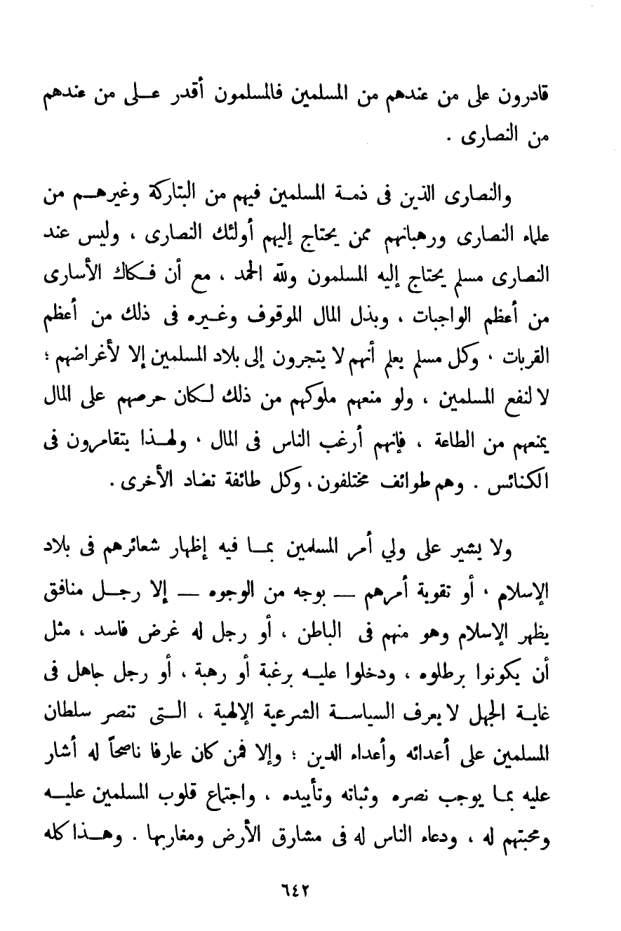 قَادِرُونَ عَلَى مَنْ عِنْدَهُمْ مِنْ الْمُسْلِمِينَ فَالْمُسْلِمُونَ أَقْدَرُ عَلَى مَنْ عِنْدَهُمْ مِنْ النَّصَارَى. وَالنَّصَارَى الَّذِينَ فِي ذِمَّةِ الْمُسْلِمِينَ فِيهِمْ مِنْ البتاركة وَغَيْرِهِمْ مِنْ عُلَمَاءِ النَّصَارَى وَرُهْبَانِهِمْ مِمَّنْ يَحْتَاجُ إلَيْهِمْ أُولَئِكَ النَّصَارَى وَلَيْسَ عِنْدَ النَّصَارَى مُسْلِمٌ يَحْتَاجُ إلَيْهِ الْمُسْلِمُونَ وَلِلَّهِ الْحَمْدُ مَعَ أَنَّ فِكَاكَ الْأَسَارَى مِنْ أَعْظَمِ الْوَاجِبَاتِ وَبَذْلَ الْمَالِ الْمَوْقُوفِ وَغَيْرِهِ فِي ذَلِكَ مِنْ أَعْظَمِ الْقُرُبَاتِ وَكُلُّ مُسْلِمٍ يَعْلَمُ أَنَّهُمْ لَا يَتَّجِرُونَ إلَى بِلَادِ الْمُسْلِمِينَ إلَّا لِأَغْرَاضِهِمْ؛ لَا لِنَفْعِ الْمُسْلِمِينَ وَلَوْ مَنَعَهُمْ مُلُوكُهُمْ مِنْ ذَلِكَ لَكَانَ حِرْصُهُمْ عَلَى الْمَالِ يَمْنَعُهُمْ مِنْ الطَّاعَةِ فَإِنَّهُمْ أَرْغَبُ النَّاسِ فِي الْمَالِ وَلِهَذَا يَتَقَامَرُونَ فِي الْكَنَائِسِ. وَهُمْ طَوَائِفُ مُخْتَلِفُونَ وَكُلُّ طَائِفَةٍ تَضَادُّ الْأُخْرَى. وَلَا يُشِيرُ عَلَى وَلِيِّ أَمْرِ الْمُسْلِمِينَ بِمَا فِيهِ إظْهَارُ شَعَائِرِهِمْ فِي بِلَادِ الْإِسْلَامِ أَوْ تَقْوِيَةُ أَمْرِهِمْ - بِوَجْهِ مِنْ الْوُجُوهِ - إلَّا رَجُلٌ مُنَافِقٌ يُظْهِرُ الْإِسْلَامَ وَهُوَ مِنْهُمْ فِي الْبَاطِنِ أَوْ رَجُلٌ لَهُ غَرَضٌ فَاسِدٌ مِثْلَ أَنْ يَكُونُوا بَرْطَلُوهُ وَدَخَلُوا عَلَيْهِ بِرَغْبَةِ أَوْ رَهْبَةٍ أَوْ رَجُلٌ جَاهِلٌ فِي غَايَةِ الْجَهْلِ لَا يَعْرِفُ السِّيَاسَةَ الشَّرْعِيَّةَ الْإِلَهِيَّةَ الَّتِي تَنْصُرُ سُلْطَانَ الْمُسْلِمِينَ عَلَى أَعْدَائِهِ وَأَعْدَاءِ الدِّينِ؛ وَإِلَّا فَمَنْ كَانَ عَارِفًا نَاصِحًا لَهُ أَشَارَ عَلَيْهِ بِمَا يُوجِبُ نَصْرَهُ وَثَبَاتَهُ وَتَأْيِيدَهُ وَاجْتِمَاعَ قُلُوبِ الْمُسْلِمِينَ عَلَيْهِ وَمَحَبَّتَهُمْ لَهُ وَدُعَاءَ النَّاسِ لَهُ فِي مَشَارِقِ الْأَرْضِ وَمَغَارِبِهَا. وَهَذَا كُلُّهُ