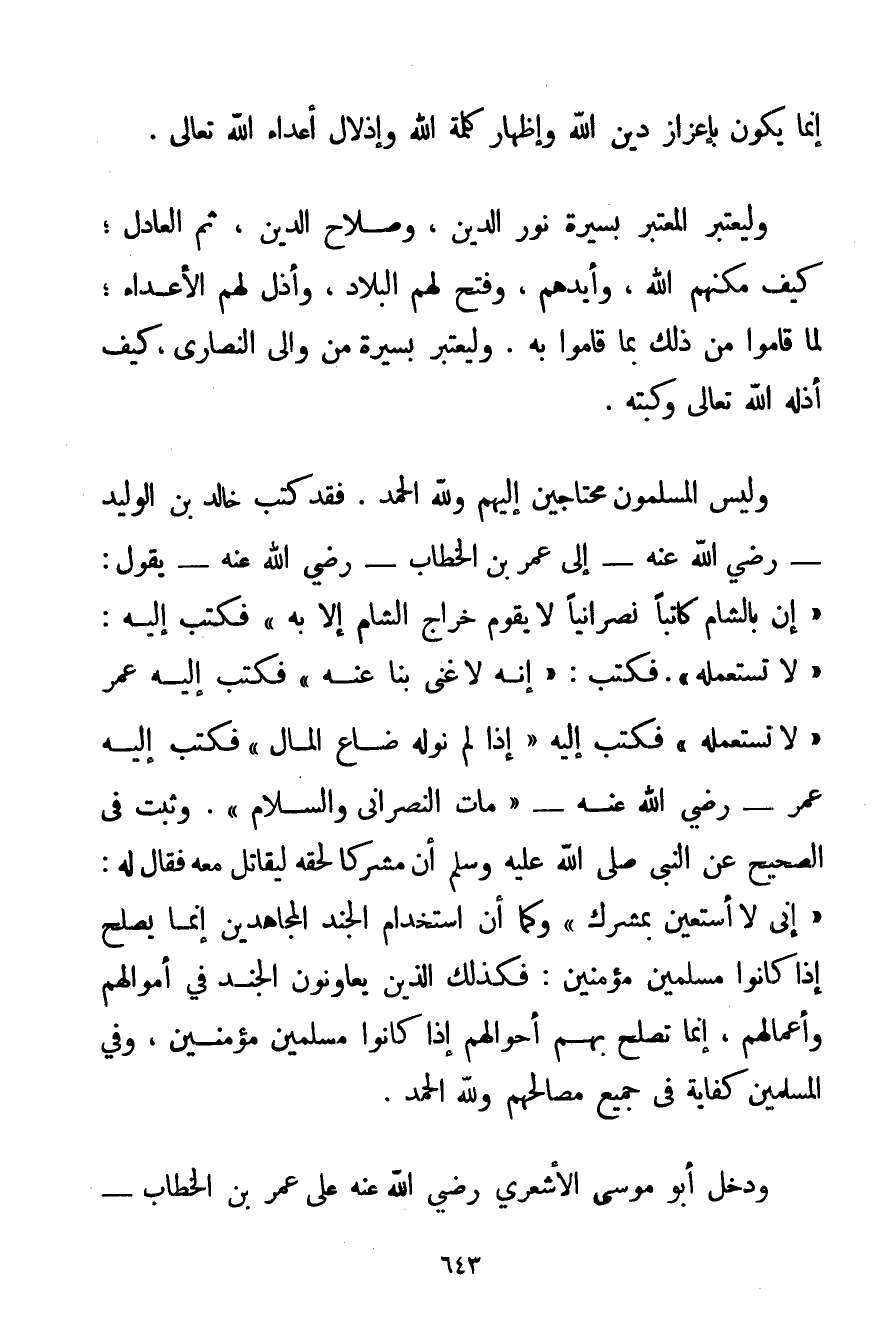 إنَّمَا يَكُونُ بِإِعْزَازِ دِينِ اللَّهِ وَإِظْهَارِ كَلِمَةِ اللَّهِ وَإِذْلَالِ أَعْدَاءِ اللَّهِ تَعَالَى. وَلْيَعْتَبِرْ الْمُعْتَبِرُ بِسِيرَةِ نُورِ الدِّينِ وَصَلَاحِ الدِّينِ ثُمَّ الْعَادِلِ؛ كَيْفَ مَكَّنَهُمْ اللَّهُ وَأَيَّدَهُمْ وَفَتَحَ لَهُمْ الْبِلَادَ وَأَذَلَّ لَهُمْ الْأَعْدَاءَ؛ لَمَّا قَامُوا مِنْ ذَلِكَ بِمَا قَامُوا بِهِ. وَلْيَعْتَبِرْ بِسِيرَةِ مَنْ وَالَى النَّصَارَى كَيْفَ أَذَلَّهُ اللَّهُ تَعَالَى وَكَبَتَهُ. وَلَيْسَ الْمُسْلِمُونَ مُحْتَاجِينَ إلَيْهِمْ وَلِلَّهِ الْحَمْدُ. فَقَدْ كَتَبَ خَالِدُ بْنُ الْوَلِيدِ - رَضِيَ اللَّهُ عَنْهُ - إلَى عُمَرَ بْنِ الْخَطَّابِ - رَضِيَ اللَّهُ عَنْهُ - يَقُولُ: " إنَّ بِالشَّامِ كَاتِبًا نَصْرَانِيًّا لَا يَقُومُ خَرَاجُ الشَّامِ إلَّا بِهِ " فَكَتَبَ إلَيْهِ: " لَا تَسْتَعْمِلْهُ ". فَكَتَبَ: " إنَّهُ لَا غِنَى بِنَا عَنْهُ " فَكَتَبَ إلَيْهِ عُمَرُ " لَا تَسْتَعْمِلْهُ " فَكَتَبَ إلَيْهِ " إذَا لَمْ نُوَلِّهْ ضَاعَ الْمَالُ " فَكَتَبَ إلَيْهِ عُمَرُ - رَضِيَ اللَّهُ عَنْهُ - " مَاتَ النَّصْرَانِيُّ وَالسَّلَامُ ". وَثَبَتَ فِي الصَّحِيحِ {عَنْ النَّبِيِّ صَلَّى اللَّهُ عَلَيْهِ وَسَلَّمَ أَنَّ مُشْرِكًا لَحِقَهُ لِيُقَاتِلَ مَعَهُ فَقَالَ لَهُ: إنِّي لَا أَسْتَعِينُ بِمُشْرِكِ} وَكَمَا أَنَّ اسْتِخْدَامَ الْجُنْدِ الْمُجَاهِدِينَ إنَّمَا يَصْلُحُ إذَا كَانُوا مُسْلِمِينَ مُؤْمِنِينَ: فَكَذَلِكَ الَّذِينَ يُعَاوِنُونَ الْجُنْدَ فِي أَمْوَالِهِمْ وَأَعْمَالِهِمْ إنَّمَا تَصْلُحُ بِهِمْ أَحْوَالُهُمْ إذَا كَانُوا مُسْلِمِينَ مُؤْمِنِينَ وَفِي الْمُسْلِمِينَ كِفَايَةٌ فِي جَمِيعِ مَصَالِحِهِمْ وَلِلَّهِ الْحَمْدُ. وَدَخَلَ أَبُو مُوسَى الْأَشْعَرِيُّ رَضِيَ اللَّهُ عَنْهُ عَلَى عُمَرَ بْنِ الْخَطَّابِ - رَضِيَ اللَّهُ عَنْهُ -