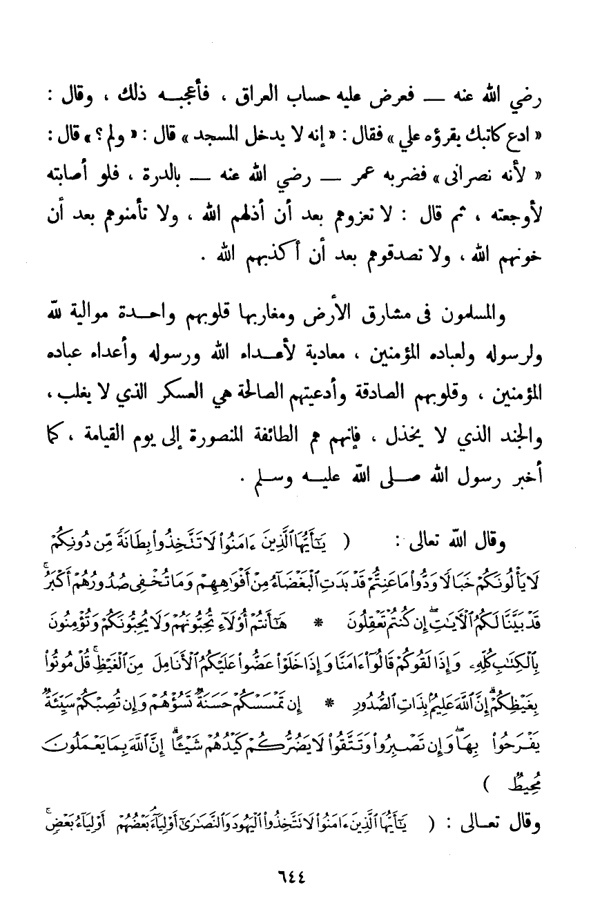 - رَضِيَ اللَّهُ عَنْهُ - فَعَرَضَ عَلَيْهِ حِسَابَ الْعِرَاقِ فَأَعْجَبَهُ ذَلِكَ وَقَالَ: " اُدْعُ كَاتِبَك يَقْرَؤُهُ عَلَيَّ " فَقَالَ: " إنَّهُ لَا يَدْخُلُ الْمَسْجِدَ " قَالَ: " وَلِمَ؟ " قَالَ: " لِأَنَّهُ نَصْرَانِيٌّ " فَضَرَبَهُ عُمَرُ - رَضِيَ اللَّهُ عَنْهُ - بِالدِّرَّةِ فَلَوْ أَصَابَتْهُ لَأَوْجَعَتْهُ ثُمَّ قَالَ: لَا تُعِزُّوهُمْ بَعْدَ أَنْ أَذَلَّهُمْ اللَّهُ وَلَا تَأْمَنُوهُمْ بَعْدَ أَنْ خَوَّنَهُمْ اللَّهُ وَلَا تُصَدِّقُوهُمْ بَعْدَ أَنْ أَكْذَبَهُمْ اللَّهُ. وَالْمُسْلِمُونَ فِي مَشَارِقِ الْأَرْضِ وَمَغَارِبِهَا قُلُوبُهُمْ وَاحِدَةٌ مُوَالِيَةٌ لِلَّهِ وَلِرَسُولِهِ وَلِعِبَادِهِ الْمُؤْمِنِينَ مُعَادِيَةٌ لِأَعْدَاءِ اللَّهِ وَرَسُولِهِ وَأَعْدَاءِ عِبَادِهِ الْمُؤْمِنِينَ وَقُلُوبُهُمْ الصَّادِقَةُ وَأَدْعِيَتُهُمْ الصَّالِحَةُ هِيَ الْعَسْكَرُ الَّذِي لَا يُغْلَبُ وَالْجُنْدُ الَّذِي لَا يُخْذَلُ فَإِنَّهُمْ هُمْ الطَّائِفَةُ الْمَنْصُورَةُ إلَى يَوْمِ الْقِيَامَةِ كَمَا أَخْبَرَ رَسُولُ اللَّهِ صَلَّى اللَّهُ عَلَيْهِ وَسَلَّمَ. وَقَالَ اللَّهُ تَعَالَى: {يَا أَيُّهَا الَّذِينَ آمَنُوا لَا تَتَّخِذُوا بِطَانَةً مِنْ دُونِكُمْ لَا يَأْلُونَكُمْ خَبَالًا وَدُّوا مَا عَنِتُّمْ قَدْ بَدَتِ الْبَغْضَاءُ مِنْ أَفْوَاهِهِمْ وَمَا تُخْفِي صُدُورُهُمْ أَكْبَرُ قَدْ بَيَّنَّا لَكُمُ الْآيَاتِ إنْ كُنْتُمْ تَعْقِلُونَ} {هَا أَنْتُمْ أُولَاءِ تُحِبُّونَهُمْ وَلَا يُحِبُّونَكُمْ وَتُؤْمِنُونَ بِالْكِتَابِ كُلِّهِ وَإِذَا لَقُوكُمْ قَالُوا آمَنَّا وَإِذَا خَلَوْا عَضُّوا عَلَيْكُمُ الْأَنَامِلَ مِنَ الْغَيْظِ قُلْ مُوتُوا بِغَيْظِكُمْ إنَّ اللَّهَ عَلِيمٌ بِذَاتِ الصُّدُورِ} {إنْ تَمْسَسْكُمْ حَسَنَةٌ تَسُؤْهُمْ وَإِنْ تُصِبْكُمْ سَيِّئَةٌ يَفْرَحُوا بِهَا وَإِنْ تَصْبِرُوا وَتَتَّقُوا لَا يَضُرُّكُمْ كَيْدُهُمْ شَيْئًا إنَّ اللَّهَ بِمَا يَعْمَلُونَ مُحِيطٌ} وَقَالَ تَعَالَى: {يَا أَيُّهَا الَّذِينَ آمَنُوا لَا تَتَّخِذُوا الْيَهُودَ