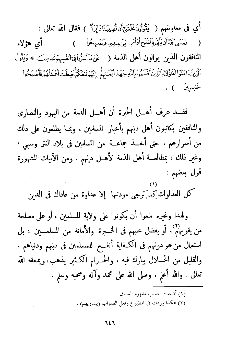 أَيْ فِي مُعَاوَنَتِهِمْ {يَقُولُونَ نَخْشَى أَنْ تُصِيبَنَا دَائِرَةٌ} فَقَالَ اللَّهُ تَعَالَى: {فَعَسَى اللَّهُ أَنْ يَأْتِيَ بِالْفَتْحِ أَوْ أَمْرٍ مِنْ عِنْدِهِ فَيُصْبِحُوا} أَيْ هَؤُلَاءِ الْمُنَافِقُونَ الَّذِينَ يُوَالُونَ أَهْلَ الذِّمَّةِ {عَلَى مَا أَسَرُّوا فِي أَنْفُسِهِمْ نَادِمِينَ} {وَيَقُولُ الَّذِينَ آمَنُوا أَهَؤُلَاءِ الَّذِينَ أَقْسَمُوا بِاللَّهِ جَهْدَ أَيْمَانِهِمْ إنَّهُمْ لَمَعَكُمْ حَبِطَتْ أَعْمَالُهُمْ فَأَصْبَحُوا خَاسِرِينَ} . فَقَدْ عَرَفَ أَهْلُ الْخِبْرَةِ أَنَّ أَهْلَ الذِّمَّةِ مِنْ الْيَهُودِ وَالنَّصَارَى وَالْمُنَافِقِينَ يُكَاتِبُونَ أَهْلَ دِينِهِمْ بِأَخْبَارِ الْمُسْلِمِينَ وَبِمَا يَطَّلِعُونَ عَلَى ذَلِكَ مِنْ أَسْرَارِهِمْ حَتَّى أُخِذَ جَمَاعَةٌ مِنْ الْمُسْلِمِينَ فِي بِلَادِ التَّتَارِ وَسَبْي وَغَيْرُ ذَلِكَ؛ بِمُطَالَعَةِ أَهْلِ الذِّمَّةِ لِأَهْلِ دِينِهِمْ. وَمِنْ الْأَبْيَاتِ الْمَشْهُورَةِ قَوْلُ بَعْضِهِمْ: