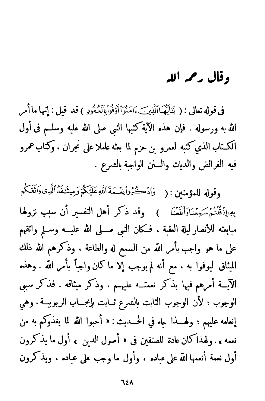 فِي قَوْله تَعَالَى {يَا أَيُّهَا الَّذِينَ آمَنُوا أَوْفُوا بِالْعُقُودِ} قَدْ قِيلَ: إنَّهَا مَا أَمَرَ اللَّهُ بِهِ وَرَسُولُهُ. فَإِنَّ هَذِهِ الْآيَةَ كَتَبَهَا النَّبِيُّ صَلَّى اللَّهُ عَلَيْهِ وَسَلَّمَ فِي أَوَّلِ الْكِتَابِ الَّذِي كَتَبَهُ لِعَمْرِو بْنِ حَزْمٍ لَمَّا بَعَثَهُ عَامِلًا عَلَى نَجْرَانَ وَكِتَابُ عَمْرٍو فِيهِ الْفَرَائِضُ وَالدِّيَاتُ وَالسُّنَنُ الْوَاجِبَةُ بِالشَّرْعِ. وَقَوْلُهُ لِلْمُؤْمِنِينَ: {وَاذْكُرُوا نِعْمَةَ اللَّهِ عَلَيْكُمْ وَمِيثَاقَهُ الَّذِي وَاثَقَكُمْ بِهِ إذْ قُلْتُمْ سَمِعْنَا وَأَطَعْنَا} وَقَدْ ذَكَرَ أَهْلُ التَّفْسِيرِ أَنَّ سَبَبَ نُزُولِهَا مُبَايَعَتُهُ لِلْأَنْصَارِ لَيْلَةَ الْعَقَبَةِ فَكَانَ النَّبِيُّ صَلَّى اللَّهُ عَلَيْهِ وَسَلَّمَ وَاثَقَهُمْ عَلَى مَا هُوَ وَاجِبٌ بِأَمْرِ اللَّهِ مِنْ السَّمْعِ لَهُ وَالطَّاعَةِ وَذَكَّرَهُمْ اللَّهُ ذَلِكَ الْمِيثَاقَ لِيُوفُوا بِهِ مَعَ أَنَّهُ لَمْ يُوجِبْ إلَّا مَا كَانَ وَاجِبًا بِأَمْرِ اللَّهِ. وَهَذِهِ الْآيَةُ أَمَرَهُمْ فِيهَا بِذِكْرِ نِعْمَتِهِ عَلَيْهِمْ وَذِكْرِ مِيثَاقِهِ. فَذَكَرَ سَبَبَيْ الْوُجُوبِ؛ لِأَنَّ الْوُجُوبَ الثَّابِتَ بِالشَّرْعِ ثَابِتٌ بِإِيجَابِ الرُّبُوبِيَّةِ وَهِيَ إنْعَامُهُ عَلَيْهِمْ؛ وَلِهَذَا جَاءَ فِي الْحَدِيثِ: {أَحِبُّوا اللَّهَ لِمَا يَغْذُوكُمْ بِهِ مِنْ نِعَمِهِ} . وَلِهَذَا كَانَ عَادَةُ الْمُصَنِّفِينَ فِي " أُصُولِ الدِّينِ " أَوَّلَ مَا يَذْكُرُونَ أَوَّلَ نِعْمَةٍ أَنْعَمَهَا اللَّهُ عَلَى عِبَادِهِ وَأَوَّلَ مَا وَجَبَ عَلَى عِبَادِهِ وَيَذْكُرُونَ