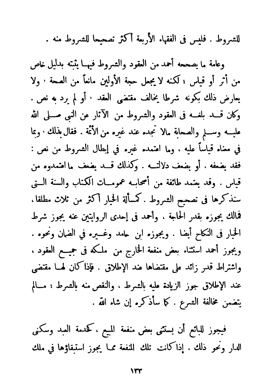 لِلشُّرُوطِ. فَلَيْسَ فِي الْفُقَهَاءِ الْأَرْبَعَةِ أَكْثَرُ تَصْحِيحًا لِلشُّرُوطِ مِنْهُ. وَعَامَّةُ مَا يُصَحِّحُهُ أَحْمَد مِنْ الْعُقُودِ وَالشُّرُوطِ فِيهَا يُثْبِتُهُ بِدَلِيلٍ خَاصٍّ مِنْ أَثَرٍ أَوْ قِيَاسٍ؛ لَكِنَّهُ لَا يَجْعَلُ حُجَّةَ الْأَوَّلِينَ مَانِعًا مِنْ الصِّحَّةِ وَلَا يُعَارِضُ ذَلِكَ بِكَوْنِهِ شَرْطًا يُخَالِفُ مُقْتَضَى الْعَقْدِ أَوْ لَمْ يَرِدْ بِهِ نَصٌّ. وَكَانَ قَدْ بَلَغَهُ فِي الْعُقُودِ وَالشُّرُوطِ مِنْ الْآثَارِ عَنْ النَّبِيِّ صَلَّى اللَّهُ عَلَيْهِ وَسَلَّمَ وَالصَّحَابَةِ مَا لَا تَجِدُهُ عِنْدَ غَيْرِهِ مِنْ الْأَئِمَّةِ. فَقَالَ بِذَلِكَ وَبِمَا فِي مَعْنَاهُ قِيَاسًا عَلَيْهِ وَمَا اعْتَمَدَهُ غَيْرُهُ فِي إبْطَالِ الشُّرُوطِ مِنْ نَصٍّ: فَقَدْ يُضْعِفُهُ أَوْ يُضْعِفُ دَلَالَتَهُ. وَكَذَلِكَ قَدْ يُضْعِفُ مَا اعْتَمَدُوهُ مِنْ قِيَاسٍ. وَقَدْ يَعْتَمِدُ طَائِفَةٌ مِنْ أَصْحَابِهِ عمومات الْكِتَابِ وَالسُّنَّةِ الَّتِي سَنَذْكُرُهَا فِي تَصْحِيحِ الشُّرُوطِ. كَمَسْأَلَةِ الْخِيَارِ أَكْثَرَ مِنْ ثَلَاثٍ مُطْلَقًا فَمَالِكٌ يُجَوِّزُهُ بِقَدْرِ الْحَاجَةِ وَأَحْمَد فِي إحْدَى الرِّوَايَتَيْنِ عَنْهُ يُجَوِّزُ شَرْطَ الْخِيَارِ فِي النِّكَاحِ أَيْضًا. وَيُجَوِّزُهُ ابْنُ حَامِدٍ وَغَيْرُهُ فِي الضَّمَانِ وَنَحْوِهِ. وَيُجَوِّزُ أَحْمَد اسْتِثْنَاءَ بَعْضِ مَنْفَعَةِ الْخَارِجِ مِنْ مِلْكِهِ فِي جَمِيعِ الْعُقُودِ وَاشْتِرَاطِ قَدْرٍ زَائِدٍ عَلَى مُقْتَضَاهَا عِنْدَ الْإِطْلَاقِ، فَإِذَا كَانَ لَهَا مُقْتَضًى عِنْدَ الْإِطْلَاقِ جَوَّزَ الزِّيَادَةَ عَلَيْهِ بِالشَّرْطِ وَالنَّقْصُ مِنْهُ بِالشَّرْطِ؛ مَا لَمْ يَتَضَمَّنْ مُخَالَفَةَ الشَّرْعِ. كَمَا سَأَذْكُرُهُ إنْ شَاءَ اللَّهُ. فَيُجَوِّزُ لِلْبَائِعِ أَنْ يَسْتَثْنِيَ بَعْضَ مَنْفَعَةِ الْمَبِيعِ كَخِدْمَةِ الْعَبْدِ وَسُكْنَى الدَّارِ وَنَحْوِ ذَلِكَ إذَا كَانَتْ تِلْكَ الْمَنْفَعَةُ مِمَّا يَجُوزُ اسْتِبْقَاؤُهَا فِي مِلْكِ