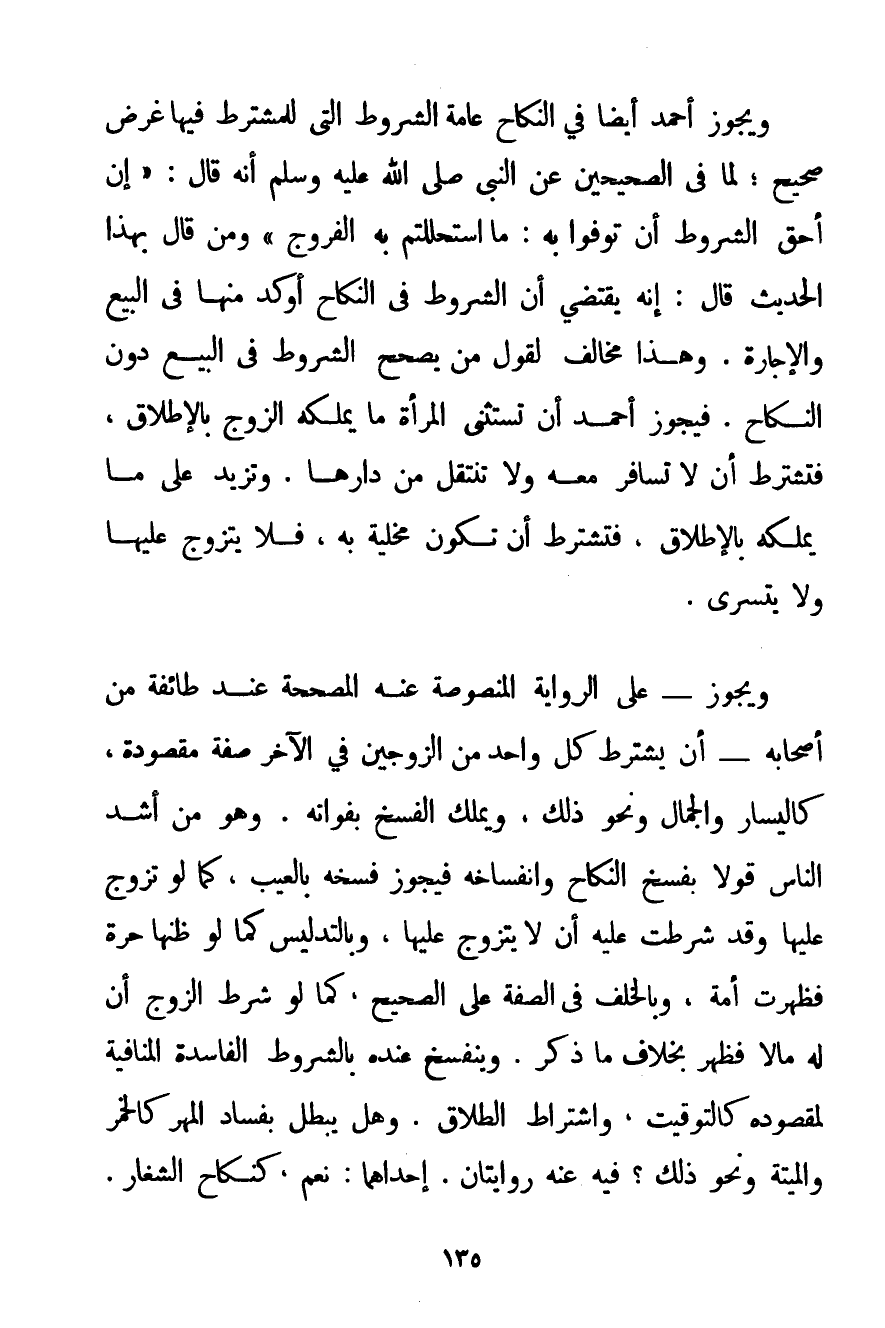 وَيُجَوِّزُ أَحْمَد أَيْضًا فِي النِّكَاحِ عَامَّةَ الشُّرُوطِ الَّتِي لِلْمُشْتَرِطِ فِيهَا غَرَضٌ صَحِيحٌ؛ لِمَا فِي الصَّحِيحَيْنِ عَنْ النَّبِيِّ صَلَّى اللَّهُ عَلَيْهِ وَسَلَّمَ أَنَّهُ قَالَ: {إنَّ أَحَقَّ الشُّرُوطِ أَنْ تُوَفُّوا بِهِ: مَا اسْتَحْلَلْتُمْ بِهِ الْفُرُوجَ} وَمَنْ قَالَ بِهَذَا الْحَدِيثِ قَالَ: إنَّهُ يَقْتَضِي أَنَّ الشُّرُوطَ فِي النِّكَاحِ أَوْكَدُ مِنْهَا فِي الْبَيْعِ وَالْإِجَارَةِ. وَهَذَا مُخَالِفٌ لِقَوْلِ مَنْ يُصَحِّحُ الشُّرُوطَ فِي الْبَيْعِ دُونَ النِّكَاحِ. فَيُجَوِّزُ أَحْمَد أَنْ تَسْتَثْنِيَ الْمَرْأَةُ مَا يَمْلِكُهُ الزَّوْجُ بِالْإِطْلَاقِ فَتَشْتَرِطُ أَنْ لَا تُسَافِرَ مَعَهُ وَلَا تَنْتَقِلَ مِنْ دَارِهَا، وَتَزِيدَ عَلَى مَا يَمْلِكُهُ بِالْإِطْلَاقِ فَتَشْتَرِطُ أَنْ تَكُونَ مُخَلِّيَةً بِهِ فَلَا يَتَزَوَّجُ عَلَيْهَا وَلَا يَتَسَرَّى. وَيُجَوِّزُ - عَلَى الرِّوَايَةِ الْمَنْصُوصَةِ عَنْهُ الْمُصَحَّحَةِ عِنْدَ طَائِفَةٍ مِنْ أَصْحَابِهِ - أَنْ يَشْتَرِطَ كُلُّ وَاحِدٍ مِنْ الزَّوْجَيْنِ فِي الْآخَرِ صِفَةً مَقْصُودَةً كَالْيَسَارِ وَالْجَمَالِ وَنَحْوِ ذَلِكَ وَيَمْلِكُ الْفَسْخَ بِفَوَاتِهِ. وَهُوَ مِنْ أَشَدِّ النَّاسِ قَوْلًا بِفَسْخِ النِّكَاحِ وَانْفِسَاخِهِ فَيَجُوزُ فَسْخُهُ بِالْعَيْبِ كَمَا لَوْ تَزَوَّجَ عَلَيْهَا وَقَدْ شَرَطَتْ عَلَيْهِ أَنْ لَا يَتَزَوَّجَ عَلَيْهَا وَبِالتَّدْلِيسِ كَمَا لَوْ ظَنَّهَا حُرَّةً فَظَهَرَتْ أَمَةً وَبِالْخَلْفِ فِي الصِّفَةِ عَلَى الصَّحِيحِ كَمَا لَوْ شَرَطَ الزَّوْجُ أَنَّ لَهُ مَالًا فَظَهَرَ بِخِلَافِ مَا ذَكَرَ. وَيَنْفَسِخُ عِنْدَهُ بِالشُّرُوطِ الْفَاسِدَةِ الْمُنَافِيَةِ لِمَقْصُودِهِ كَالتَّوْقِيتِ وَاشْتِرَاطِ الطَّلَاقِ. وَهَلْ يَبْطُلُ بِفَسَادِ الْمَهْرِ كَالْخَمْرِ وَالْمَيْتَةِ وَنَحْوِ ذَلِكَ؟ فِيهِ عَنْهُ رِوَايَتَانِ. إحْدَاهُمَا: نَعَمْ كَنِكَاحِ الشِّغَارِ.