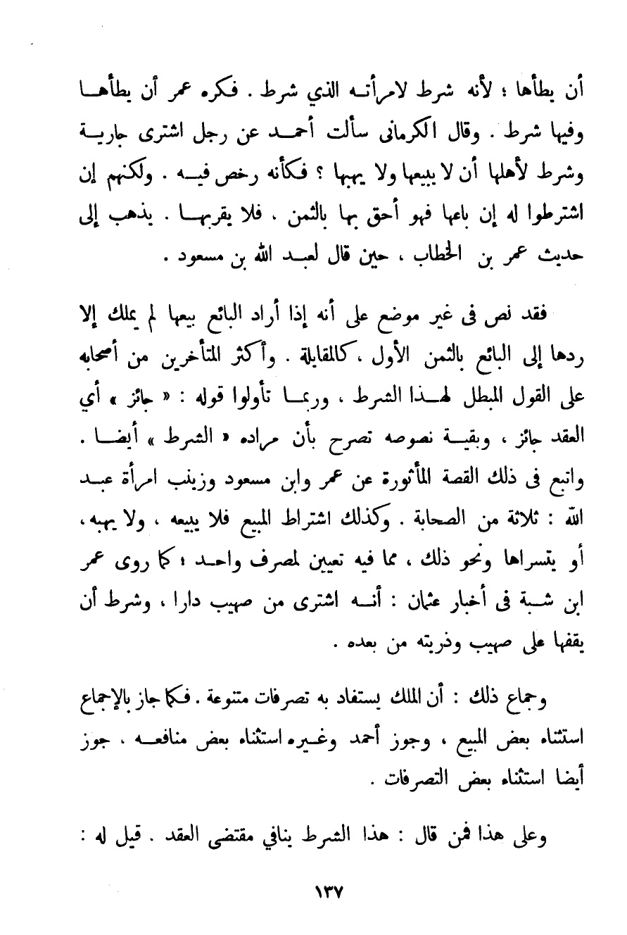 أَنْ يَطَأَهَا؛ لِأَنَّهُ شَرَطَ لِامْرَأَتِهِ الَّذِي شَرَطَ. فَكَرِهَ عُمَرُ أَنْ يَطَأَهَا وَفِيهَا شَرْطٌ. وَقَالَ الكرماني سَأَلَ أَحْمَد عَنْ رَجُلٍ اشْتَرَى جَارِيَةً وَشَرَطَ لِأَهْلِهَا أَنْ لَا يَبِيعَهَا وَلَا يَهَبَهَا؟ فَكَأَنَّهُ رَخَّصَ فِيهِ. وَلَكِنَّهُمْ إنْ اشْتَرَطُوا لَهُ إنْ بَاعَهَا فَهُوَ أَحَقُّ بِهَا بِالثَّمَنِ؟ فَلَا يَقْرَبُهَا. يَذْهَبُ إلَى حَدِيثِ عُمَرَ بْنِ الْخَطَّابِ حِينَ قَالَ لِعَبْدِ اللَّهِ بْنِ مَسْعُودٍ. فَقَدْ نَصَّ فِي غَيْرِ مَوْضِعٍ عَلَى أَنَّهُ إذَا أَرَادَ الْبَائِعُ بَيْعَهَا لَمْ يَمْلِكْ إلَّا رَدَّهَا إلَى الْبَائِعِ بِالثَّمَنِ الْأَوَّلِ كَالْمُقَايَلَةِ. وَأَكْثَرُ الْمُتَأَخِّرِينَ مِنْ أَصْحَابِهِ عَلَى الْقَوْلِ الْمُبْطِلِ لِهَذَا الشَّرْطِ وَرُبَّمَا تَأَوَّلُوا قَوْلَهُ: " جَائِزٌ " أَيْ الْعَقْدُ جَائِزٌ وَبَقِيَّةُ نُصُوصِهِ تُصَرِّحُ بِأَنَّ مُرَادَهُ " الشَّرْطُ " أَيْضًا. وَاتَّبَعَ فِي ذَلِكَ الْقِصَّةَ الْمَأْثُورَةَ عَنْ عُمَرَ وَابْنِ مَسْعُودٍ وَزَيْنَبَ امْرَأَةِ عَبْدِ اللَّهِ: ثَلَاثَةٌ مِنْ الصَّحَابَةِ. وَكَذَلِكَ اشْتِرَاطُ الْمَبِيعِ فَلَا يَبِيعُهُ وَلَا يَهَبُهُ أَوْ يَتَسَرَّاهَا وَنَحْوُ ذَلِكَ مِمَّا فِيهِ تَعْيِينٌ لِمَصْرِفٍ وَاحِدٍ كَمَا رَوَى عُمَرُ بْنُ شَبَّةَ فِي أَخْبَارِ عُثْمَانَ: أَنَّهُ اشْتَرَى مِنْ صهيب دَارًا وَشَرَطَ أَنْ يَقِفَهَا عَلَى صهيب وَذُرِّيَّتِهِ مِنْ بَعْدِهِ. وَجِمَاعُ ذَلِكَ: أَنَّ الْمِلْكَ يُسْتَفَادُ بِهِ تَصَرُّفَاتٌ مُتَنَوِّعَةٌ. فَكَمَا جَازَ بِالْإِجْمَاعِ اسْتِثْنَاءُ بَعْضِ الْمَبِيعِ وَجَوَّزَ أَحْمَد وَغَيْرُهُ اسْتِثْنَاءَ بَعْضِ مَنَافِعِهِ جَوَّزَ أَيْضًا اسْتِثْنَاءَ بَعْضِ التَّصَرُّفَاتِ. وَعَلَى هَذَا فَمَنْ قَالَ: هَذَا الشَّرْطُ يُنَافِي مُقْتَضَى الْعَقْدِ. قِيلَ لَهُ: