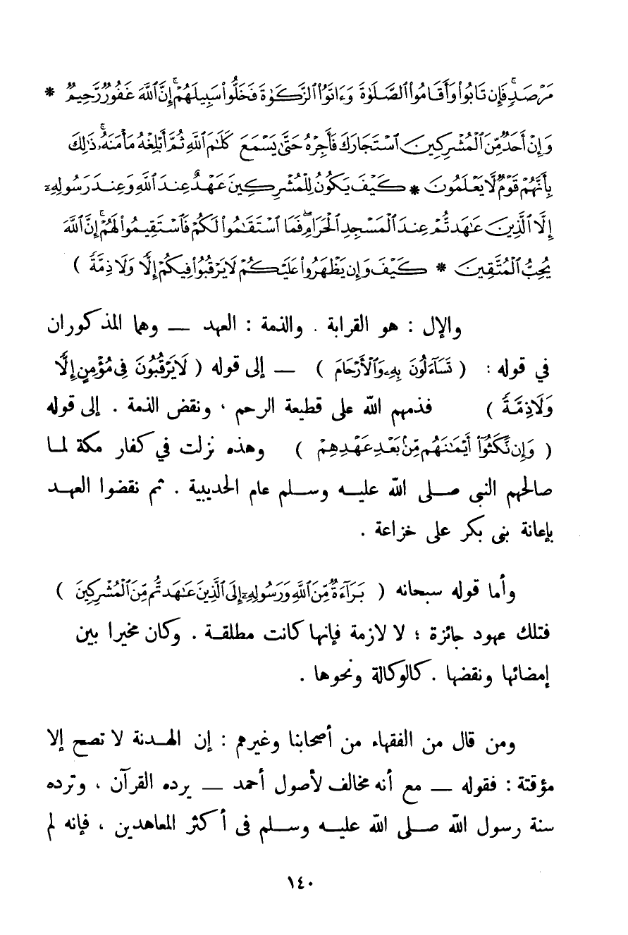 وَخُذُوهُمْ وَاحْصُرُوهُمْ وَاقْعُدُوا لَهُمْ كُلَّ مَرْصَدٍ فَإِنْ تَابُوا وَأَقَامُوا الصَّلَاةَ وَآتَوُا الزَّكَاةَ فَخَلُّوا سَبِيلَهُمْ إنَّ اللَّهَ غَفُورٌ رَحِيمٌ} {وَإِنْ أَحَدٌ مِنَ الْمُشْرِكِينَ اسْتَجَارَكَ فَأَجِرْهُ حَتَّى يَسْمَعَ كَلَامَ اللَّهِ ثُمَّ أَبْلِغْهُ مَأْمَنَهُ ذَلِكَ بِأَنَّهُمْ قَوْمٌ لَا يَعْلَمُونَ} {كَيْفَ يَكُونُ لِلْمُشْرِكِينَ عَهْدٌ عِنْدَ اللَّهِ وَعِنْدَ رَسُولِهِ إلَّا الَّذِينَ عَاهَدْتُمْ عِنْدَ الْمَسْجِدِ الْحَرَامِ فَمَا اسْتَقَامُوا لَكُمْ فَاسْتَقِيمُوا لَهُمْ إنَّ اللَّهَ يُحِبُّ الْمُتَّقِينَ} {كَيْفَ وَإِنْ يَظْهَرُوا عَلَيْكُمْ لَا يَرْقُبُوا فِيكُمْ إلًّا وَلَا ذِمَّةً} وَالْإِلُّ: هُوَ الْقَرَابَةُ. وَالذِّمَّةُ: الْعَهْدُ - وَهُمَا الْمَذْكُورَانِ فِي قَوْلِهِ: {تَسَاءَلُونَ بِهِ وَالْأَرْحَامَ} - إلَى قَوْلِهِ {لَا يَرْقُبُونَ فِي مُؤْمِنٍ إلًّا وَلَا ذِمَّةً} فَذَمَّهُمْ اللَّهُ عَلَى قَطِيعَةِ الرَّحِمِ وَنَقْضِ الذِّمَّةِ. إلَى قَوْلِهِ {وَإِنْ نَكَثُوا أَيْمَانَهُمْ مِنْ بَعْدِ عَهْدِهِمْ} وَهَذِهِ نَزَلَتْ فِي كُفَّارِ مَكَّةَ لَمَّا صَالَحَهُمْ النَّبِيُّ صَلَّى اللَّهُ عَلَيْهِ وَسَلَّمَ عَامَ الْحُدَيْبِيَةِ. ثُمَّ نَقَضُوا الْعَهْدَ بِإِعَانَةِ بَنِي بَكْرٍ عَلَى خُزَاعَةَ. وَأَمَّا قَوْلُهُ سُبْحَانَهُ {بَرَاءَةٌ مِنَ اللَّهِ وَرَسُولِهِ إلَى الَّذِينَ عَاهَدْتُمْ مِنَ الْمُشْرِكِينَ} فَتِلْكَ عُهُودٌ جَائِزَةٌ؛ لَا لَازِمَةٌ فَإِنَّهَا كَانَتْ مُطْلَقَةً. وَكَانَ مُخَيَّرًا بَيْنَ إمْضَائِهَا وَنَقْضِهَا. كَالْوِكَالَةِ وَنَحْوِهَا. وَمَنْ قَالَ مِنْ الْفُقَهَاءِ مِنْ أَصْحَابِنَا وَغَيْرِهِمْ: إنَّ الْهُدْنَةَ لَا تَصِحُّ إلَّا مُؤَقَّتَةً: فَقَوْلُهُ - مَعَ أَنَّهُ مُخَالِفٌ لِأُصُولِ أَحْمَد - يَرُدُّهُ الْقُرْآنُ وَتَرُدُّهُ سُنَّةُ رَسُولِ اللَّهِ صَلَّى اللَّهُ عَلَيْهِ وَسَلَّمَ فِي أَكْثَرِ الْمُعَاهَدِينَ فَإِنَّهُ لَمْ