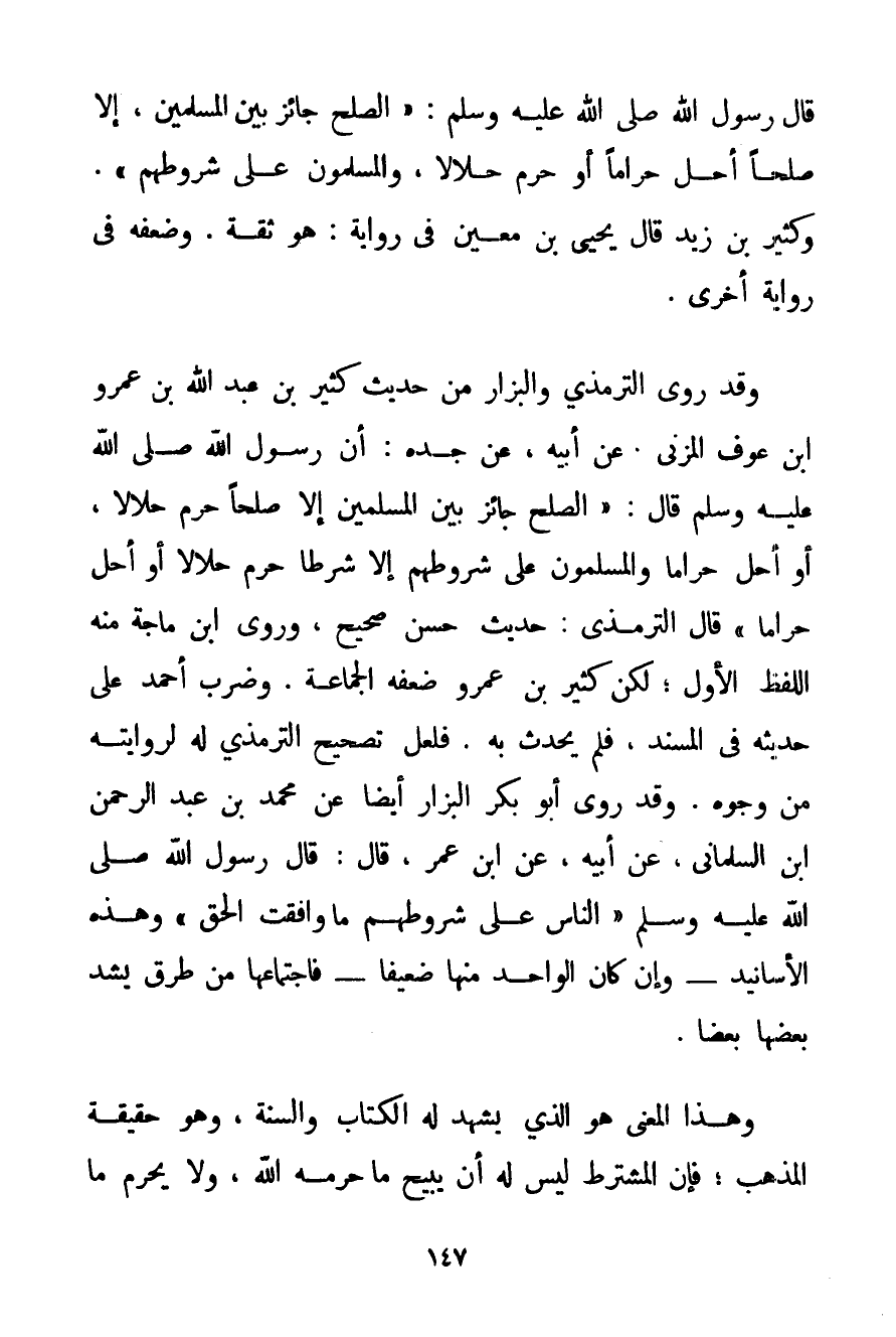 قَالَ رَسُولُ اللَّهِ صَلَّى اللَّهُ عَلَيْهِ وَسَلَّمَ {الصُّلْحُ جَائِزٌ بَيْنَ الْمُسْلِمِينَ إلَّا صُلْحًا أَحَلَّ حَرَامًا أَوْ حَرَّمَ حَلَالًا وَالْمُسْلِمُونَ عَلَى شُرُوطِهِمْ} . وَكَثِيرُ بْنُ زَيْدٍ قَالَ يَحْيَى بْنُ مَعِينٍ فِي رِوَايَةٍ: هُوَ ثِقَةٌ. وَضَعَّفَهُ فِي رِوَايَةٍ أُخْرَى. وَقَدْ رَوَى التِّرْمِذِيُّ وَالْبَزَّارُ مِنْ حَدِيثِ كَثِيرِ بْنِ عَبْدِ اللَّهِ بْنِ عَمْرِو بْنِ عَوْفٍ المزني عَنْ أَبِيهِ عَنْ جَدِّهِ: أَنَّ رَسُولَ اللَّهِ صَلَّى اللَّهُ عَلَيْهِ وَسَلَّمَ قَالَ: {الصُّلْحُ جَائِزُ بَيْنَ الْمُسْلِمِينَ إلَّا صُلْحًا حَرَّمَ حَلَالًا أَوْ أَحَلَّ حَرَامًا وَالْمُسْلِمُونَ عَلَى شُرُوطِهِمْ إلَّا شَرْطًا حَرَّمَ حَلَالًا أَوْ أَحَلَّ حَرَامًا} " قَالَ التِّرْمِذِيُّ: حَدِيثٌ حَسَنٌ صَحِيحٌ وَرَوَى ابْنُ مَاجَه مِنْهُ اللَّفْظَ الْأَوَّلَ؛ لَكِنَّ كَثِيرَ بْنَ عَمْرٍو ضَعَّفَهُ الْجَمَاعَةُ. وَضَرَبَ أَحْمَد عَلَى حَدِيثِهِ فِي الْمُسْنَدِ؛ فَلَمْ يُحَدِّثْ بِهِ. فَلَعَلَّ تَصْحِيحَ التِّرْمِذِيِّ لَهُ لِرِوَايَتِهِ مِنْ وُجُوهٍ. وَقَدْ رَوَى أَبُو بَكْرٍ الْبَزَّارُ أَيْضًا عَنْ مُحَمَّدِ بْنِ عَبْدِ الرَّحْمَنِ بْنِ البيلماني عَنْ أَبِيهِ عَنْ ابْنِ عُمَرَ قَالَ: قَالَ رَسُولُ اللَّهِ صَلَّى اللَّهُ عَلَيْهِ وَسَلَّمَ {النَّاسُ عَلَى شُرُوطِهِمْ مَا وَافَقَتْ الْحَقَّ} وَهَذِهِ الْأَسَانِيدُ - وَإِنْ كَانَ الْوَاحِدُ مِنْهَا ضَعِيفًا - فَاجْتِمَاعُهَا مِنْ طُرُقٍ يَشُدُّ بَعْضُهَا بَعْضًا. وَهَذَا الْمَعْنَى هُوَ الَّذِي يَشْهَدُ لَهُ الْكِتَابُ وَالسُّنَّةُ وَهُوَ حَقِيقَةُ الْمَذْهَبِ؛ فَإِنَّ الْمُشْتَرِطَ لَيْسَ لَهُ أَنْ يُبِيحَ مَا حَرَّمَهُ اللَّهُ وَلَا يُحَرِّمَ مَا