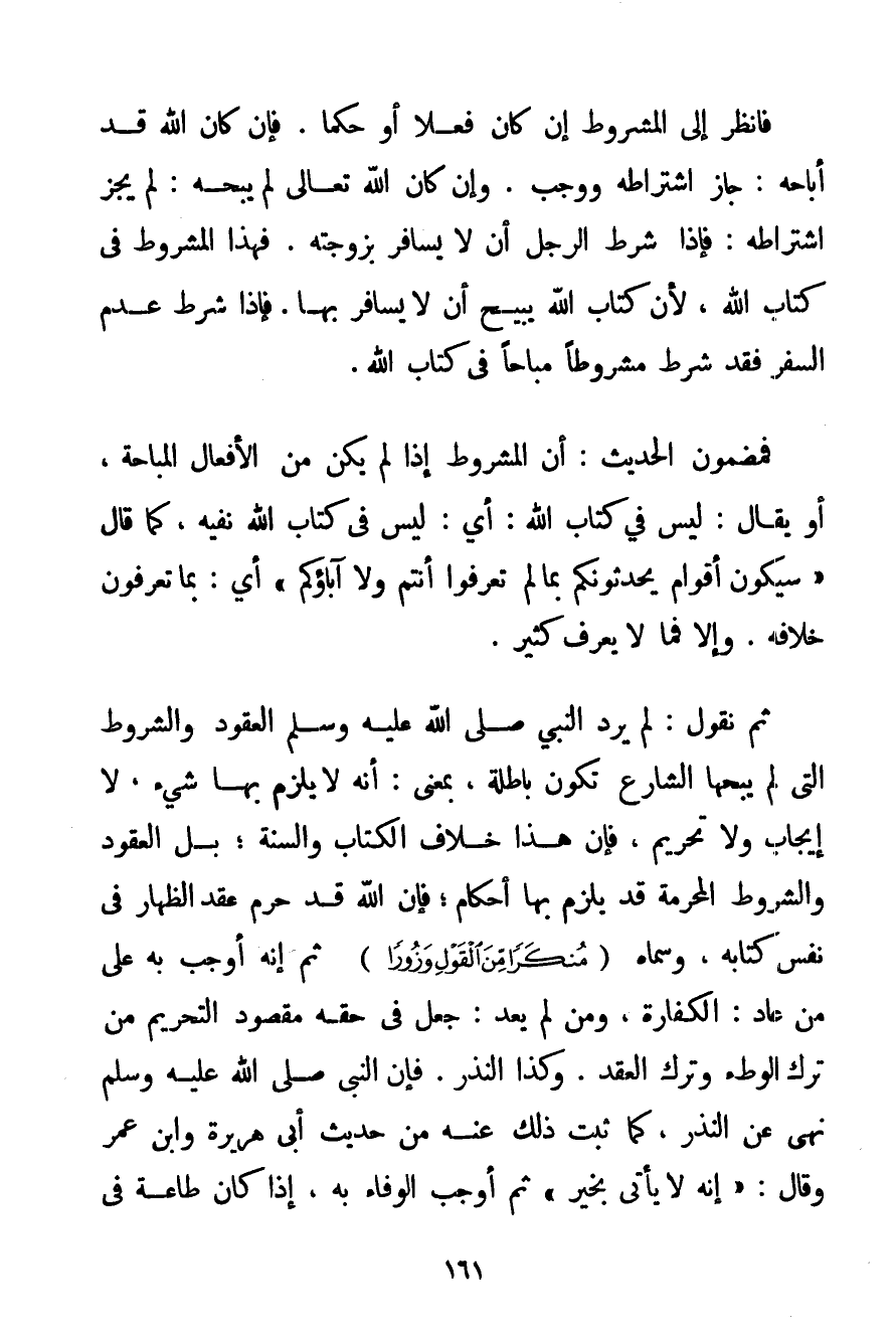 فَانْظُرْ إلَى الْمَشْرُوطِ إنْ كَانَ فِعْلًا أَوْ حُكْمًا. فَإِنْ كَانَ اللَّهُ قَدْ أَبَاحَهُ: جَازَ اشْتِرَاطُهُ وَوَجَبَ. وَإِنْ كَانَ اللَّهُ تَعَالَى لَمْ يُبِحْهُ: لَمْ يَجُزْ اشْتِرَاطُهُ: فَإِذَا شَرَطَ الرَّجُلُ أَنْ لَا يُسَافِرَ بِزَوْجَتِهِ. فَهَذَا الْمَشْرُوطُ فِي كِتَابِ اللَّهِ لِأَنَّ كِتَابَ اللَّهِ يُبِيحُ أَنْ لَا يُسَافِرَ بِهَا. فَإِذَا شَرَطَ عَدَمَ السَّفَرِ فَقَدْ شَرَطَ مَشْرُوطًا مُبَاحًا فِي كِتَابِ اللَّهِ. فَمَضْمُونُ الْحَدِيثِ: أَنَّ الْمَشْرُوطَ إذَا لَمْ يَكُنْ مِنْ الْأَفْعَالِ الْمُبَاحَةِ أَوْ يُقَالُ: لَيْسَ فِي كِتَابِ اللَّهِ: أَيْ: لَيْسَ فِي كِتَابِ اللَّهِ نَفْيُهُ كَمَا قَالَ {سَيَكُونُ أَقْوَامٌ يُحَدِّثُونَكُمْ بِمَا لَمْ تَعْرِفُوا أَنْتُمْ وَلَا آبَاؤُكُمْ} أَيْ: بِمَا تَعْرِفُونَ خِلَافَهُ. وَإِلَّا فَمَا لَا يُعْرَفُ كَثِيرٌ. ثُمَّ نَقُولُ: لَمْ يُرِدْ النَّبِيُّ صَلَّى اللَّهُ عَلَيْهِ وَسَلَّمَ الْعُقُودَ وَالشُّرُوطَ الَّتِي لَمْ يُبِحْهَا الشَّارِعُ تَكُونُ بَاطِلَةً بِمَعْنَى: أَنَّهُ لَا يَلْزَمُ بِهَا شَيْءٌ لَا إيجَابٌ وَلَا تَحْرِيمٌ فَإِنَّ هَذَا خِلَافُ الْكِتَابِ وَالسُّنَّةِ. بَلْ الْعُقُودُ وَالشُّرُوطُ الْمُحَرَّمَةُ قَدْ يَلْزَمُ بِهَا أَحْكَامٌ؛ فَإِنَّ اللَّهَ قَدْ حَرَّمَ عَقْدَ الظِّهَارِ فِي نَفْسِ كِتَابِهِ وَسَمَّاهُ مُنْكَرًا مِنْ الْقَوْلِ وَزُورًا ثُمَّ إنَّهُ أَوْجَبَ بِهِ عَلَى مَنْ عَادَ: الْكَفَّارَةَ وَمَنْ لَمْ يَعُدْ: جَعَلَ فِي حَقِّهِ مَقْصُودَ التَّحْرِيمِ مِنْ تَرْكِ الْوَطْءِ وَتَرْكِ الْعَقْدِ. وَكَذَا النَّذْرُ. فَإِنَّ النَّبِيَّ صَلَّى اللَّهُ عَلَيْهِ وَسَلَّمَ نَهَى عَنْ النَّذْرِ كَمَا ثَبَتَ ذَلِكَ عَنْهُ مِنْ حَدِيثِ أَبِي هُرَيْرَةَ وَابْنِ عُمَرَ وَقَالَ: {إنَّهُ لَا يَأْتِي بِخَيْرِ} ثُمَّ أَوْجَبَ الْوَفَاءَ بِهِ إذَا كَانَ طَاعَةً فِي