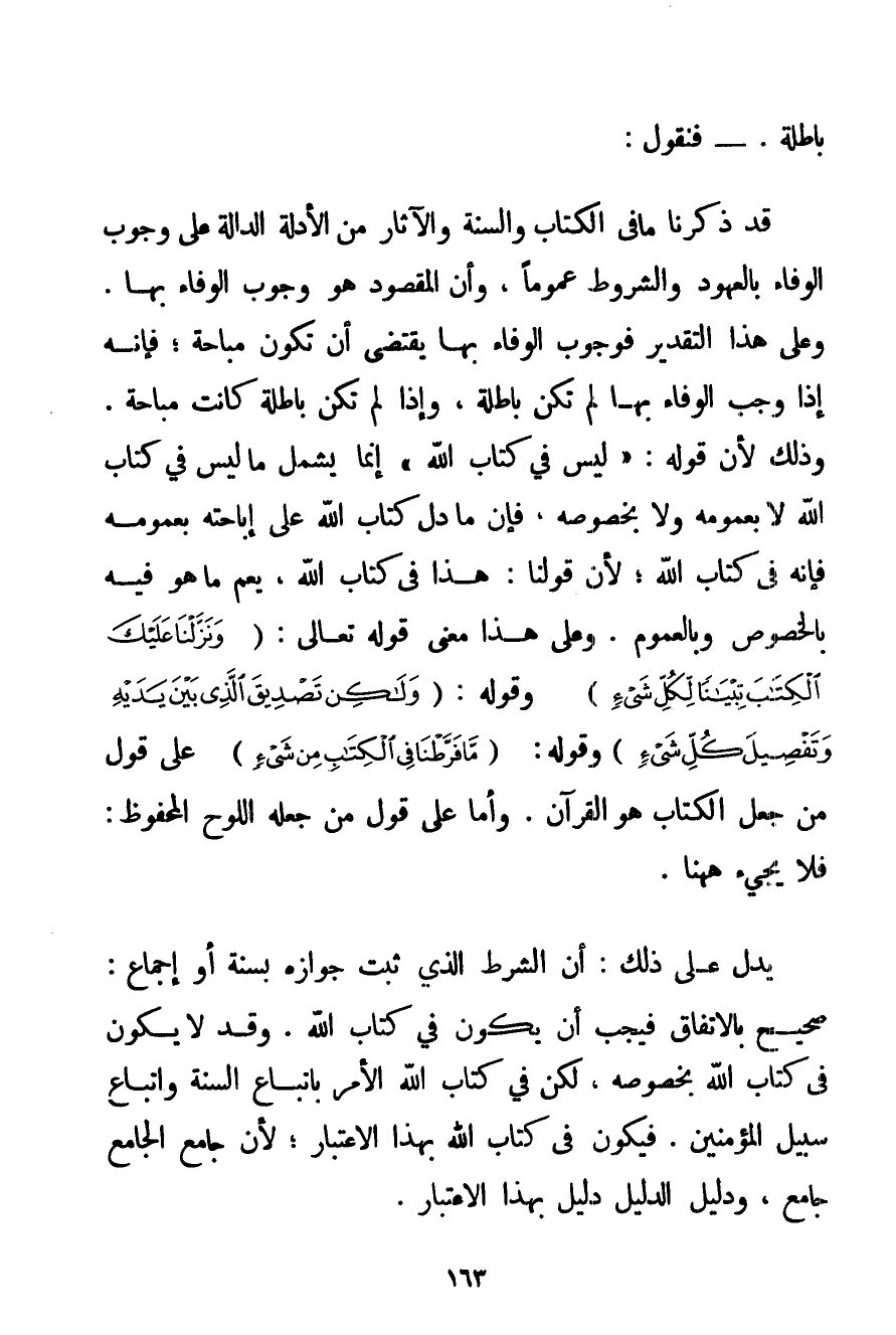 بَاطِلَةٌ. - فَنَقُولُ: قَدْ ذَكَرْنَا مَا فِي الْكِتَابِ وَالسُّنَّةِ وَالْآثَارِ مِنْ الْأَدِلَّةِ الدَّالَّةِ عَلَى وُجُوبِ الْوَفَاءِ بِالْعُهُودِ وَالشُّرُوطِ عُمُومًا وَأَنَّ الْمَقْصُودَ هُوَ وُجُوبُ الْوَفَاءِ بِهَا. وَعَلَى هَذَا التَّقْدِيرِ فَوُجُوبُ الْوَفَاءِ بِهَا يَقْتَضِي أَنْ تَكُونَ مُبَاحَةً؛ فَإِنَّهُ إذَا وَجَبَ الْوَفَاءُ بِهَا لَمْ تَكُنْ بَاطِلَةً وَإِذَا لَمْ تَكُنْ بَاطِلَةً كَانَتْ مُبَاحَةً. وَذَلِكَ لِأَنَّ قَوْلَهُ: {لَيْسَ فِي كِتَابِ اللَّهِ} " إنَّمَا يَشْمَلُ مَا لَيْسَ فِي كِتَابِ اللَّهِ لَا بِعُمُومِهِ وَلَا بِخُصُوصِهِ فَإِنَّ مَا دَلَّ كِتَابُ اللَّهِ عَلَى إبَاحَتِهِ بِعُمُومِهِ فَإِنَّهُ فِي كِتَابِ اللَّهِ؛ لِأَنَّ قَوْلَنَا: هَذَا فِي كِتَابِ اللَّهِ يَعُمُّ مَا هُوَ فِيهِ بِالْخُصُوصِ وَبِالْعُمُومِ. وَعَلَى هَذَا مَعْنَى قَوْله تَعَالَى {وَنَزَّلْنَا عَلَيْكَ الْكِتَابَ تِبْيَانًا لِكُلِّ شَيْءٍ} وَقَوْلِهِ: {وَلَكِنْ تَصْدِيقَ الَّذِي بَيْنَ يَدَيْهِ وَتَفْصِيلَ كُلِّ شَيْءٍ} وَقَوْلِهِ: {مَا فَرَّطْنَا فِي الْكِتَابِ مِنْ شَيْءٍ} عَلَى قَوْلِ مَنْ جَعَلَ الْكِتَابَ هُوَ الْقُرْآنَ. وَأَمَّا عَلَى قَوْلِ مَنْ جَعَلَهُ اللَّوْحَ الْمَحْفُوظَ: فَلَا يَجِيءُ هَهُنَا. يَدُلُّ عَلَى ذَلِكَ: أَنَّ الشَّرْطَ الَّذِي ثَبَتَ جَوَازُهُ بِسُنَّةٍ أَوْ إجْمَاعٍ: صَحِيحٌ بِالِاتِّفَاقِ فَيَجِبُ أَنْ يَكُونَ فِي كِتَابِ اللَّهِ. وَقَدْ لَا يَكُونُ فِي كِتَابِ اللَّهِ بِخُصُوصِهِ لَكِنْ فِي كِتَابِ اللَّهِ الْأَمْرُ بِاتِّبَاعِ السُّنَّةِ وَاتِّبَاعِ سَبِيلِ الْمُؤْمِنِينَ. فَيَكُونُ فِي كِتَابِ اللَّهِ بِهَذَا الِاعْتِبَارِ. لِأَنَّ جَامِعَ الْجَامِعِ جَامِعٌ وَدَلِيلَ الدَّلِيلِ دَلِيلٌ بِهَذَا الِاعْتِبَارِ.