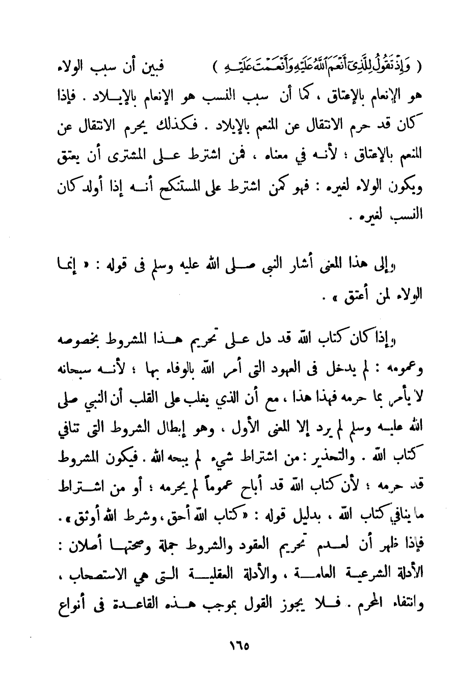{وَإِذْ تَقُولُ لِلَّذِي أَنْعَمَ اللَّهُ عَلَيْهِ وَأَنْعَمْتَ عَلَيْهِ} فَبَيَّنَ أَنَّ سَبَبَ الْوَلَاءِ هُوَ الْإِنْعَامُ بِالْإِعْتَاقِ كَمَا أَنَّ سَبَبَ النَّسَبِ هُوَ الْإِنْعَامُ بِالْإِيلَادِ. فَإِذَا كَانَ قَدْ حَرَّمَ الِانْتِقَالَ عَنْ الْمُنْعِمِ بِالْإِيلَادِ. فَكَذَلِكَ يَحْرُمُ الِانْتِقَالُ عَنْ الْمُنْعِمِ بِالْإِعْتَاقِ؛ لِأَنَّهُ فِي مَعْنَاهُ فَمَنْ اشْتَرَطَ عَلَى الْمُشْتَرِي أَنْ يُعْتِقَ وَيَكُونُ الْوَلَاءُ لِغَيْرِهِ: فَهُوَ كَمَنْ اشْتَرَطَ عَلَى الْمُسْتَنْكِحِ أَنَّهُ إذَا أَوْلَدَ كَانَ النَّسَبُ لِغَيْرِهِ. وَإِلَى هَذَا الْمَعْنَى أَشَارَ النَّبِيُّ صَلَّى اللَّهُ عَلَيْهِ وَسَلَّمَ فِي قَوْلِهِ: {إنَّمَا الْوَلَاءُ لِمَنْ أَعْتَقَ} . وَإِذَا كَانَ كِتَابُ اللَّهِ قَدْ دَلَّ عَلَى تَحْرِيمِ هَذَا الْمَشْرُوطِ بِخُصُوصِهِ وَعُمُومِهِ: لَمْ يَدْخُلْ فِي الْعُهُودِ الَّتِي أَمَرَ اللَّهُ بِالْوَفَاءِ بِهَا؛ لِأَنَّهُ سُبْحَانَهُ لَا يَأْمُرُ بِمَا حَرَّمَهُ فَهَذَا هَذَا مَعَ أَنَّ الَّذِي يَغْلِبُ عَلَى الْقَلْبِ أَنَّ النَّبِيَّ صَلَّى اللَّهُ عَلَيْهِ وَسَلَّمَ لَمْ يُرِدْ إلَّا الْمَعْنَى الْأَوَّلَ وَهُوَ إبْطَالُ الشُّرُوطِ الَّتِي تُنَافِي كِتَابَ اللَّهِ. وَالتَّحْذِيرُ: مِنْ اشْتِرَاطِ شَيْءٍ لَمْ يُبِحْهُ اللَّهُ. فَيَكُونُ الْمَشْرُوطُ قَدْ حَرَّمَهُ؛ لِأَنَّ كِتَابَ اللَّهِ قَدْ أَبَاحَ عُمُومًا لَمْ يُحَرِّمْهُ؛ أَوْ مِنْ اشْتِرَاطِ مَا يُنَافِي كِتَابَ اللَّهِ بِدَلِيلِ قَوْلِهِ: {كِتَابُ اللَّهِ أَحَقُّ وَشَرْطُ اللَّهِ أَوْثَقُ.}