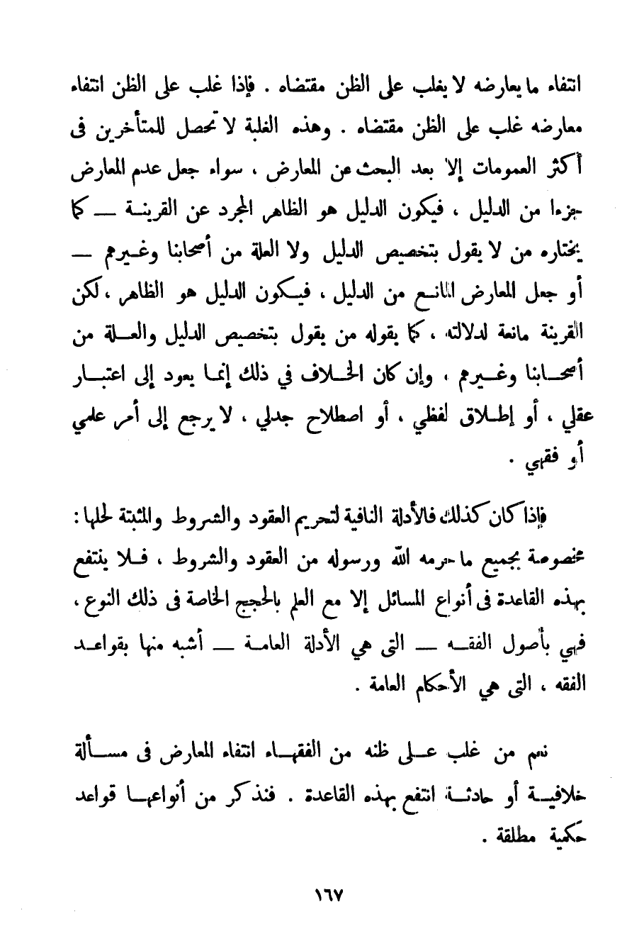انْتِفَاءُ مَا يُعَارِضُهُ لَا يَغْلِبُ عَلَى الظَّنِّ مُقْتَضَاهُ. فَإِذَا غَلَبَ عَلَى الظَّنِّ انْتِفَاءُ مُعَارِضِهِ غَلَبَ عَلَى الظَّنِّ مُقْتَضَاهُ. وَهَذِهِ الْغَلَبَةُ لَا تَحْصُلُ لِلْمُتَأَخِّرِينَ فِي أَكْثَرِ العمومات إلَّا بَعْدَ الْبَحْثِ عَنْ الْمُعَارِضِ سَوَاءٌ جَعَلَ عَدَمَ الْمُعَارِضِ جُزْءًا مِنْ الدَّلِيلِ فَيَكُونُ الدَّلِيلُ هُوَ الظَّاهِرَ الْمُجَرَّدَ عَنْ الْقَرِينَةِ - كَمَا يَخْتَارُهُ مَنْ لَا يَقُولُ بِتَخْصِيصِ الدَّلِيلِ وَلَا الْعِلَّةِ مِنْ أَصْحَابِنَا وَغَيْرِهِمْ - أَوْ جَعَلَ الْمُعَارِضَ الْمَانِعَ مِنْ الدَّلِيلِ فَيَكُونُ الدَّلِيلُ هُوَ الظَّاهِرَ لَكِنَّ الْقَرِينَةَ مَانِعَةٌ لِدَلَالَتِهِ كَمَا يَقُولُهُ مَنْ يَقُولُ بِتَخْصِيصِ الدَّلِيلِ وَالْعِلَّةِ مِنْ أَصْحَابِنَا وَغَيْرِهِمْ وَإِنْ كَانَ الْخِلَافُ فِي ذَلِكَ إنَّمَا يَعُودُ إلَى اعْتِبَارٍ عَقْلِيٍّ أَوْ إطْلَاقٍ لَفْظِيٍّ أَوْ اصْطِلَاحٍ جَدَلِيٍّ لَا يَرْجِعُ إلَى أَمْرٍ عِلْمِيٍّ أَوْ فِقْهِيٍّ. فَإِذَا كَانَ كَذَلِكَ فَالْأَدِلَّةُ النَّافِيَةُ لِتَحْرِيمِ الْعُقُودِ وَالشُّرُوطِ وَالْمُثْبِتَةِ لِحِلِّهَا: مَخْصُوصَةٌ بِجَمِيعِ مَا حَرَّمَهُ اللَّهُ وَرَسُولُهُ مِنْ الْعُقُودِ وَالشُّرُوطِ فَلَا يُنْتَفَعُ بِهَذِهِ الْقَاعِدَةِ فِي أَنْوَاعِ الْمَسَائِلِ إلَّا مَعَ الْعِلْمِ بِالْحُجَجِ الْخَاصَّةِ فِي ذَلِكَ النَّوْعِ فَهِيَ بِأُصُولِ الْفِقْهِ - الَّتِي هِيَ الْأَدِلَّةُ الْعَامَّةُ - أَشْبَهُ مِنْهَا بِقَوَاعِدِ الْفِقْهِ الَّتِي هِيَ الْأَحْكَامُ الْعَامَّةُ. نَعَمْ مَنْ غَلَبَ عَلَى ظَنِّهِ مِنْ الْفُقَهَاءِ انْتِفَاءُ الْمُعَارِضِ فِي مَسْأَلَةٍ خِلَافِيَّةٍ أَوْ حَادِثَةٍ انْتَفَعَ بِهَذِهِ الْقَاعِدَةِ. فَنَذْكُرُ مِنْ أَنْوَاعِهَا قَوَاعِدَ حُكْمِيَّةً مُطْلَقَةً.