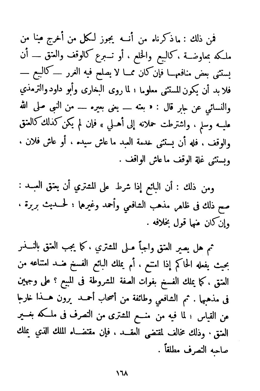 فَمِنْ ذَلِكَ: مَا ذَكَرْنَاهُ مِنْ أَنَّهُ يَجُوزُ لِكُلِّ مَنْ أَخْرَجَ عَيْنًا مِنْ مِلْكِهِ بِمُعَاوَضَةٍ كَالْبَيْعِ وَالْخُلْعِ أَوْ تَبَرُّعٍ كَالْوَقْفِ وَالْعِتْقِ - أَنْ يَسْتَثْنِيَ بَعْضَ مَنَافِعِهَا فَإِنْ كَانَ مِمَّا لَا يَصْلُحُ فِيهِ الْغَرَرُ - كَالْبَيْعِ - فَلَا بُدَّ أَنْ يَكُونَ الْمُسْتَثْنَى مَعْلُومًا؛ لِمَا رَوَى الْبُخَارِيُّ وَأَبُو دَاوُد وَالتِّرْمِذِي وَالنَّسَائِي عَنْ جَابِرٍ قَالَ: {بِعْته - يَعْنِي بَعِيرَهُ - مِنْ النَّبِيِّ صَلَّى اللَّهُ عَلَيْهِ وَسَلَّمَ وَاشْتَرَطْت حُمْلَانَهُ إلَى أَهْلِي} " فَإِنْ لَمْ يَكُنْ كَذَلِكَ كَالْعِتْقِ وَالْوَقْفِ فَلَهُ أَنْ يَسْتَثْنِيَ خِدْمَةَ الْعَبْدِ مَا عَاشَ سَيِّدُهُ أَوْ عَاشَ فُلَانٌ وَيَسْتَثْنِيَ غَلَّةَ الْوَقْفِ مَا عَاشَ الْوَاقِفُ. وَمِنْ ذَلِكَ: أَنَّ الْبَائِعَ إذَا شَرَطَ عَلَى الْمُشْتَرِي أَنْ يُعْتِقَ الْعَبْدَ: صَحَّ ذَلِكَ فِي ظَاهِرِ مَذْهَبِ الشَّافِعِيِّ وَأَحْمَد وَغَيْرِهِمَا؛ لِحَدِيثِ بَرِيرَةَ وَإِنْ كَانَ عَنْهُمَا قَوْلٌ بِخِلَافِهِ. ثُمَّ هَلْ يَصِيرُ الْعِتْقُ وَاجِبًا عَلَى الْمُشْتَرِي كَمَا يَجِبُ الْعِتْقُ بِالنَّذْرِ بِحَيْثُ يَفْعَلُهُ الْحَاكِمُ إذَا امْتَنَعَ أَمْ يَمْلِكُ الْبَائِعُ الْفَسْخَ عِنْدَ امْتِنَاعِهِ مِنْ الْعِتْقِ كَمَا يَمْلِكُ الْفَسْخَ بِفَوَاتِ الصِّفَةِ الْمَشْرُوطَةِ فِي الْمَبِيعِ؟ عَلَى وَجْهَيْنِ فِي مَذْهَبِهِمَا. ثُمَّ الشَّافِعِيُّ وَطَائِفَةٌ مِنْ أَصْحَابِ أَحْمَد يَرَوْنَ هَذَا خَارِجًا عَنْ الْقِيَاسِ؛ لِمَا فِيهِ مِنْ مَنْعِ الْمُشْتَرِي مِنْ التَّصَرُّفِ فِي مِلْكِهِ بِغَيْرِ الْعِتْقِ وَذَلِكَ مُخَالِفٌ لِمُقْتَضَى الْعَقْدِ فَإِنَّ مُقْتَضَاهُ الْمِلْكُ الَّذِي يَمْلِكُ صَاحِبُهُ التَّصَرُّفَ مُطْلَقًا.