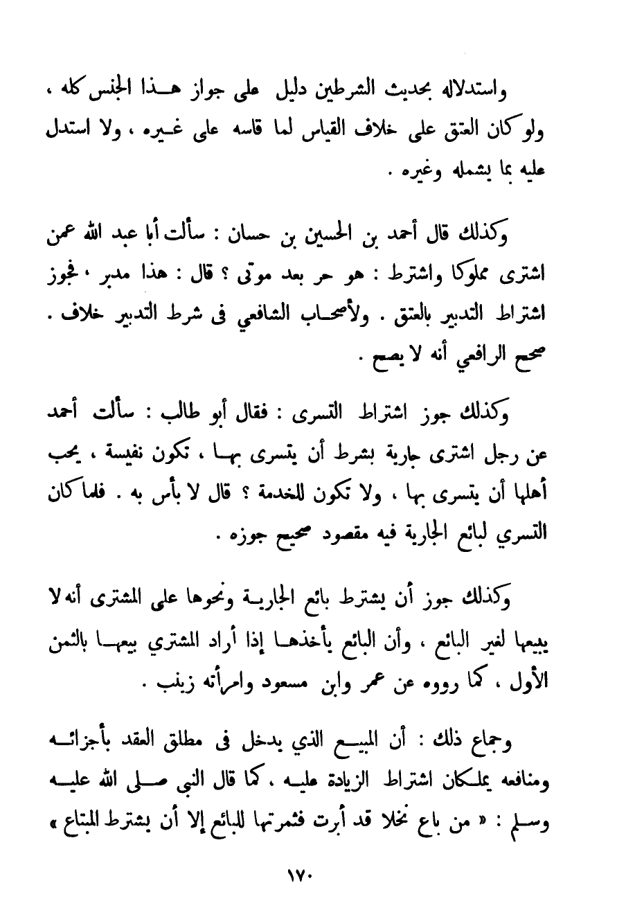 وَاسْتِدْلَالُهُ بِحَدِيثِ الشَّرْطَيْنِ دَلِيلٌ عَلَى جَوَازِ هَذَا الْجِنْسِ كُلِّهِ وَلَوْ كَانَ الْعِتْقُ عَلَى خِلَافِ الْقِيَاسِ لَمَا قَاسَهُ عَلَى غَيْرِهِ وَلَا اسْتَدَلَّ عَلَيْهِ بِمَا يَشْمَلُهُ وَغَيْرَهُ. وَكَذَلِكَ قَالَ أَحْمَد بْنُ الْحُسَيْنِ بْنِ حَسَّانَ: سَأَلْت أَبَا عَبْدِ اللَّهِ عَمَّنْ اشْتَرَى مَمْلُوكًا وَاشْتَرَطَ: هُوَ حُرٌّ بَعْدَ مَوْتِي؟ قَالَ: هَذَا مُدَبَّرٌ فَجَوَّزَ اشْتِرَاطَ التَّدْبِيرِ بِالْعِتْقِ. وَلِأَصْحَابِ الشَّافِعِيِّ فِي شَرْطِ التَّدْبِيرِ خِلَافٌ. صَحَّحَ الرَّافِعِيُّ أَنَّهُ لَا يَصِحُّ. وَكَذَلِكَ جَوَّزَ اشْتِرَاطَ التَّسَرِّي: فَقَالَ أَبُو طَالِبٍ: سَأَلْت أَحْمَد عَنْ رَجُلٍ اشْتَرَى جَارِيَةً بِشَرْطِ أَنْ يَتَسَرَّى بِهَا تَكُونُ نَفِيسَةً يُحِبُّ أَهْلُهَا أَنْ يَتَسَرَّى بِهَا وَلَا تَكُونُ لِلْخِدْمَةِ؟ قَالَ لَا بَأْسَ بِهِ. فَلَمَّا كَانَ التَّسَرِّي لِبَائِعِ الْجَارِيَةِ فِيهِ مَقْصُودٌ صَحِيحٌ جَوَّزَهُ. وَكَذَلِكَ جَوَّزَ أَنْ يَشْتَرِطَ بَائِعُ الْجَارِيَةِ وَنَحْوِهَا عَلَى الْمُشْتَرِي أَنَّهُ لَا يَبِيعُهَا لِغَيْرِ الْبَائِعِ وَأَنَّ الْبَائِعَ يَأْخُذُهَا إذَا أَرَادَ الْمُشْتَرِي بَيْعَهَا بِالثَّمَنِ الْأَوَّلِ كَمَا رَوَوْهُ عَنْ عُمَرَ وَابْنِ مَسْعُودٍ وَامْرَأَتِهِ زَيْنَبَ. وَجِمَاعُ ذَلِكَ: أَنَّ الْمَبِيعَ الَّذِي يَدْخُلُ فِي مُطْلَقِ الْعَقْدِ بِأَجْزَائِهِ وَمَنَافِعِهِ يَمْلِكَانِ اشْتِرَاطَ الزِّيَادَةِ عَلَيْهِ كَمَا قَالَ النَّبِيُّ صَلَّى اللَّهُ عَلَيْهِ وَسَلَّمَ {مَنْ بَاعَ نَخْلًا قَدْ أُبِّرَتْ فَثَمَرَتُهَا لِلْبَائِعِ إلَّا أَنْ يَشْتَرِطَ الْمُبْتَاعُ}