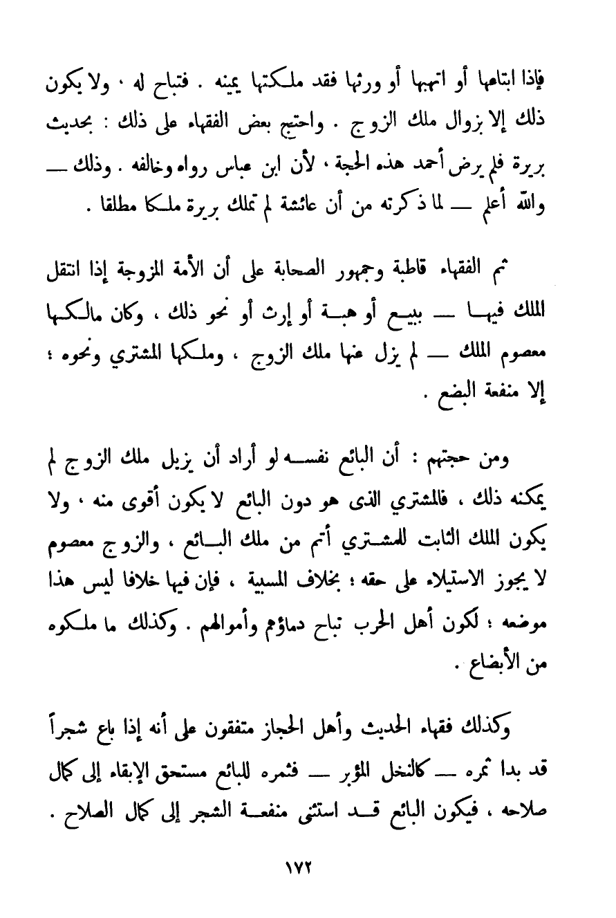 فَإِذَا ابْتَاعَهَا أَوْ اتَّهَبَهَا أَوْ وَرِثَهَا فَقَدْ مَلَكَتْهَا يَمِينُهُ. فَتُبَاحُ لَهُ وَلَا يَكُونُ ذَلِكَ إلَّا بِزَوَالِ مِلْكِ الزَّوْجِ. وَاحْتَجَّ بَعْضُ الْفُقَهَاءِ عَلَى ذَلِكَ: بِحَدِيثِ بَرِيرَةَ فَلَمْ يَرْضَ أَحْمَد هَذِهِ الْحُجَّةَ؛ لِأَنَّ ابْنَ عَبَّاسٍ رَوَاهُ وَخَالَفَهُ. وَذَلِكَ - وَاَللَّهُ أَعْلَمُ - لِمَا ذَكَرْته مِنْ أَنَّ عَائِشَةَ لَمْ تَمْلِكْ بَرِيرَةَ مِلْكًا مُطْلَقًا. ثُمَّ الْفُقَهَاءُ قَاطِبَةً وَجُمْهُورُ الصَّحَابَةِ عَلَى أَنَّ الْأَمَةَ الْمُزَوَّجَةَ إذَا انْتَقَلَ الْمِلْكُ فِيهَا - بِبَيْعٍ أَوْ هِبَةٍ أَوْ إرْثٍ أَوْ نَحْوِ ذَلِكَ وَكَانَ مَالِكُهَا مَعْصُومَ الْمِلْكِ - لَمْ يَزَلْ عَنْهَا مِلْكُ الزَّوْجِ وَمَلَكَهَا الْمُشْتَرِي وَنَحْوُهُ: إلَّا مَنْفَعَةَ الْبُضْعِ. وَمِنْ حُجَّتِهِمْ: أَنَّ الْبَائِعَ نَفْسَهُ لَوْ أَرَادَ أَنْ يُزِيلَ مِلْكَ الزَّوْجِ لَمْ يُمْكِنْهُ ذَلِكَ فَالْمُشْتَرِي الَّذِي هُوَ دُونَ الْبَائِعِ لَا يَكُونُ أَقْوَى مِنْهُ وَلَا يَكُونُ الْمِلْكُ الثَّابِتُ لِلْمُشْتَرِي أَتَمَّ مِنْ مِلْكِ الْبَائِعِ وَالزَّوْجُ مَعْصُومٌ لَا يَجُوزُ الِاسْتِيلَاءُ عَلَى حَقِّهِ؛ بِخِلَافِ الْمَسْبِيَّةِ فَإِنَّ فِيهَا خِلَافًا لَيْسَ هَذَا مَوْضِعَهُ؛ لِكَوْنِ أَهْلِ الْحَرْبِ تُبَاحُ دِمَاؤُهُمْ وَأَمْوَالُهُمْ. وَكَذَلِكَ مَا مَلَكُوهُ مِنْ الْأَبْضَاعِ. وَكَذَلِكَ فُقَهَاءُ الْحَدِيثِ وَأَهْلُ الْحِجَازِ مُتَّفِقُونَ عَلَى أَنَّهُ إذَا بَاعَ شَجَرًا قَدْ بَدَا ثَمَرُهُ - كَالنَّخْلِ الْمُؤَبَّرِ - فَثَمَرُهُ لِلْبَائِعِ مُسْتَحَقُّ الْإِبْقَاءِ إلَى كَمَالِ صَلَاحِهِ فَيَكُونُ الْبَائِعُ قَدْ اسْتَثْنَى مَنْفَعَةَ الشَّجَرِ إلَى كَمَالِ الصَّلَاحِ.