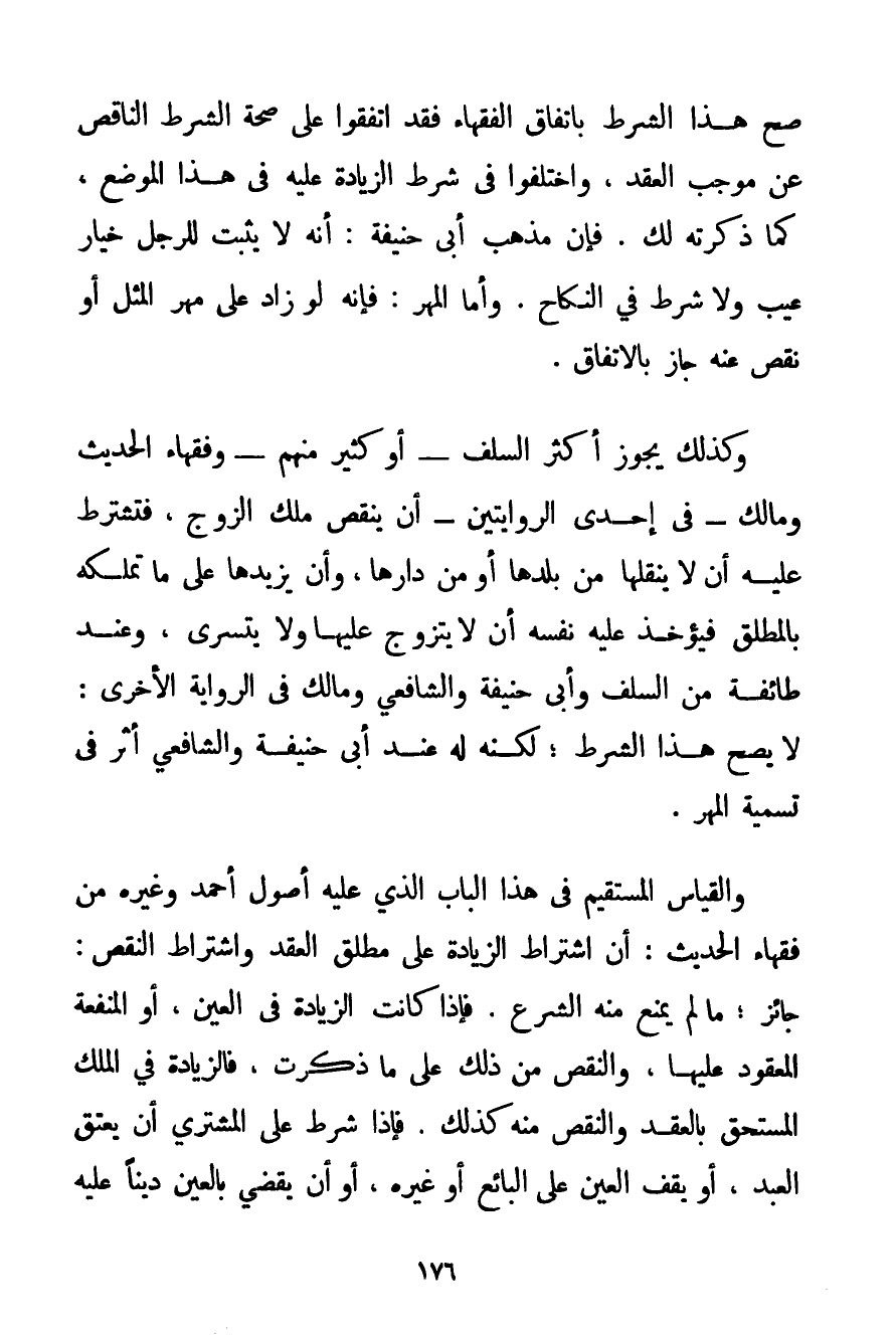 صَحَّ هَذَا الشَّرْطُ بِاتِّفَاقِ الْفُقَهَاءِ فَقَدْ اتَّفَقُوا عَلَى صِحَّةِ الشَّرْطِ النَّاقِصِ عَنْ مُوجِبِ الْعَقْدِ وَاخْتَلَفُوا فِي شَرْطِ الزِّيَادَةِ عَلَيْهِ فِي هَذَا الْمَوْضِعِ كَمَا ذَكَرْته لَك. فَإِنَّ مَذْهَبَ أَبِي حَنِيفَةَ: أَنَّهُ لَا يَثْبُتُ لِلرَّجُلِ خِيَارُ عَيْبٍ وَلَا شَرْطٌ فِي النِّكَاحِ. وَأَمَّا الْمَهْرُ: فَإِنَّهُ لَوْ زَادَ عَلَى مَهْرِ الْمِثْلِ أَوْ نَقَصَ عَنْهُ جَازَ بِالِاتِّفَاقِ. وَكَذَلِكَ يُجَوِّزُ أَكْثَرُ السَّلَفِ - أَوْ كَثِيرٌ مِنْهُمْ - وَفُقَهَاءُ الْحَدِيثِ وَمَالِكٌ - فِي إحْدَى الرِّوَايَتَيْنِ - أَنْ يَنْقُصَ مِلْكُ الزَّوْجِ فَتَشْتَرِطُ عَلَيْهِ أَنْ لَا يَنْقُلَهَا مِنْ بَلَدِهَا أَوْ مِنْ دَارِهَا وَأَنْ يَزِيدَهَا عَلَى مَا تَمْلِكُهُ بِالْمُطْلَقِ فَيُؤْخَذُ عَلَيْهِ نَفْسُهُ أَنْ لَا يَتَزَوَّجَ عَلَيْهَا وَلَا يَتَسَرَّى وَعِنْدَ طَائِفَةٍ مِنْ السَّلَفِ وَأَبِي حَنِيفَةَ وَالشَّافِعِيِّ وَمَالِكٍ فِي الرِّوَايَةِ الْأُخْرَى: لَا يَصِحُّ هَذَا الشَّرْطُ؛ لَكِنَّهُ لَهُ عِنْدَ أَبِي حَنِيفَةَ وَالشَّافِعِيِّ أَثَرٌ فِي تَسْمِيَةِ الْمَهْرِ. وَالْقِيَاسُ الْمُسْتَقِيمُ فِي هَذَا الْبَابِ الَّذِي عَلَيْهِ أُصُولُ أَحْمَد وَغَيْرِهِ مِنْ فُقَهَاءِ الْحَدِيثِ: أَنَّ اشْتِرَاطَ الزِّيَادَةِ عَلَى مُطْلَقِ الْعَقْدِ وَاشْتِرَاطَ النَّقْصِ: جَائِزٌ؛ مَا لَمْ يَمْنَعْ مِنْهُ الشَّرْعُ. فَإِذَا كَانَتْ الزِّيَادَةُ فِي الْعَيْنِ أَوْ الْمَنْفَعَةِ الْمَعْقُودِ عَلَيْهَا وَالنَّقْصِ مِنْ ذَلِكَ عَلَى مَا ذَكَرْت فَالزِّيَادَةُ فِي الْمِلْكِ الْمُسْتَحَقِّ بِالْعَقْدِ وَالنَّقْصُ مِنْهُ كَذَلِكَ. فَإِذَا شَرَطَ عَلَى الْمُشْتَرِي أَنْ يُعْتِقَ الْعَبْدَ أَوْ يَقِفَ الْعَيْنَ عَلَى الْبَائِعِ أَوْ غَيْرَهُ أَوْ أَنْ يَقْضِيَ بِالْعَيْنِ دَيْنًا عَلَيْهِ