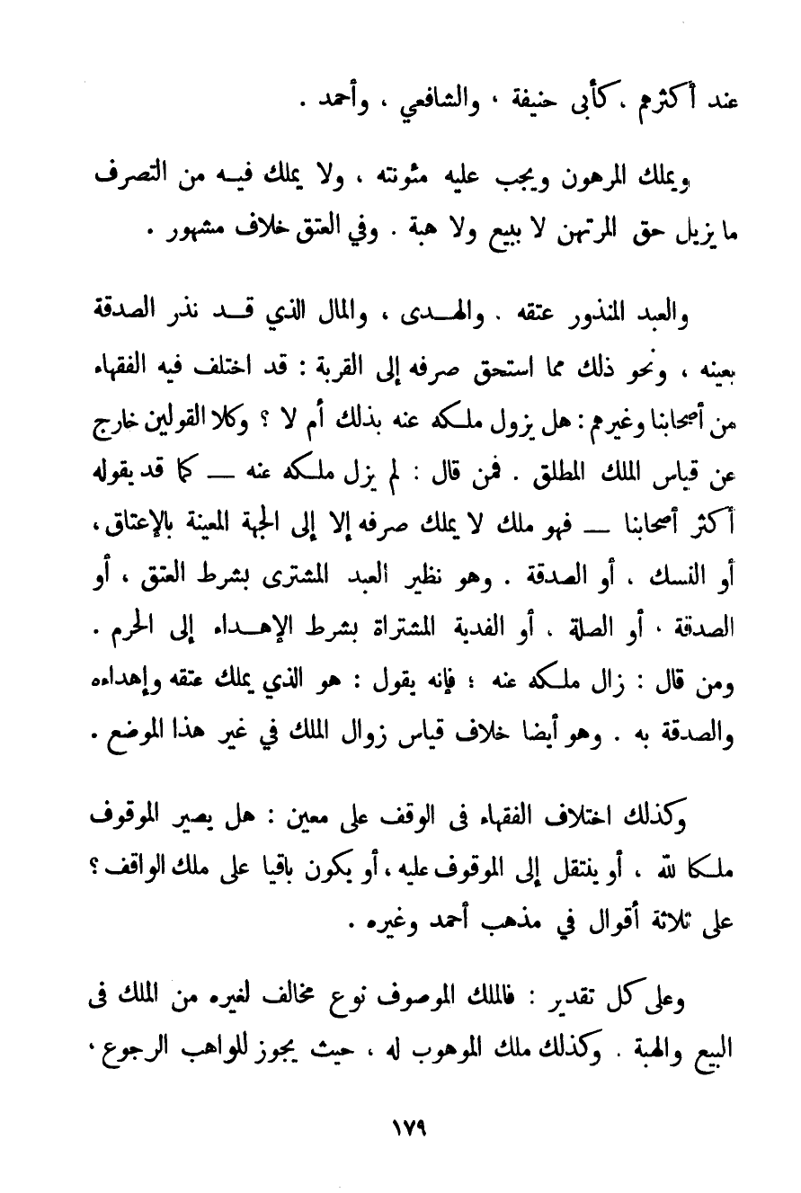 عِنْدَ أَكْثَرِهِمْ كَأَبِي حَنِيفَةَ وَالشَّافِعِيِّ وَأَحْمَد. وَيَمْلِكُ الْمَرْهُونَ وَيَجِبُ عَلَيْهِ مَئُونَتَهُ وَلَا يَمْلِكُ فِيهِ مِنْ التَّصَرُّفِ مَا يُزِيلُ حَقَّ الْمُرْتَهِنِ لَا بِبَيْعٍ وَلَا هِبَةٍ. وَفِي الْعِتْقِ خِلَافٌ مَشْهُورٌ. وَالْعَبْدُ الْمَنْذُورُ عِتْقُهُ وَالْهَدْيُ وَالْمَالُ الَّذِي قَدْ نَذَرَ الصَّدَقَةَ بِعَيْنِهِ وَنَحْوَ ذَلِكَ مِمَّا اسْتَحَقَّ صَرْفَهُ إلَى الْقِرْبَةِ: قَدْ اخْتَلَفَ فِيهِ الْفُقَهَاءُ مِنْ أَصْحَابِنَا وَغَيْرِهِمْ: هَلْ يَزُولُ مِلْكُهُ عَنْهُ بِذَلِكَ أَمْ لَا؟ وَكِلَا الْقَوْلَيْنِ خَارِجٌ عَنْ قِيَاسِ الْمِلْكِ الْمُطْلَقِ. فَمَنْ قَالَ: لَمْ يَزَلْ مِلْكُهُ عَنْهُ - كَمَا قَدْ يَقُولُهُ أَكْثَرُ أَصْحَابِنَا - فَهُوَ مِلْكٌ لَا يَمْلِكُ صَرْفَهُ إلَّا إلَى الْجِهَةِ الْمُعَيَّنَةِ بِالْإِعْتَاقِ أَوْ النُّسُكِ أَوْ الصَّدَقَةِ. وَهُوَ نَظِيرُ الْعَبْدِ الْمُشْتَرَى بِشَرْطِ الْعِتْقِ أَوْ الصَّدَقَةِ أَوْ الصِّلَةِ أَوْ الْفِدْيَةِ الْمُشْتَرَاةِ بِشَرْطِ الْإِهْدَاءِ إلَى الْحَرَمِ. وَمَنْ قَالَ: زَالَ مِلْكُهُ عَنْهُ؛ فَإِنَّهُ يَقُولُ: هُوَ الَّذِي يَمْلِكُ عِتْقَهُ وَإِهْدَاءَهُ وَالصَّدَقَةَ بِهِ. وَهُوَ أَيْضًا خِلَافُ قِيَاسِ زَوَالِ الْمِلْكِ فِي غَيْرِ هَذَا الْمَوْضِعِ. وَكَذَلِكَ اخْتِلَافُ الْفُقَهَاءِ فِي الْوَقْفِ عَلَى مُعَيَّنٍ: هَلْ يَصِيرُ الْمَوْقُوفُ مِلْكًا لِلَّهِ أَوْ يَنْتَقِلُ إلَى الْمَوْقُوفِ عَلَيْهِ أَوْ يَكُونُ بَاقِيًا عَلَى مِلْكِ الْوَاقِفِ؟ عَلَى ثَلَاثَةِ أَقْوَالٍ فِي مَذْهَبِ أَحْمَد وَغَيْرِهِ. وَعَلَى كُلِّ تَقْدِيرٍ: فَالْمِلْكُ الْمَوْصُوفُ نَوْعٌ مُخَالِفٌ لِغَيْرِهِ مِنْ الْمِلْكِ فِي الْبَيْعِ وَالْهِبَةِ. وَكَذَلِكَ مِلْكُ الْمَوْهُوبِ لَهُ حَيْثُ يَجُوزُ لِلْوَاهِبِ الرُّجُوعُ