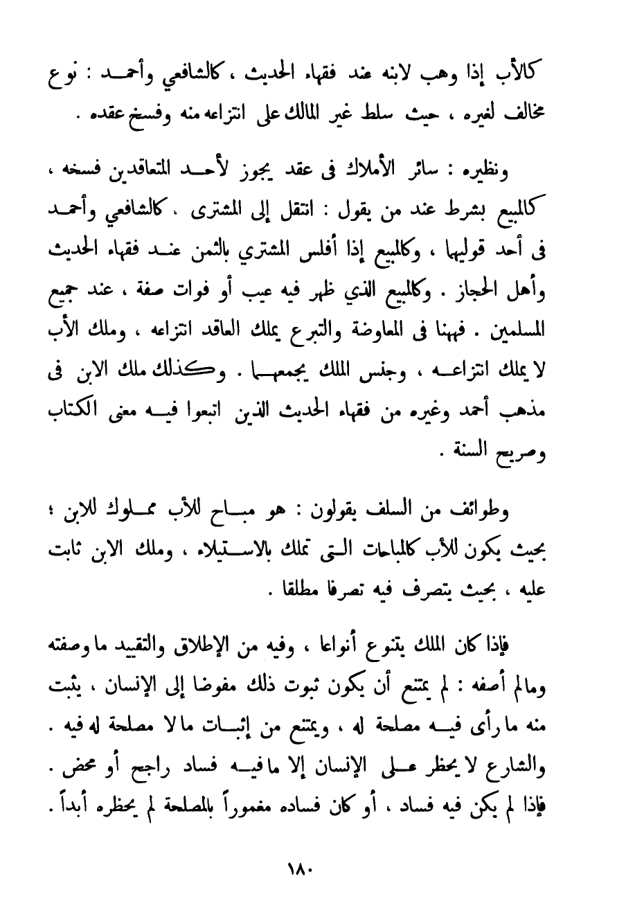 كَالْأَبِ إذَا وَهَبَ لِابْنِهِ عِنْدَ فُقَهَاءِ الْحَدِيثِ كَالشَّافِعِيِّ وَأَحْمَد: نَوْعٌ مُخَالِفٌ لِغَيْرِهِ حَيْثُ سُلِّطَ غَيْرُ الْمَالِكِ عَلَى انْتِزَاعِهِ مِنْهُ وَفَسْخِ عَقْدِهِ. وَنَظِيرُهُ: سَائِرُ الْأَمْلَاكِ فِي عَقْدٍ يَجُوزُ لِأَحَدِ الْمُتَعَاقِدَيْنِ فَسْخُهُ كَالْمَبِيعِ بِشَرْطٍ عِنْدَ مَنْ يَقُولُ: انْتَقَلَ إلَى الْمُشْتَرِي كَالشَّافِعِيِّ وَأَحْمَد فِي أَحَدِ قَوْلَيْهِمَا وَكَالْمَبِيعِ إذَا أَفْلَسَ الْمُشْتَرِي بِالثَّمَنِ عِنْدَ فُقَهَاءِ الْحَدِيثِ وَأَهْلِ الْحِجَازِ، وَكَالْمَبِيعِ الَّذِي ظَهَرَ فِيهِ عَيْبٌ أَوْ فَوَاتُ صِفَةٍ عِنْدَ جَمِيعِ الْمُسْلِمِينَ. فَهَهُنَا فِي الْمُعَاوَضَةِ وَالتَّبَرُّعِ يَمْلِكُ الْعَاقِدُ انْتِزَاعَهُ وَمِلْكُ الْأَبِ لَا يَمْلِكُ انْتِزَاعَهُ وَجِنْسُ الْمِلْكِ يَجْمَعُهُمَا. وَكَذَلِكَ مِلْكُ الِابْنِ فِي مَذْهَبِ أَحْمَد وَغَيْرِهِ. مِنْ فُقَهَاءِ الْحَدِيثِ الَّذِينَ اتَّبَعُوا فِيهِ مَعْنَى الْكِتَابِ وَصَرِيحَ السُّنَّةِ. وَطَوَائِفُ مِنْ السَّلَفِ يَقُولُونَ: هُوَ مُبَاحٌ لِلْأَبِ مَمْلُوكٌ لِلِابْنِ؛ بِحَيْثُ يَكُونُ لِلْأَبِ كَالْمُبَاحَاتِ الَّتِي تُمْلَكُ بِالِاسْتِيلَاءِ وَمِلْكُ الِابْنِ ثَابِتٌ عَلَيْهِ بِحَيْثُ يَتَصَرَّفُ فِيهِ تَصَرُّفًا مُطْلَقًا. فَإِذَا كَانَ الْمِلْكُ يَتَنَوَّعُ أَنْوَاعًا وَفِيهِ مِنْ الْإِطْلَاقِ وَالتَّقْيِيدِ مَا وَصَفْته وَمَا لَمْ أَصِفْهُ: لَمْ يَمْتَنِعْ أَنْ يَكُونَ ثُبُوتُ ذَلِكَ مُفَوَّضًا إلَى الْإِنْسَانِ يُثْبِتُ مِنْهُ مَا رَأَى فِيهِ مَصْلَحَةً لَهُ وَيَمْتَنِعُ مِنْ إثْبَاتِ مَا لَا مَصْلَحَةَ لَهُ فِيهِ. وَالشَّارِعُ لَا يَحْظُرُ عَلَى الْإِنْسَانِ إلَّا مَا فِيهِ فَسَادٌ رَاجِعٌ أَوْ مَحْضٌ. فَإِذَا لَمْ يَكُنْ فِيهِ فَسَادٌ أَوْ كَانَ فَسَادُهُ مَغْمُورًا بِالْمَصْلَحَةِ لَمْ يَحْظُرْهُ أَبَدًا.