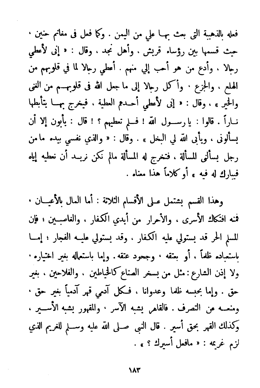 فَعَلَهُ بِالذُّهَيْبَةِ الَّتِي بُعِثَ بِهَا عَلِيٌّ مِنْ الْيَمَنِ. وَكَمَا فَعَلَ فِي مَغَانِمِ حنين حَيْثُ قَسَّمَهَا بَيْنَ رُؤَسَاءِ قُرَيْشٍ وَأَهْلِ نَجْدٍ وَقَالَ: {إنِّي لَأُعْطِي رِجَالًا وَأَدَعُ مَنْ هُوَ أَحَبُّ إلَيَّ مِنْهُمْ. أُعْطِي رِجَالًا لِمَا فِي قُلُوبِهِمْ مِنْ الْهَلَعِ وَالْجَزَعِ وَأَكِلُ رِجَالًا إلَى مَا جَعَلَ اللَّهُ فِي قُلُوبِهِمْ مِنْ الْغِنَى وَالْخَيْرِ} وَقَالَ: {إنِّي لَأُعْطِي أَحَدَهُمْ الْعَطِيَّةَ فَيَخْرُجُ بِهَا يَتَأَبَّطُهَا نَارًا. قَالُوا: يَا رَسُولَ اللَّهِ فَلِمَ تُعْطِيهِمْ قَالَ: يَأْبُونَ إلَّا أَنْ يَسْأَلُونِي وَيَأْبَى اللَّهُ لِي الْبُخْلَ} . وَقَالَ: {وَاَلَّذِي نَفْسِي بِيَدِهِ مَا مِنْ رَجُلٍ يَسْأَلُنِي الْمَسْأَلَةَ فَتُخْرِجُ لَهُ الْمَسْأَلَةُ مَا لَمْ نَكُنْ نُرِيدُ أَنْ نُعْطِيَهُ إيَّاهُ فَيُبَارِكُ لَهُ فِيهِ} " أَوْ كَلَامًا هَذَا مَعْنَاهُ. وَهَذَا الْقِسْمُ يَشْتَمِلُ عَلَى الْأَقْسَامِ الثَّلَاثَةِ: أَمَّا الْمَالُ بِالْأَعْيَانِ فَمِنْهُ افْتِكَاكُ الْأَسْرَى وَالْأَحْرَارِ مِنْ أَيْدِي الْكُفَّارِ وَالْغَاصِبِينَ؛ فَإِنَّ الْمُسْلِمَ الْحُرَّ قَدْ يَسْتَوْلِي عَلَيْهِ الْكُفَّارُ وَقَدْ يَسْتَوْلِي عَلَيْهِ الْفُجَّارُ؛ إمَّا بِاسْتِعْبَادِهِ ظُلْمًا أَوْ بِعِتْقِهِ وَجُحُودِ عِتْقِهِ. وَإِمَّا بِاسْتِعْمَالِهِ بِغَيْرِ اخْتِيَارِهِ وَلَا إذْنِ الشَّارِعِ: مِثْلَ مَنْ يُسَخِّرُ الصُّنَّاعَ كَالْخَيَّاطِينَ وَالْفَلَّاحِينَ بِغَيْرِ حَقٍّ. وَإِمَّا بِحَبْسِهِ ظُلْمًا وَعُدْوَانًا فَكُلُّ آدَمِيٍّ قَهَرَ آدَمِيًّا بِغَيْرِ حَقٍّ وَمَنَعَهُ عَنْ التَّصَرُّفِ. فَالْقَاهِرُ يُشْبِهُ الْآسِرَ وَالْمَقْهُورُ يُشْبِهُ الْأَسِيرَ وَكَذَلِكَ الْقَهْرُ بِحَقِّ أَسِيرٍ. قَالَ {النَّبِيُّ صَلَّى اللَّهُ عَلَيْهِ وَسَلَّمَ لِلْغَرِيمِ الَّذِي لَزِمَ غَرِيمَهُ: مَا فَعَلَ أَسِيرُك؟} .