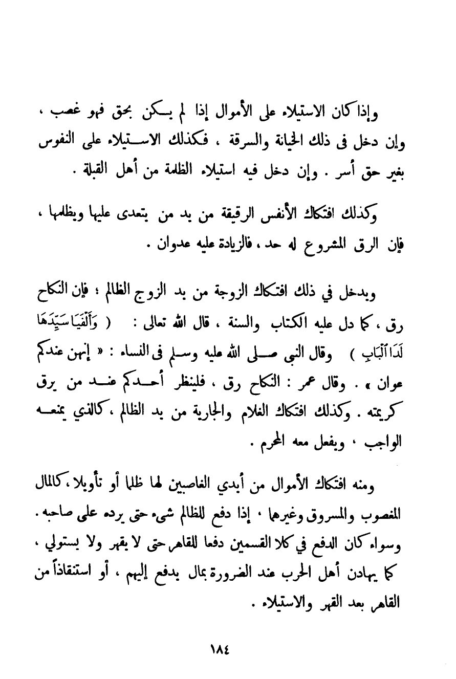 وَإِذَا كَانَ الِاسْتِيلَاءُ عَلَى الْأَمْوَالِ إذَا لَمْ يَكُنْ بِحَقٍّ فَهُوَ غَصْبٌ وَإِنْ دَخَلَ فِي ذَلِكَ الْخِيَانَةُ وَالسَّرِقَةُ فَكَذَلِكَ الِاسْتِيلَاءُ عَلَى النُّفُوسِ بِغَيْرِ حَقِّ أَسْرٍ. وَإِنْ دَخَلَ فِيهِ اسْتِيلَاءُ الظَّلَمَةِ مِنْ أَهْلِ الْقِبْلَةِ. وَكَذَلِكَ افْتِكَاكُ الْأَنْفُسِ الرَّقِيقَةِ مِنْ يَدِ مَنْ يَتَعَدَّى عَلَيْهَا وَيَظْلِمُهَا فَإِنَّ الرِّقَّ الْمَشْرُوعَ لَهُ حَدٌّ فَالزِّيَادَةُ عَلَيْهِ عُدْوَانٌ. وَيَدْخُلُ فِي ذَلِكَ افْتِكَاكُ الزَّوْجَةِ مِنْ يَدِ الزَّوْجِ الظَّالِمِ؛ فَإِنَّ النِّكَاحَ رِقٌّ كَمَا دَلَّ عَلَيْهِ الْكِتَابُ وَالسُّنَّةُ قَالَ اللَّهُ تَعَالَى: {وَأَلْفَيَا سَيِّدَهَا لَدَى الْبَابِ} وَقَالَ النَّبِيُّ صَلَّى اللَّهُ عَلَيْهِ وَسَلَّمَ فِي النِّسَاءِ: {إنَّهُنَّ عِنْدَكُمْ عَوَانٌ} . وَقَالَ عُمَرُ: النِّكَاحُ رِقٌّ فَلْيَنْظُرْ أَحَدُكُمْ عِنْدَ مَنْ يَرِقُّ كَرِيمَتَهُ. وَكَذَلِكَ افْتِكَاكُ الْغُلَامِ وَالْجَارِيَةِ مِنْ يَدِ الظَّالِمِ كَاَلَّذِي يَمْنَعُهُ الْوَاجِبُ وَيَفْعَلُ مَعَهُ الْمُحَرَّمَ. وَمِنْهُ افْتِكَاكُ الْأَمْوَالِ مِنْ أَيْدِي الْغَاصِبِينَ لَهَا ظُلْمًا أَوْ تَأْوِيلًا كَالْمَالِ الْمَغْصُوبِ وَالْمَسْرُوقِ وَغَيْرِهِمَا إذَا دُفِعَ لِلظَّالِمِ شَيْءٌ حَتَّى يَرُدَّهُ عَلَى صَاحِبِهِ. وَسَوَاءٌ كَانَ الدَّفْعُ فِي كِلَا الْقِسْمَيْنِ دَفْعًا لِلْقَاهِرِ حَتَّى لَا يَقْهَرَ وَلَا يَسْتَوْلِيَ كَمَا يُهَادَنُ أَهْلُ الْحَرْبِ عِنْدَ الضَّرُورَةِ بِمَالٍ يُدْفَعُ إلَيْهِمْ أَوْ اسْتِنْقَاذًا مِنْ الْقَاهِرِ بَعْدَ الْقَهْرِ وَالِاسْتِيلَاءِ.