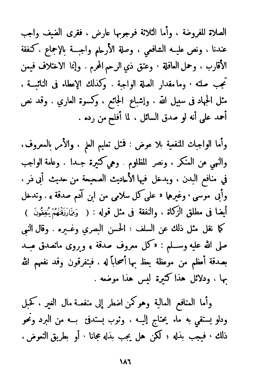 الصَّلَاةِ الْمَفْرُوضَةِ وَأَمَّا الثَّلَاثَةُ فَوُجُوبُهَا عَارِضٌ فَقَرْيُ الضَّيْفِ وَاجِبٌ عِنْدَنَا وَنَصَّ عَلَيْهِ الشَّافِعِيُّ وَصِلَةُ الْأَرْحَامِ وَاجِبَةٌ بِالْإِجْمَاعِ كَنَفَقَةِ الْأَقَارِبِ وَحَمْلِ الْعَاقِلَةِ وَعِتْقِ ذِي الرَّحِمِ الْمَحْرَمِ. وَإِنَّمَا الِاخْتِلَافُ فِيمَنْ تَجِبُ صِلَتُهُ وَمَا مِقْدَارُ الصِّلَةِ الْوَاجِبَةِ. وَكَذَلِكَ الْإِعْطَاءُ فِي النَّائِبَةِ مِثْلَ الْجِهَادِ فِي سَبِيلِ اللَّهِ وَإِشْبَاعِ الْجَائِعِ وَكِسْوَةِ الْعَارِي. وَقَدْ نَصَّ أَحْمَد عَلَى أَنَّهُ لَوْ صَدَقَ السَّائِلُ لَمَا أَفْلَحَ مَنْ رَدَّهُ. وَأَمَّا الْوَاجِبَاتُ الْمَنْفَعِيَّةُ بِلَا عِوَضٍ: فَمِثْلُ تَعْلِيمِ الْعِلْمِ وَالْأَمْرِ بِالْمَعْرُوفِ وَالنَّهْيِ عَنْ الْمُنْكَرِ وَنَصْرِ الْمَظْلُومِ وَهِيَ كَثِيرَةٌ جِدًّا. وَعَامَّةُ الْوَاجِبِ فِي مَنَافِعِ الْبَدَنِ وَيَدْخُلُ فِيهَا الْأَحَادِيثُ الصَّحِيحَةُ مِنْ حَدِيثِ أَبِي ذَرٍّ وَأَبِي مُوسَى وَغَيْرِهِمَا {عَلَى كُلِّ سُلَامَى مِنْ ابْنِ آدَمَ صَدَقَةٌ} ". وَتَدْخُلُ أَيْضًا فِي مُطْلَقِ الزَّكَاةِ وَالنَّفَقَةِ فِي مِثْلِ قَوْلِهِ: {وَمِمَّا رَزَقْنَاهُمْ يُنْفِقُونَ} كَمَا نُقِلَ مِثْلُ ذَلِكَ عَنْ السَّلَفِ: الْحَسَنِ الْبَصْرِيِّ وَغَيْرِهِ. وَقَالَ النَّبِيُّ صَلَّى اللَّهُ عَلَيْهِ وَسَلَّمَ " {كُلُّ مَعْرُوفٍ صَدَقَةٌ} " وَيُرْوَى مَا تَصَدَّقَ عَبْدٌ بِصَدَقَةٍ أَعْظَمَ مِنْ مَوْعِظَةٍ يَعِظُ بِهَا أَصْحَابًا لَهُ؛ فَيَتَفَرَّقُونَ وَقَدْ نَفَعَهُمْ اللَّهُ بِهَا وَدَلَائِلُ هَذَا كَثِيرَةٌ لَيْسَ هَذَا مَوْضِعَهُ. وَأَمَّا الْمَنَافِعُ الْمَالِيَّةُ وَهُوَ كَمَنْ اُضْطُرَّ إلَى مَنْفَعَةِ مَالِ الْغَيْرِ كَحَبْلٍ وَدَلْوٍ يَسْتَقِي بِهِ مَاءً يَحْتَاجُ إلَيْهِ وَثَوْبٍ يَسْتَدْفِئُ بِهِ مِنْ الْبَرْدِ وَنَحْوِ ذَلِكَ فَيَجِبُ بَذْلُهُ؛ لَكِنْ هَلْ يَجِبُ بَذْلُهُ مَجَّانًا أَوْ بِطَرِيقِ التَّعَوُّضِ