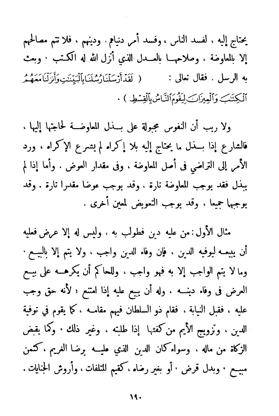 يَحْتَاجُ إلَيْهِ لَفَسَدَ النَّاسُ وَفَسَدَ أَمْرُ دُنْيَاهُمْ وَدِينِهِمْ فَلَا تَتِمُّ مَصَالِحُهُمْ إلَّا بِالْمُعَاوَضَةِ وَصَلَاحُهَا بِالْعَدْلِ الَّذِي أَنْزَلَ اللَّهُ لَهُ الْكُتُبَ وَبَعَثَ بِهِ الرُّسُلَ. فَقَالَ تَعَالَى: {لَقَدْ أَرْسَلْنَا رُسُلَنَا بِالْبَيِّنَاتِ وَأَنْزَلْنَا مَعَهُمُ الْكِتَابَ وَالْمِيزَانَ لِيَقُومَ النَّاسُ بِالْقِسْطِ} . وَلَا رَيْبَ أَنَّ النُّفُوسَ مَجْبُولَةٌ عَلَى بَذْلِ الْمُعَاوَضَةِ لِحَاجَتِهَا إلَيْهَا فَالشَّارِعُ إذَا بَذَلَ مَا يَحْتَاجُ إلَيْهِ بِلَا إكْرَاهٍ لَمْ يَشْرَعْ الْإِكْرَاهُ وَرَدُّ الْأَمْرِ إلَى التَّرَاضِي فِي أَصْلِ الْمُعَاوَضَةِ وَفِي مِقْدَارِ الْعِوَضِ. وَأَمَّا إذَا لَمْ يَبْذُلْ فَقَدْ يُوجِبُ الْمُعَاوَضَةَ تَارَةً وَقَدْ يُوجِبُ عِوَضًا مُقَدَّرًا تَارَةً. وَقَدْ يُوجِبُهُمَا جَمِيعًا وَقَدْ يُوجِبُ التَّعْوِيضَ لِمُعَيَّنِ أُخْرَى. مِثَالُ الْأَوَّلِ: مَنْ عَلَيْهِ دَيْنٌ فَطُولِبَ بِهِ وَلَيْسَ لَهُ إلَّا عَرَضٌ فَعَلَيْهِ أَنْ يَبِيعَهُ لِيُوفِيَهُ الدَّيْنَ فَإِنَّ وَفَاءَ الدَّيْنِ وَاجِبٌ وَلَا يَتِمُّ إلَّا بِالْبَيْعِ وَمَا لَا يَتِمُّ الْوَاجِبُ إلَّا بِهِ فَهُوَ وَاجِبٌ وَلِلْحَاكِمِ أَنْ يُكْرِهَهُ عَلَى بَيْعِ الْعَرَضِ فِي وَفَاءِ دَيْنِهِ وَلَهُ أَنْ يَبِيعَ عَلَيْهِ إذَا امْتَنَعَ؛ لِأَنَّهُ حَقٌّ وَجَبَ عَلَيْهِ فَقَبِلَ النِّيَابَةَ فَقَامَ ذُو السُّلْطَانِ فِيهِمْ مَقَامَهُ كَمَا يَقُومُ فِي تَوْفِيَةِ الدَّيْنِ وَتَزْوِيجِ الْأَيِّمِ مِنْ كُفْئِهَا إذَا طَلَبَتْهُ وَغَيْرِ ذَلِكَ وَكَمَا يَقْبِضُ الزَّكَاةَ مِنْ مَالِهِ وَسَوَاءٌ كَانَ الدَّيْنُ الَّذِي عَلَيْهِ بِرِضَا الْغَرِيمِ كَثَمَنِ مَبِيعٍ وَبَدَلِ قَرْضٍ أَوْ بِغَيْرِ رِضَاهُ كَقِيَمِ الْمُتْلَفَاتِ وَأُرُوشِ الْجِنَايَاتِ.