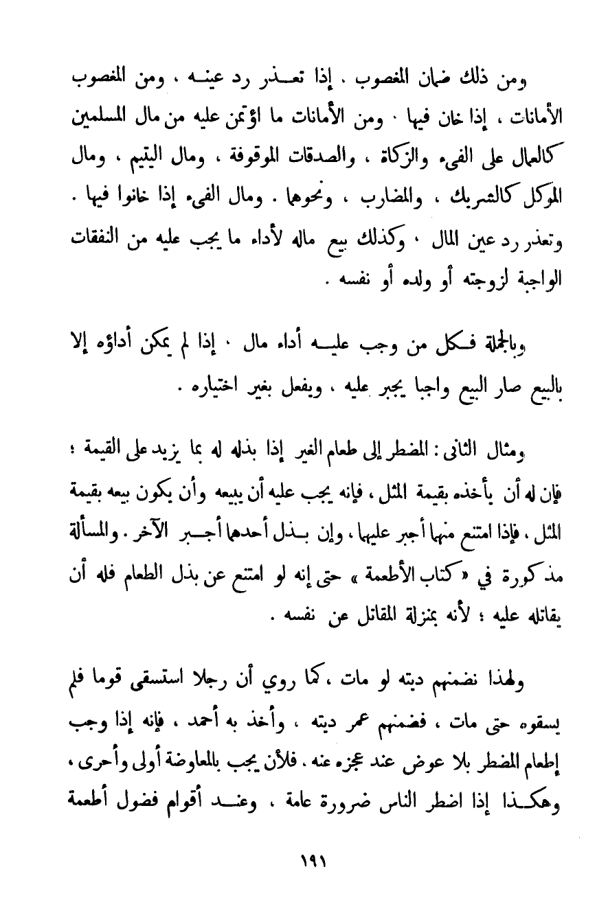 وَمِنْ ذَلِكَ ضَمَانُ الْمَغْصُوبِ إذَا تَعَذَّرَ رَدُّ عَيْنِهِ وَمِنْ الْمَغْصُوبِ الْأَمَانَاتُ إذَا خَانَ فِيهَا وَمِنْ الْأَمَانَاتِ مَا اُؤْتُمِنَ عَلَيْهِ مِنْ مَالِ الْمُسْلِمِينَ كَالْعُمَّالِ عَلَى الْفَيْءِ وَالزَّكَاةِ وَالصَّدَقَاتِ الْمَوْقُوفَةِ وَمَالِ الْيَتِيمِ وَمَالِ الْمُوَكَّلِ كَالشَّرِيكِ وَالْمُضَارِبِ وَنَحْوِهِمَا. وَمَالِ الْفَيْءِ إذَا خَانُوا فِيهَا. وَتَعَذَّرَ رَدُّ عَيْنِ الْمَالِ وَكَذَلِكَ بَيْعُ مَالِهِ لِأَدَاءِ مَا يَجِبُ عَلَيْهِ مِنْ النَّفَقَاتِ الْوَاجِبَةِ لِزَوْجَتِهِ أَوْ وَلَدِهِ أَوْ نَفْسِهِ. وَبِالْجُمْلَةِ فَكُلُّ مَنْ وَجَبَ عَلَيْهِ أَدَاءُ مَالٍ إذَا لَمْ يُمْكِنُ أَدَاؤُهُ إلَّا بِالْبَيْعِ صَارَ الْبَيْعُ وَاجِبًا يُجْبَرُ عَلَيْهِ وَيُفْعَلُ بِغَيْرِ اخْتِيَارِهِ. وَمِثَالُ الثَّانِي: الْمُضْطَرُّ إلَى طَعَامِ الْغَيْرِ إذَا بَذَلَهُ لَهُ بِمَا يَزِيدُ عَلَى الْقِيمَةِ؛ فَإِنَّ لَهُ أَنْ يَأْخُذَهُ بِقِيمَةِ الْمِثْلِ فَإِنَّهُ يَجِبُ عَلَيْهِ أَنْ يَبِيعَهُ وَأَنْ يَكُونَ بَيْعُهُ بِقِيمَةِ الْمِثْلِ فَإِذَا امْتَنَعَ مِنْهُمَا أُجْبِرَ عَلَيْهِمَا وَإِنْ بَذَلَ أَحَدُهُمَا أُجْبِرَ الْآخَرُ. وَالْمَسْأَلَةُ مَذْكُورَةٌ فِي " كِتَابِ الْأَطْعِمَةِ " حَتَّى إنَّهُ لَوْ امْتَنَعَ عَنْ بَذْلِ الطَّعَامِ فَلَهُ أَنْ يُقَاتِلَهُ عَلَيْهِ؛ لِأَنَّهُ بِمَنْزِلَةِ الْمُقَاتِلِ عَنْ نَفْسِهِ. وَلِهَذَا نُضَمِّنُهُمْ دِيَتَهُ لَوْ مَاتَ كَمَا رُوِيَ أَنَّ رَجُلًا اسْتَسْقَى قَوْمًا فَلَمْ يَسْقُوهُ حَتَّى مَاتَ فَضَمَّنَهُمْ عُمَرُ دِيَتَهُ وَأَخَذَ بِهِ أَحْمَد فَإِنَّهُ إذَا وَجَبَ إطْعَامُ الْمُضْطَرِّ بِلَا عِوَضٍ عِنْدَ عَجْزِهِ عَنْهُ فَلَأَنْ يَجِبَ بِالْمُعَاوَضَةِ أَوْلَى وَأَحْرَى وَهَكَذَا إذَا اُضْطُرَّ النَّاسُ ضَرُورَةً عَامَّةً وَعِنْدَ أَقْوَامٍ فُضُولُ أَطْعِمَةٍ