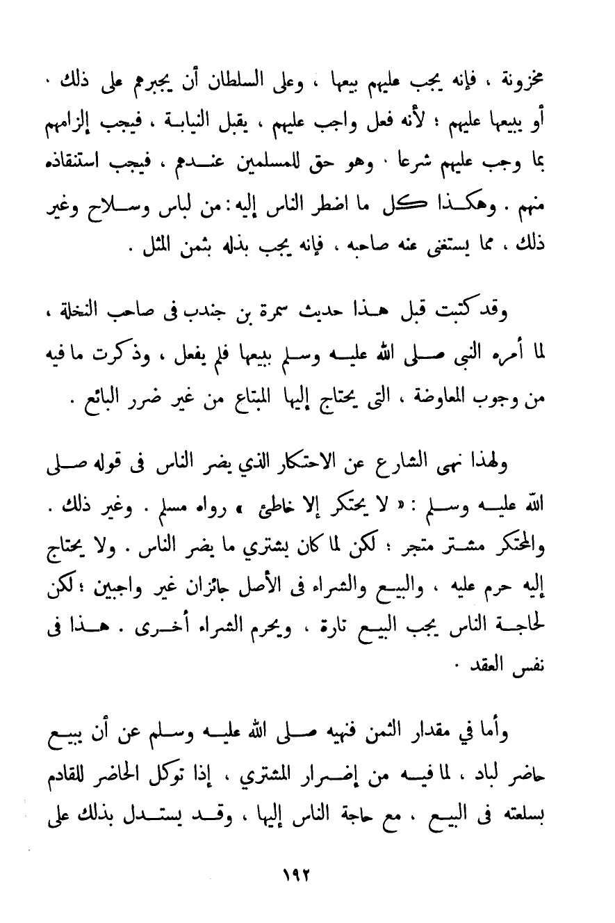 مَخْزُونَةٍ فَإِنَّهُ يَجِبُ عَلَيْهِمْ بَيْعُهَا وَعَلَى السُّلْطَانِ أَنْ يُجْبِرَهُمْ عَلَى ذَلِكَ أَوْ يَبِيعَهَا عَلَيْهِمْ؛ لِأَنَّهُ فِعْلٌ وَاجِبٌ عَلَيْهِمْ يَقْبَلُ النِّيَابَةَ فَيَجِبُ إلْزَامُهُمْ بِمَا وَجَبَ عَلَيْهِمْ شَرْعًا وَهُوَ حَقٌّ لِلْمُسْلِمِينَ عِنْدَهُمْ فَيَجِبُ اسْتِنْقَاذُهُ مِنْهُمْ. وَهَكَذَا كُلُّ مَا اُضْطُرَّ النَّاسُ إلَيْهِ: مِنْ لِبَاسٍ وَسِلَاحٍ وَغَيْرِ ذَلِكَ مِمَّا يَسْتَغْنِي عَنْهُ صَاحِبُهُ فَإِنَّهُ يَجِبُ بَذْلُهُ بِثَمَنِ الْمِثْلِ. وَقَدْ كَتَبْت قَبْلَ هَذَا حَدِيثَ سَمُرَةَ بْنِ جُنْدُبٍ فِي صَاحِبِ النَّخْلَةِ لَمَّا أَمَرَهُ النَّبِيُّ صَلَّى اللَّهُ عَلَيْهِ وَسَلَّمَ بِبَيْعِهَا فَلَمْ يَفْعَلْ وَذَكَرْت مَا فِيهِ مِنْ وُجُوبِ الْمُعَاوَضَةِ الَّتِي يَحْتَاجُ إلَيْهَا الْمُبْتَاعُ مِنْ غَيْرِ ضَرَرِ الْبَائِعِ. وَلِهَذَا نَهَى الشَّارِعُ عَنْ الِاحْتِكَارِ الَّذِي يَضُرُّ النَّاسَ فِي قَوْلِهِ صَلَّى اللَّهُ عَلَيْهِ وَسَلَّمَ {لَا يَحْتَكِرُ إلَّا خَاطِئٌ} " رَوَاهُ مُسْلِمٌ. وَغَيْرُ ذَلِكَ. وَالْمُحْتَكِرُ مُشْتَرٍ مُتَّجِرٌ؛ لَكِنْ لَمَّا كَانَ يَشْتَرِي مَا يَضُرُّ النَّاسَ. وَلَا يَحْتَاجُ إلَيْهِ حَرُمَ عَلَيْهِ وَالْبَيْعُ وَالشِّرَاءُ فِي الْأَصْلِ جَائِزَانِ غَيْرُ وَاجِبَيْنِ؛ لَكِنْ لِحَاجَةِ النَّاسِ يَجِبُ الْبَيْعُ تَارَةً وَيَحْرُمُ الشِّرَاءُ أُخْرَى. هَذَا فِي نَفْسِ الْعَقْدِ. وَأَمَّا فِي مِقْدَارِ الثَّمَنِ فَنَهْيُهُ صَلَّى اللَّهُ عَلَيْهِ وَسَلَّمَ عَنْ أَنْ يَبِيعَ حَاضِرٌ لِبَادٍ لِمَا فِيهِ مِنْ إضْرَارِ الْمُشْتَرِي إذَا تَوَكَّلَ الْحَاضِرُ لِلْقَادِمِ بِسِلْعَتِهِ فِي الْبَيْعِ مَعَ حَاجَةِ النَّاسِ إلَيْهَا وَقَدْ يُسْتَدَلُّ بِذَلِكَ عَلَى