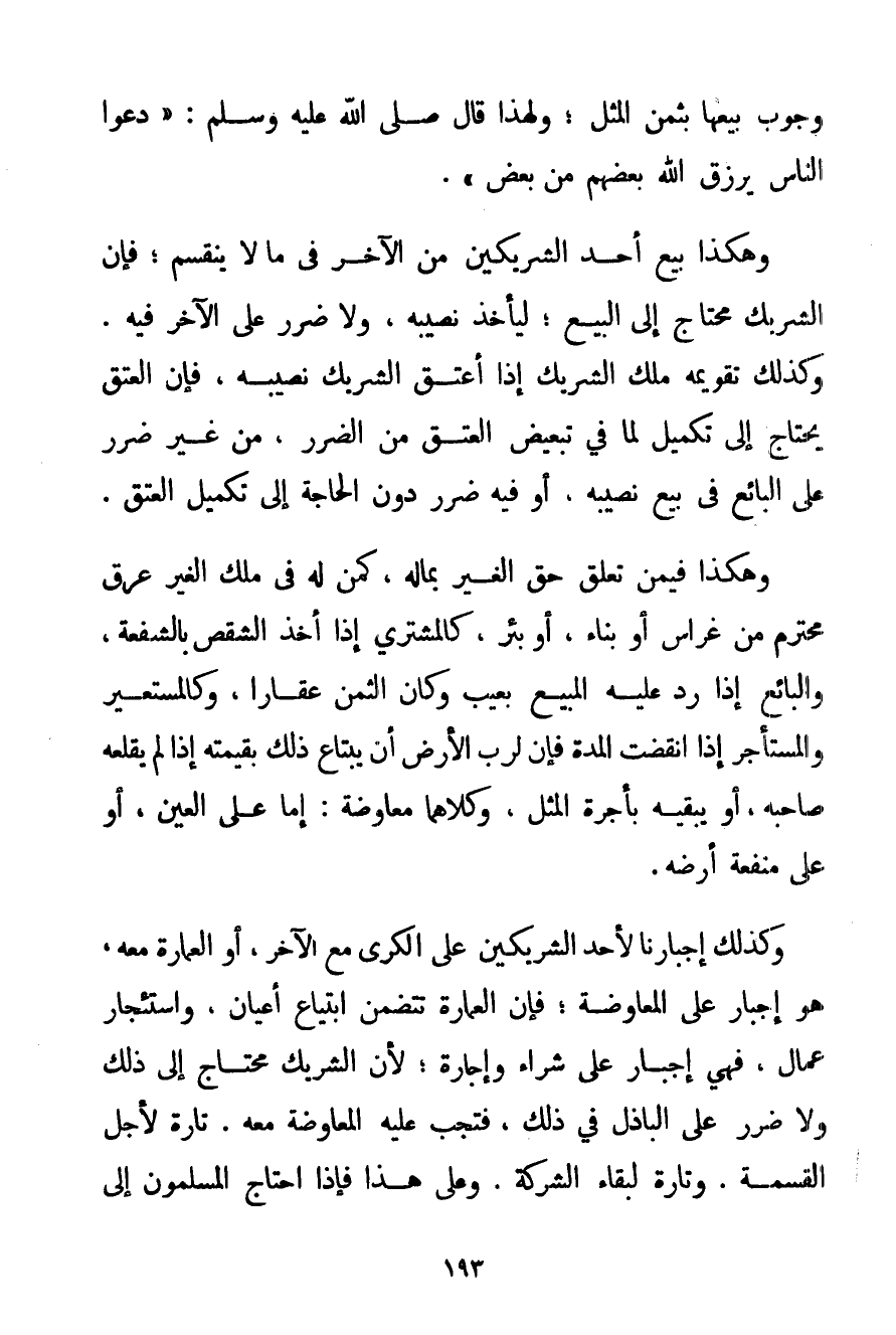 وُجُوبِ بَيْعِهَا بِثَمَنِ الْمِثْلِ؛ وَلِهَذَا قَالَ صَلَّى اللَّهُ عَلَيْهِ وَسَلَّمَ {دَعُوا النَّاسَ يَرْزُقُ اللَّهُ بَعْضَهُمْ مِنْ بَعْضٍ} . وَهَكَذَا بَيْعُ أَحَدِ الشَّرِيكَيْنِ مِنْ الْآخَرِ فِي مَا لَا يَنْقَسِمُ؛ فَإِنَّ الشَّرِيكَ مُحْتَاجٌ إلَى الْبَيْعِ؛ لِيَأْخُذَ نَصِيبَهُ وَلَا ضَرَرَ عَلَى الْآخَرِ فِيهِ. وَكَذَلِكَ تَقْوِيمُهُ مِلْكَ الشَّرِيكِ إذَا أَعْتَقَ الشَّرِيكُ نَصِيبَهُ فَإِنَّ الْعِتْقَ يَحْتَاجُ إلَى تَكْمِيلٍ لِمَا فِي تَبْعِيضِ الْعِتْقِ مِنْ الضَّرَرِ مِنْ غَيْرِ ضَرَرٍ عَلَى الْبَائِعِ فِي بَيْعِ نَصِيبِهِ أَوْ فِيهِ ضَرَرٌ دُونَ الْحَاجَةِ إلَى تَكْمِيلِ الْعِتْقِ. وَهَكَذَا فِيمَنْ تَعَلَّقَ حَقُّ الْغَيْرِ بِمَالِهِ كَمَنْ لَهُ فِي مِلْكِ الْغَيْرِ عَرَقٌ مُحْتَرَمٌ مِنْ غِرَاسٍ أَوْ بِنَاءٍ أَوْ بِئْرٍ كَالْمُشْتَرِي إذَا أَخَذَ الشِّقْصَ بِالشُّفْعَةِ وَالْبَائِعِ إذَا رَدَّ عَلَيْهِ الْمَبِيعَ بِعَيْبٍ وَكَانَ الثَّمَنُ عَقَارًا وَكَالْمُسْتَعِيرِ وَالْمُسْتَأْجِرِ إذَا انْقَضَتْ الْمُدَّةُ فَإِنَّ لِرَبِّ الْأَرْضِ أَنْ يَبْتَاعَ ذَلِكَ بِقِيمَتِهِ إذَا لَمْ يُقْلِعْهُ صَاحِبُهُ أَوْ يُبْقِيهِ بِأُجْرَةِ الْمِثْلِ وَكِلَاهُمَا مُعَاوَضَةٌ: إمَّا عَلَى الْعَيْنِ أَوْ عَلَى مَنْفَعَةِ أَرْضِهِ. وَكَذَلِكَ إجْبَارُنَا لِأَحَدِ الشَّرِيكَيْنِ عَلَى الْكَرْيِ مَعَ الْآخَرِ أَوْ الْعِمَارَةِ مَعَهُ هُوَ إجْبَارٌ عَلَى الْمُعَاوَضَةِ؛ فَإِنَّ الْعِمَارَةَ تَتَضَمَّنُ ابْتِيَاعَ أَعْيَانٍ وَاسْتِئْجَارَ عُمَّالٍ فَهِيَ إجْبَارٌ عَلَى شِرَاءٍ وَإِجَارَةٍ؛ لِأَنَّ الشَّرِيكَ مُحْتَاجٌ إلَى ذَلِكَ وَلَا ضَرَرَ عَلَى الْبَاذِلِ فِي ذَلِكَ فَتَجِبُ عَلَيْهِ الْمُعَاوَضَةُ مَعَهُ. تَارَةً لِأَجْلِ الْقِسْمَةِ. وَتَارَةً لِبَقَاءِ الشَّرِكَةِ. وَعَلَى هَذَا فَإِذَا احْتَاجَ الْمُسْلِمُونَ إلَى
