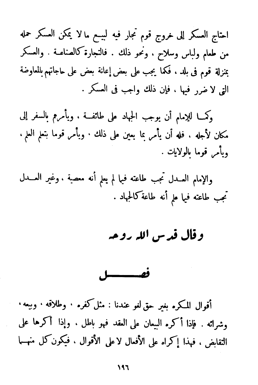 احْتَاجَ الْعَسْكَرُ إلَى خُرُوجِ قَوْمٍ تُجَّارٍ فِيهِ لِبَيْعِ مَا لَا يُمْكِنُ الْعَسْكَرُ حَمْلَهُ مِنْ طَعَامٍ وَلِبَاسٍ وَسِلَاحٍ وَنَحْوِ ذَلِكَ. فَالتِّجَارَةُ كَالصِّنَاعَةِ. وَالْعَسْكَرُ بِمَنْزِلَةِ قَوْمٍ فِي بَلَدٍ فَكَمَا يَجِبُ عَلَى بَعْضٍ إعَانَةُ بَعْضٍ عَلَى حَاجَاتِهِمْ بِالْمُعَاوَضَةِ الَّتِي لَا ضَرَرَ فِيهَا فَإِنَّ ذَلِكَ وَاجِبٌ فِي الْعَسْكَرِ. وَكَمَا لِلْإِمَامِ أَنْ يُوجِبَ الْجِهَادَ عَلَى طَائِفَةٍ وَيَأْمُرَهُمْ بِالسَّفَرِ إلَى مَكَانٍ لِأَجْلِهِ فَلَهُ أَنْ يَأْمُرَ بِمَا يُعِينُ عَلَى ذَلِكَ وَيَأْمُرَ قَوْمًا بِتَعَلُّمِ الْعِلْمِ وَيَأْمُرَ قَوْمًا بِالْوِلَايَاتِ. وَالْإِمَامُ الْعَدْلُ تَجِبُ طَاعَتُهُ فِيمَا لَمْ يُعْلَمْ أَنَّهُ مَعْصِيَةٌ وَغَيْرُ الْعَدْلِ تَجِبُ طَاعَتُهُ فِيمَا عُلِمَ أَنَّهُ طَاعَةٌ كَالْجِهَادِ.