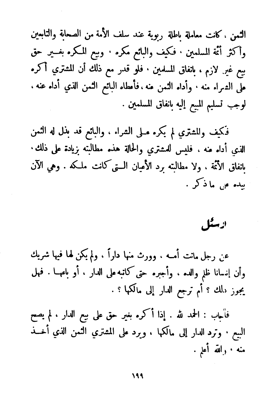 الثَّمَنِ كَانَتْ مُعَامَلَةً بَاطِلَةً رِبَوِيَّةً عِنْدَ سَلَفِ الْأُمَّةِ مِنْ الصَّحَابَةِ وَالتَّابِعِينَ وَأَكْثَرِ أَئِمَّةِ الْمُسْلِمِينَ فَكَيْفَ وَالْبَائِعُ مُكْرَهٌ وَبَيْعُ الْمُكْرَهِ بِغَيْرِ حَقٍّ بَيْعٌ غَيْرُ لَازِمٍ بِاتِّفَاقِ الْمُسْلِمِينَ فَلَوْ قُدِّرَ مَعَ ذَلِكَ أَنَّ الْمُشْتَرِيَ أُكْرِهَ عَلَى الشِّرَاءِ مِنْهُ وَأَدَّاهُ الثَّمَنَ عَنْهُ فَأَعْطَاهُ الْبَائِعُ الثَّمَنَ الَّذِي أَدَّاهُ عَنْهُ لَوَجَبَ تَسْلِيمُ الْمَبِيعِ إلَيْهِ بِاتِّفَاقِ الْمُسْلِمِينَ. فَكَيْفَ وَالْمُشْتَرِي لَمْ يُكْرَهْ عَلَى الشِّرَاءِ وَالْبَائِعُ قَدْ بَذَلَ لَهُ الثَّمَنَ الَّذِي أَدَّاهُ عَنْهُ فَلَيْسَ لِلْمُشْتَرِي وَالْحَالَةُ هَذِهِ مُطَالَبَتُهُ بِزِيَادَةٍ عَلَى ذَلِكَ بِاتِّفَاقِ الْأَئِمَّةِ وَلَا مُطَالَبَتُهُ بِرَدِّ الْأَعْيَانِ الَّتِي كَانَتْ مِلْكَهُ. وَهِيَ الْآنَ بِيَدِهِ عَلَى مَا ذُكِرَ.