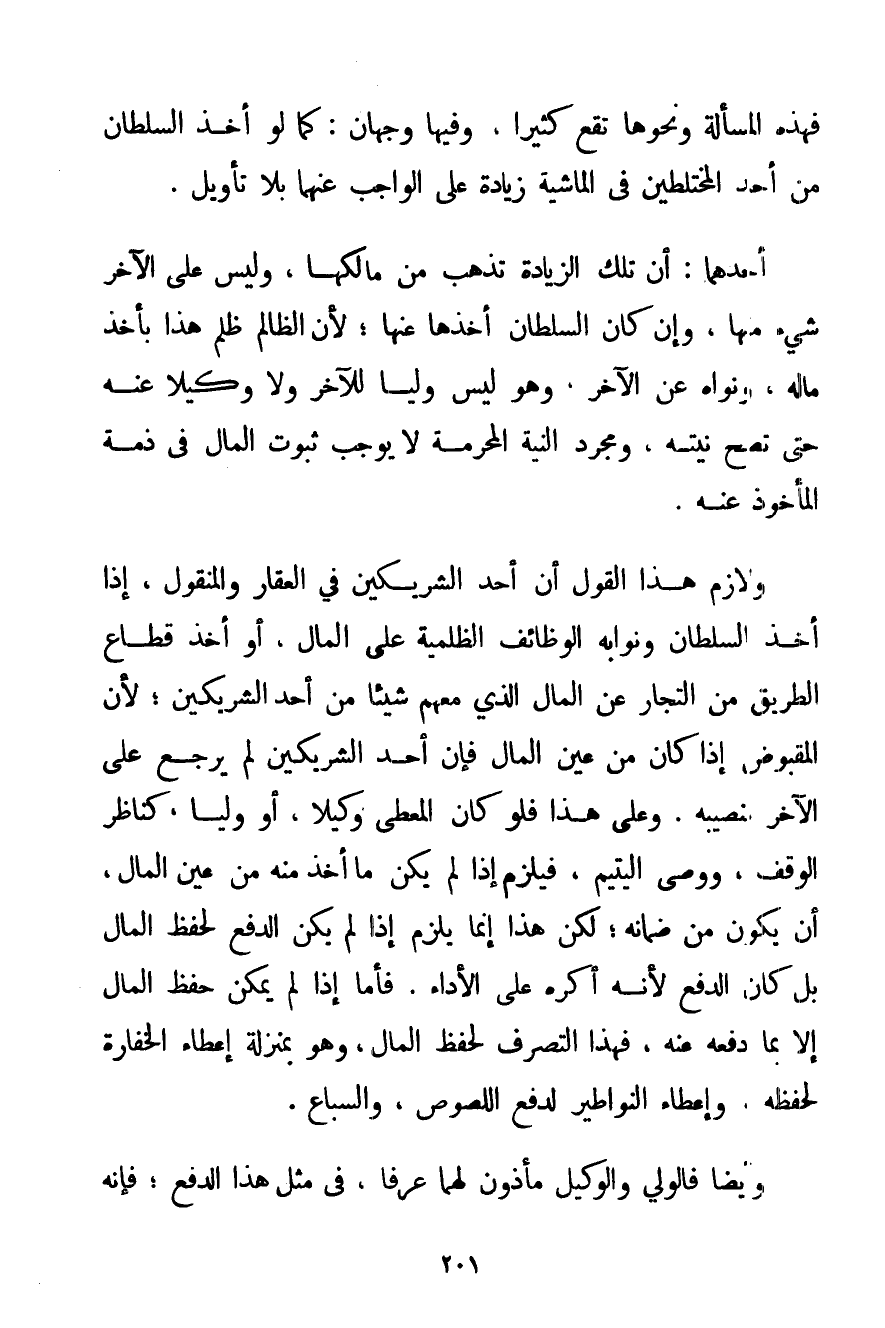 فَهَذِهِ الْمَسْأَلَةُ وَنَحْوُهَا تَقَعُ كَثِيرًا وَفِيهَا وَجْهَانِ: كَمَا لَوْ أَخَذَ السُّلْطَانُ مِنْ أَحَدِ الْمُخْتَلِطَيْنِ فِي الْمَاشِيَةِ زِيَادَةً عَلَى الْوَاجِبِ عَنْهُمَا بِلَا تَأْوِيلٍ. أَحَدُهُمَا: أَنَّ تِلْكَ الزِّيَادَةَ تَذْهَبُ مِنْ مَالِكِهَا وَلَيْسَ عَلَى الْآخَرِ شَيْءٌ مِنْهَا وَإِنْ كَانَ السُّلْطَانُ أَخَذَهَا عَنْهَا؛ لِأَنَّ الظَّالِمَ ظَلَمَ هَذَا بِأَخْذِ مَالِهِ وَنَوَاهُ عَنْ الْآخَرِ وَهُوَ لَيْسَ وَلِيًّا لِلْآخَرِ وَلَا وَكِيلًا عَنْهُ حَتَّى تَصِحَّ نِيَّتُهُ وَمُجَرَّدُ النِّيَّةِ الْمُحَرَّمَةِ لَا يُوجِبُ ثُبُوتَ الْمَالِ فِي ذِمَّةِ الْمَأْخُوذِ عَنْهُ. وَلَازِمُ هَذَا الْقَوْلِ أَنَّ أَحَدَ الشَّرِيكَيْنِ فِي الْعَقَارِ وَالْمَنْقُولِ إذَا أَخَذَ السُّلْطَانُ وَنُوَّابُهُ الْوَظَائِفَ الظلمية عَلَى الْمَالِ أَوْ أَخَذَ قُطَّاعُ الطَّرِيقِ مِنْ التُّجَّارِ عَنْ الْمَالِ الَّذِي مَعَهُمْ شَيْئًا مِنْ أَحَدِ الشَّرِيكَيْنِ؛ لِأَنَّ الْمَقْبُوضَ إذَا كَانَ مِنْ عَيْنِ الْمَالِ فَإِنَّ أَحَدَ الشَّرِيكَيْنِ لَمْ يَرْجِعْ عَلَى الْآخَرِ بِنَصِيبِهِ. وَعَلَى هَذَا فَلَوْ كَانَ الْمُعْطِي وَكِيلًا أَوْ وَلِيًّا كَنَاظِرِ الْوَقْفِ وَوَصِيِّ الْيَتِيمِ فَيَلْزَمُ إذَا لَمْ يَكُنْ مَا أَخَذَ مِنْهُ مِنْ عَيْنِ الْمَالِ أَنْ يَكُونَ مِنْ ضَمَانِهِ؛ لَكِنَّ هَذَا إنَّمَا يَلْزَمُ إذَا لَمْ يَكُنْ الدَّفْعُ لِحِفْظِ الْمَالِ بَلْ كَانَ الدَّفْعُ لِأَنَّهُ أُكْرِهَ عَلَى الْأَدَاءِ. فَأَمَّا إذَا لَمْ يُمْكِنْ حِفْظُ الْمَالِ إلَّا بِمَا دَفَعَهُ عَنْهُ فَهَذَا التَّصَرُّفُ لِحِفْظِ الْمَالِ وَهُوَ بِمَنْزِلَةِ إعْطَاءِ الْخِفَارَةِ لِحِفْظِهِ وَإِعْطَاءِ النَّوَاطِيرِ لِدَفْعِ اللُّصُوصِ وَالسِّبَاعِ. وَأَيْضًا فَالْوَلِيُّ وَالْوَكِيلُ مَأْذُونٌ لَهُمَا عُرْفًا فِي مِثْلِ هَذَا الدَّفْعِ؛ فَإِنَّهُ