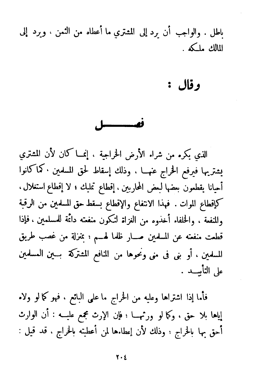 الَّذِي يُكْرَهُ مِنْ شِرَاءِ الْأَرْضِ الخراجية إنَّمَا كَانَ لِأَنَّ الْمُشْتَرِيَ يَشْتَرِيهَا فَيَرْفَعُ الْخَرَاجَ عَنْهَا وَذَلِكَ إسْقَاطٌ لِحَقِّ الْمُسْلِمِينَ كَمَا كَانُوا أَحْيَانًا يَقْطَعُونَ بَعْضَهَا لِبَعْضِ الْمُحَارِبِينَ إقْطَاعَ تَمْلِيكٍ؛ لَا إقْطَاعَ اسْتِغْلَالٍ كَإِقْطَاعِ الْمَوَاتِ، فَهَذَا الِانْتِفَاعُ وَالْإِقْطَاعُ يُسْقِطُ حَقَّ الْمُسْلِمِينَ مِنْ الرَّقَبَةِ وَالْمَنْفَعَةِ وَالْخُلَفَاءُ أَخَذُوهُ مِنْ الْغُزَاةِ لِتَكُونَ مَنْفَعَتُهُ دَائِمَةً لِلْمُسْلِمِينَ فَإِذَا قُطِعَتْ مَنْفَعَتُهُ عَنْ الْمُسْلِمِينَ صَارَ ظُلْمًا لَهُمْ؛ بِمَنْزِلَةِ مَنْ غَصَبَ طَرِيقَ الْمُسْلِمِينَ أَوْ بَنَى فِي مِنًى وَنَحْوِهَا مِنْ الْمَنَافِعِ الْمُشْتَرَكَةِ بَيْنَ الْمُسْلِمِينَ عَلَى التَّأْبِيدِ. فَأَمَّا إذَا اشْتَرَاهَا وَعَلَيْهِ مِنْ الْخَرَاجِ مَا عَلَى الْبَائِعِ فَهُوَ كَمَا لَوْ وَلَّاهُ إيَّاهَا بِلَا حَقٍّ وَكَمَا لَوْ وَرِثَهَا؛ فَإِنَّ الْإِرْثَ مُجْمَعٌ عَلَيْهِ: أَنَّ الْوَارِثَ أَحَقُّ بِهَا بِالْخَرَاجِ؛ وَذَلِكَ لِأَنَّ إعْطَاءَهَا لِمَنْ أَعْطَيْته بِالْخَرَاجِ قَدْ قِيلَ:
