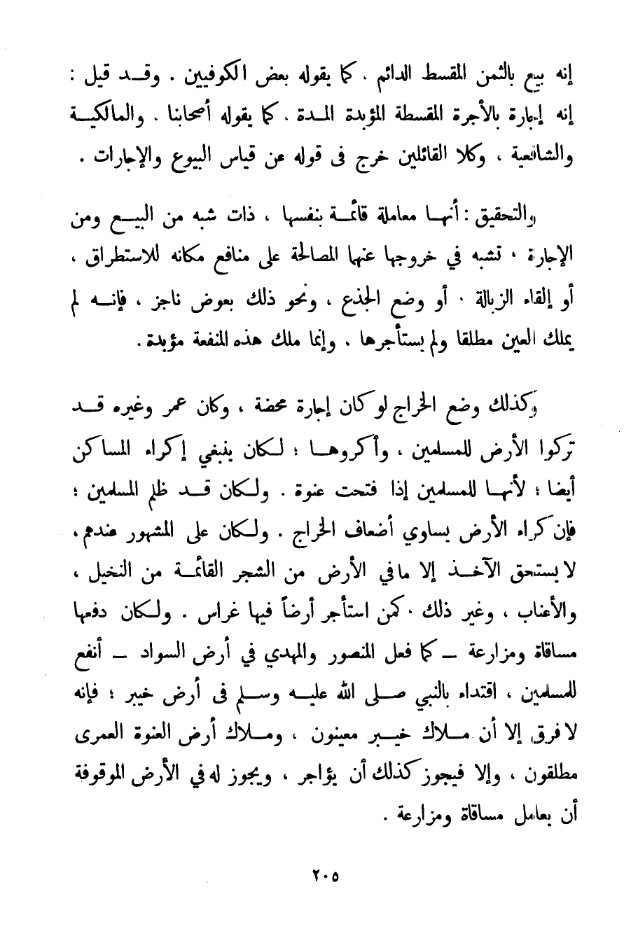 إنَّهُ بَيْعٌ بِالثَّمَنِ الْمُقَسَّطِ الدَّائِمِ كَمَا يَقُولُهُ بَعْضُ الْكُوفِيِّينَ. وَقَدْ قِيلَ: إنَّهُ إجَارَةٌ بِالْأُجْرَةِ الْمُقَسَّطَةِ الْمُؤَبَّدَةِ الْمُدَّةِ كَمَا يَقُولُهُ أَصْحَابُنَا وَالْمَالِكِيَّةُ وَالشَّافِعِيَّةُ وَكِلَا الْقَائِلِينَ خَرَجَ فِي قَوْلِهِ عَنْ قِيَاسِ الْبُيُوعِ وَالْإِجَارَاتِ. وَالتَّحْقِيقُ: أَنَّهَا مُعَامَلَةٌ قَائِمَةٌ بِنَفْسِهَا ذَاتُ شَبَهٍ مِنْ الْبَيْعِ وَمِنْ الْإِجَارَةِ تُشْبِهُ فِي خُرُوجِهَا عَنْهُمَا الْمُصَالَحَةَ عَلَى مَنَافِعِ مَكَانِهِ لِلِاسْتِطْرَاقِ أَوْ إلْقَاءِ الزُّبَالَةِ أَوْ وَضْعِ الْجِذْعِ وَنَحْوِ ذَلِكَ بِعِوَضٍ نَاجِزٍ فَإِنَّهُ لَمْ يَمْلِكْ الْعَيْنَ مُطْلَقًا وَلَمْ يَسْتَأْجِرْهَا وَإِنَّمَا مَلَكَ هَذِهِ الْمَنْفَعَةَ مُؤَبَّدَةً. وَكَذَلِكَ وَضْعُ الْخَرَاجِ لَوْ كَانَ إجَارَةً مَحْضَةً وَكَانَ عُمَرُ وَغَيْرُهُ قَدْ تَرَكُوا الْأَرْضَ لِلْمُسْلِمِينَ وَأَكْرُوهَا؛ لَكَانَ يَنْبَغِي إكْرَاءُ الْمَسَاكِنِ أَيْضًا؛ لِأَنَّهَا لِلْمُسْلِمِينَ إذَا فُتِحَتْ عَنْوَةً. وَلَكَانَ قَدْ ظَلَمَ الْمُسْلِمِينَ؛ فَإِنَّ كِرَاءَ الْأَرْضِ يُسَاوِي أَضْعَافَ الْخَرَاجِ. وَلَكَانَ عَلَى الْمَشْهُورِ عِنْدَهُمْ لَا يَسْتَحِقُّ الْآخِذُ إلَّا مَا فِي الْأَرْضِ مِنْ الشَّجَرِ الْقَائِمَةِ مِنْ النَّخِيلِ وَالْأَعْنَابِ وَغَيْرِ ذَلِكَ كَمَنْ اسْتَأْجَرَ أَرْضًا فِيهَا غِرَاسٌ. وَلَكَانَ دَفَعَهَا مُسَاقَاةً وَمُزَارَعَةً - كَمَا فَعَلَ الْمَنْصُورُ وَالْمَهْدِيُّ فِي أَرْضِ السَّوَادِ - أَنْفَعَ لِلْمُسْلِمِينَ اقْتِدَاءً بِالنَّبِيِّ صَلَّى اللَّهُ عَلَيْهِ وَسَلَّمَ فِي أَرْضِ خَيْبَرَ؛ فَإِنَّهُ لَا فَرْقَ إلَّا أَنَّ مُلَّاكَ خَيْبَرَ مُعَيَّنُونَ وَمُلَّاكَ أَرْضِ الْعَنْوَةِ الْعُمْرَى مُطْلَقُونَ وَإِلَّا فَيَجُوزُ كَذَلِكَ أَنْ يُؤَاجِرَ وَيَجُوزُ لَهُ فِي الْأَرْضِ الْمَوْقُوفَةِ أَنْ يُعَامَلَ مُسَاقَاةً وَمُزَارَعَةً.