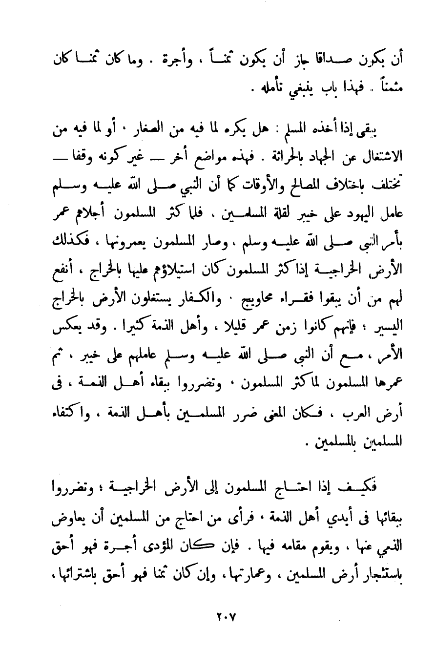 أَنْ يَكُونَ صَدَاقًا جَازَ أَنْ يَكُونَ ثَمَنًا وَأُجْرَةً. وَمَا كَانَ ثَمَنًا كَانَ مُثَمَّنًا. فَهَذَا بَابٌ يَنْبَغِي تَأَمُّلُهُ. يَبْقَى إذَا أَخَذَهُ الْمُسْلِمُ: هَلْ يُكْرَهُ لِمَا فِيهِ مِنْ الصَّغَارِ أَوْ لِمَا فِيهِ مِنْ الِاشْتِغَالِ عَنْ الْجِهَادِ بِالْحِرَاثَةِ. فَهَذِهِ مَوَاضِعُ أُخَرُ - غَيْرُ كَوْنِهِ وَقْفًا - تَخْتَلِفُ بِاخْتِلَافِ الْمَصَالِحِ وَالْأَوْقَاتِ كَمَا {أَنَّ النَّبِيَّ صَلَّى اللَّهُ عَلَيْهِ وَسَلَّمَ عَامَلَ الْيَهُودَ عَلَى خَيْبَرَ لِقِلَّةِ الْمُسْلِمِينَ فَلَمَّا كَثُرَ الْمُسْلِمُونَ أَجْلَاهُمْ عُمَرُ بِأَمْرِ النَّبِيِّ صَلَّى اللَّهُ عَلَيْهِ وَسَلَّمَ وَصَارَ الْمُسْلِمُونَ يُعَمِّرُونَهَا} فَكَذَلِكَ الْأَرْضُ الخراجية إذَا كَثُرَ الْمُسْلِمُونَ كَانَ اسْتِيلَاؤُهُمْ عَلَيْهَا بِالْخَرَاجِ أَنْفَعَ لَهُمْ مِنْ أَنْ يَبْقَوْا فُقَرَاءَ مَحَاوِيجَ وَالْكُفَّارُ يَسْتَغِلُّونَ الْأَرْضَ بِالْخَرَاجِ الْيَسِيرِ؛ فَإِنَّهُمْ كَانُوا زَمَنَ عُمَرَ قَلِيلًا وَأَهْلُ الذِّمَّةِ كَثِيرًا. وَقَدْ يُعْكَسُ الْأَمْرُ مَعَ أَنَّ النَّبِيَّ صَلَّى اللَّهُ عَلَيْهِ وَسَلَّمَ عَامَلَهُمْ عَلَى خَيْبَرَ ثُمَّ عَمَّرَهَا الْمُسْلِمُونَ لَمَّا كَثُرَ الْمُسْلِمُونَ وَتَضَرَّرُوا بِبَقَاءِ أَهْلِ الذِّمَّةِ فِي أَرْضِ الْعَرَبِ فَكَانَ الْمَعْنَى ضَرَرَ الْمُسْلِمِينَ بِأَهْلِ الذِّمَّةِ وَاكْتِفَاءِ الْمُسْلِمِينَ بِالْمُسْلِمِينَ. فَكَيْفَ إذَا احْتَاجَ الْمُسْلِمُونَ إلَى الْأَرْضِ الخراجية؛ وَتَضَرَّرُوا بِبَقَائِهَا فِي أَيْدِي أَهْلِ الذِّمَّةِ فَرَأَى مَنْ احْتَاجَ مِنْ الْمُسْلِمِينَ أَنْ يُعَاوِضَ الذِّمِّيَّ عَنْهَا وَيَقُومَ مَقَامَهُ فِيهَا. فَإِنْ كَانَ الْمُؤَدَّى أُجْرَةً فَهُوَ أَحَقُّ بِاسْتِئْجَارِ أَرْضِ الْمُسْلِمِينَ وَعِمَارَتِهَا وَإِنْ كَانَ ثَمَنًا فَهُوَ أَحَقُّ بِاشْتِرَائِهَا