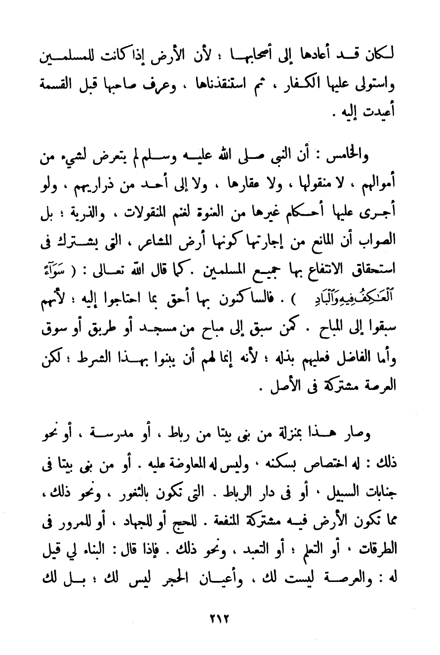 لَكَانَ قَدْ أَعَادَهَا إلَى أَصْحَابِهَا؛ لِأَنَّ الْأَرْضَ إذَا كَانَتْ لِلْمُسْلِمِينَ وَاسْتَوْلَى عَلَيْهَا الْكُفَّارُ ثُمَّ اسْتَنْقَذْنَاهَا وَعُرِفَ صَاحِبُهَا قَبْلَ الْقِسْمَةِ أُعِيدَتْ إلَيْهِ. وَالْخَامِسُ: أَنَّ النَّبِيَّ صَلَّى اللَّهُ عَلَيْهِ وَسَلَّمَ لَمْ يَتَعَرَّضْ لِشَيْءٍ مِنْ أَمْوَالِهِمْ لَا مَنْقُولِهَا وَلَا عَقَارِهَا وَلَا إلَى أَحَدٍ مِنْ ذَرَارِيِّهِمْ وَلَوْ أَجْرَى عَلَيْهَا أَحْكَامَ غَيْرِهَا مِنْ الْعَنْوَةِ لَغَنِمَ الْمَنْقُولَاتِ وَالذُّرِّيَّةَ؛ بَلْ الصَّوَابُ أَنَّ الْمَانِعَ مِنْ إجَارَتِهَا كَوْنُهَا أَرْضَ الْمَشَاعِرِ الَّتِي يَشْتَرِكُ فِي اسْتِحْقَاقِ الِانْتِفَاعِ بِهَا جَمِيعُ الْمُسْلِمِينَ. كَمَا قَالَ اللَّهُ تَعَالَى: {سَوَاءً الْعَاكِفُ فِيهِ وَالْبَادِ} . فَالسَّاكِنُونَ بِهَا أَحَقُّ بِمَا احْتَاجُوا إلَيْهِ؛ لِأَنَّهُمْ سَبَقُوا إلَى الْمُبَاحِ. كَمَنْ سَبَقَ إلَى مُبَاحٍ مِنْ مَسْجِدٍ أَوْ طَرِيقٍ أَوْ سُوقٍ وَأَمَّا الْفَاضِلُ فَعَلَيْهِمْ بَذْلُهُ؛ لِأَنَّهُ إنَّمَا لَهُمْ أَنْ يَبْنُوا بِهَذَا الشَّرْطِ؛ لَكِنَّ الْعَرْصَةَ مُشْتَرَكَةٌ فِي الْأَصْلِ. وَصَارَ هَذَا بِمَنْزِلَةِ مَنْ بَنَى بَيْتًا مِنْ رِبَاطٍ أَوْ مَدْرَسَةٍ أَوْ نَحْوِ ذَلِكَ: لَهُ اخْتِصَاصٌ بِسُكْنِهِ وَلَيْسَ لَهُ الْمُعَاوَضَةُ عَلَيْهِ. أَوْ مَنْ بَنَى بَيْتًا فِي جنابات السَّبِيلِ أَوْ فِي دَارِ الرِّبَاطِ الَّتِي تَكُونُ بِالثُّغُورِ وَنَحْوِ ذَلِكَ مِمَّا تَكُونُ الْأَرْضُ فِيهِ مُشْتَرَكَةَ الْمَنْفَعَةِ لِلْحَجِّ أَوْ لِلْجِهَادِ أَوْ لِلْمُرُورِ فِي الطُّرُقَاتِ أَوْ التَّعَلُّمِ؛ أَوْ التَّعَبُّدِ وَنَحْوِ ذَلِكَ. فَإِذَا قَالَ: الْبِنَاءُ لِي قِيلَ لَهُ: وَالْعَرْصَةُ لَيْسَتْ لَك وَأَعْيَانُ الْحَجَرِ لَيْسَ لَك؛ بَلْ لَك