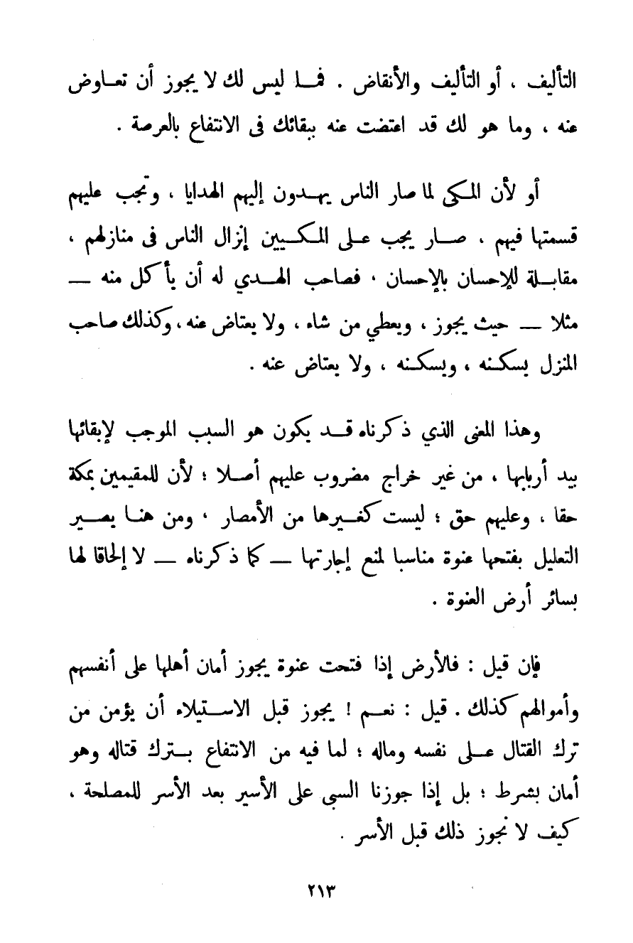 التَّأْلِيفُ أَوْ التَّأْلِيفُ وَالْأَنْقَاضُ. فَمَا لَيْسَ لَك لَا يَجُوزُ أَنْ تُعَاوِضَ عَنْهُ وَمَا هُوَ لَك قَدْ اعتضت عَنْهُ بِبَقَائِك فِي الِانْتِفَاعِ بِالْعَرْصَةِ. أَوْ لِأَنَّ الْمَكِّيَّ لَمَّا صَارَ النَّاسُ يَهْدُونَ إلَيْهِمْ الْهَدَايَا وَتَجِبُ عَلَيْهِمْ قِسْمَتُهَا فِيهِمْ صَارَ يَجِبُ عَلَى الْمَكِّيِّينَ إنْزَالُ النَّاسِ فِي مَنَازِلِهِمْ مُقَابَلَةً لِلْإِحْسَانِ بِالْإِحْسَانِ فَصَاحِبُ الْهَدْيِ لَهُ أَنْ يَأْكُلَ مِنْهُ - مَثَلًا - حَيْثُ يَجُوزُ وَيُعْطِيَ مَنْ شَاءَ وَلَا يَعْتَاضَ عَنْهُ وَكَذَلِكَ صَاحِبُ الْمَنْزِلِ يَسْكُنُهُ وَيُسْكِنُهُ وَلَا يَعْتَاضُ عَنْهُ. وَهَذَا الْمَعْنَى الَّذِي ذَكَرْنَاهُ قَدْ يَكُونُ هُوَ السَّبَبَ الْمُوجِبَ لِإِبْقَائِهَا بِيَدِ أَرْبَابِهَا مِنْ غَيْرِ خَرَاجٍ مَضْرُوبٍ عَلَيْهِمْ أَصْلًا؛ لِأَنَّ لِلْمُقِيمِينَ بِمَكَّةَ حَقًّا وَعَلَيْهِمْ حَقٌّ؛ لَيْسَتْ كَغَيْرِهَا مِنْ الْأَمْصَارِ وَمِنْ هُنَا يَصِيرُ التَّعْلِيلُ بِفَتْحِهَا عَنْوَةً مُنَاسِبًا لِمَنْعِ إجَارَتِهَا - كَمَا ذَكَرْنَاهُ - لَا إلْحَاقًا لَهَا بِسَائِرِ أَرْضِ الْعَنْوَةِ. فَإِنْ قِيلَ: فَالْأَرْضُ إذَا فُتِحَتْ عَنْوَةً يَجُوزُ أَمَانُ أَهْلِهَا عَلَى أَنْفُسِهِمْ وَأَمْوَالِهِمْ كَذَلِكَ. قِيلَ: نَعَمْ يَجُوزُ قَبْلَ الِاسْتِيلَاءِ أَنْ يُؤَمَّنَ مَنْ تَرَكَ الْقِتَالَ عَلَى نَفْسِهِ وَمَالِهِ؛ لِمَا فِيهِ مِنْ الِانْتِفَاعِ بِتَرْكِ قِتَالِهِ وَهُوَ أَمَانٌ بِشَرْطِ؛ بَلْ إذَا جَوَّزْنَا السَّبْيَ عَلَى الْأَسِيرِ بَعْدَ الْأَسْرِ لِلْمَصْلَحَةِ كَيْفَ لَا نُجَوِّزُ ذَلِكَ قَبْلَ الْأَسْرِ.