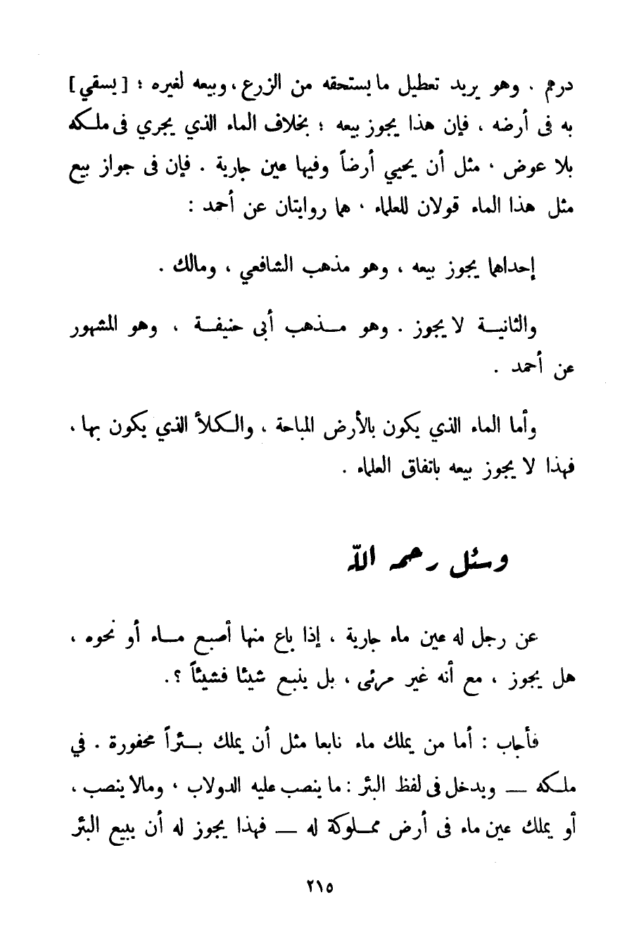دِرْهَمٍ وَهُوَ يُرِيدُ تَعْطِيلَ مَا يَسْتَحِقُّهُ مِنْ الزَّرْعِ وَبَيْعَهُ لِغَيْرِهِ؛ يَسْقِي بِهِ فِي أَرْضِهِ فَإِنَّ هَذَا يَجُوزُ بَيْعُهُ؛ بِخِلَافِ الْمَاءِ الَّذِي يَجْرِي فِي مِلْكِهِ بِلَا عِوَضٍ مِثْلَ أَنْ يُحْيِيَ أَرْضًا وَفِيهَا عَيْنٌ جَارِيَةٌ. فَإِنَّ فِي جَوَازِ بَيْعِ مِثْلِ هَذَا الْمَاءِ قَوْلَيْنِ لِلْعُلَمَاءِ هُمَا رِوَايَتَانِ عَنْ أَحْمَد: إحْدَاهُمَا يَجُوزُ بَيْعُهُ وَهُوَ مَذْهَبُ الشَّافِعِيِّ وَمَالِكٍ. وَالثَّانِيَةُ لَا يَجُوزُ. وَهُوَ مَذْهَبُ أَبِي حَنِيفَةَ وَهُوَ الْمَشْهُورُ عَنْ أَحْمَد. وَأَمَّا الْمَاءُ الَّذِي يَكُونُ بِالْأَرْضِ الْمُبَاحَةِ وَالْكَلَأِ الَّذِي يَكُونُ بِهَا فَهَذَا لَا يَجُوزُ بَيْعُهُ بِاتِّفَاقِ الْعُلَمَاءِ.