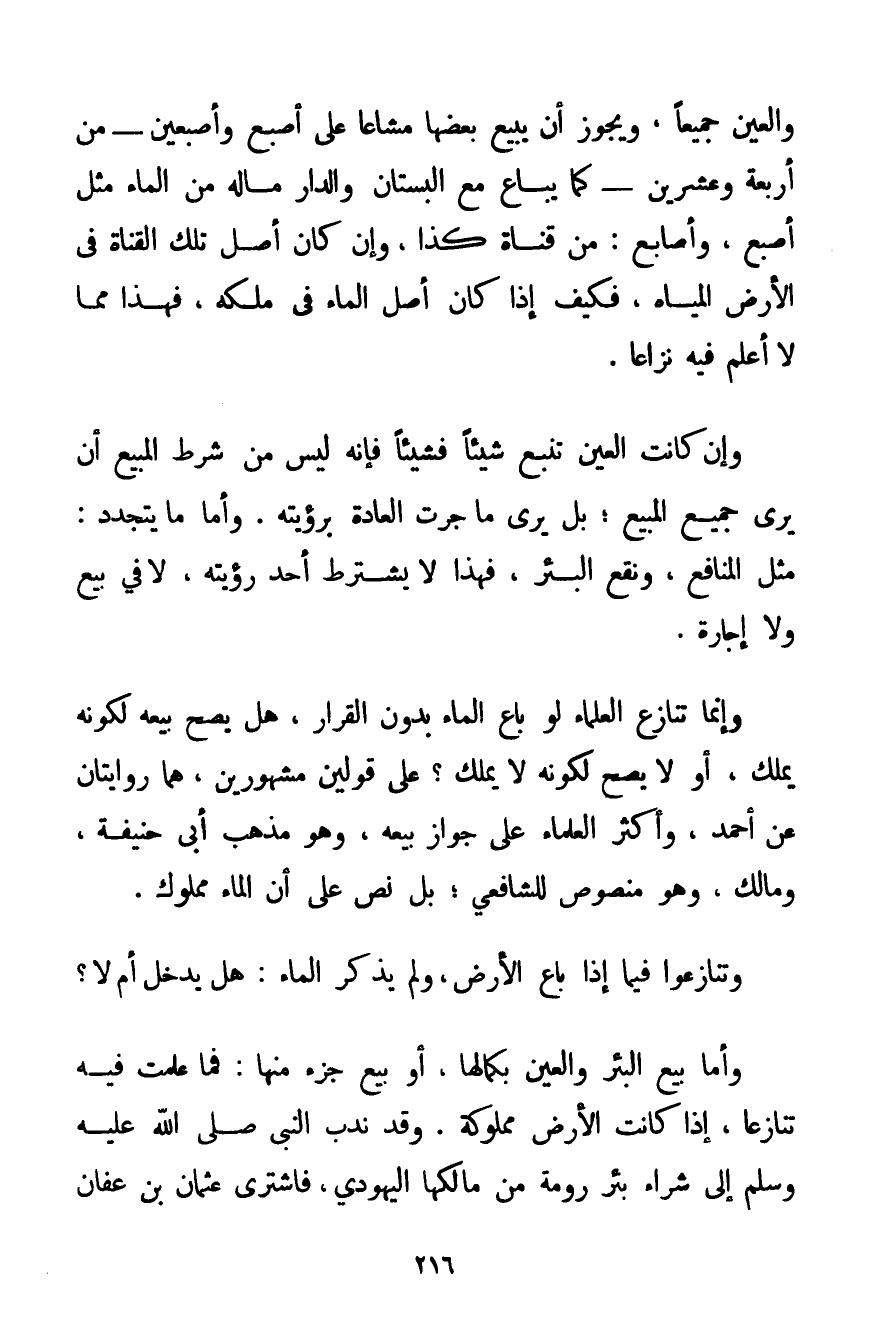 وَالْعَيْنَ جَمِيعًا وَيَجُوزُ أَنْ يَبِيعَ بَعْضَهَا مُشَاعًا عَلَى أُصْبُعٍ وَأُصْبُعَيْنِ - مِنْ أَرْبَعَةٍ وَعِشْرِينَ - كَمَا يُبَاعُ مَعَ الْبُسْتَانِ وَالدَّارُ مَا لَهُ مِنْ الْمَاءِ مِثْلُ أُصْبُعٍ وَأَصَابِعَ: مِنْ قَنَاةِ كَذَا وَإِنْ كَانَ أَصْلُ تِلْكَ الْقَنَاةِ فِي الْأَرْضِ الْمِيَاهَ فَكَيْفَ إذَا كَانَ أَصْلُ الْمَاءِ فِي مِلْكِهِ فَهَذَا مِمَّا لَا أَعْلَمُ فِيهِ نِزَاعًا. وَإِنْ كَانَتْ الْعَيْنُ تَنْبُعُ شَيْئًا فَشَيْئًا فَإِنَّهُ لَيْسَ مِنْ شَرْطِ الْمَبِيعِ أَنْ يَرَى جَمِيعَ الْمَبِيعِ؛ بَلْ يَرَى مَا جَرَتْ الْعَادَةُ بِرُؤْيَتِهِ. وَأَمَّا مَا يَتَجَدَّدُ: مِثْلُ الْمَنَافِعِ وَنَقْعِ الْبِئْرِ فَهَذَا لَا يَشْتَرِطُ أَحَدٌ رُؤْيَتَهُ لَا فِي بَيْعٍ وَلَا إجَارَةٍ. وَإِنَّمَا تَنَازَعَ الْعُلَمَاءُ لَوْ بَاعَ الْمَاءَ بِدُونِ الْقَرَارِ هَلْ يَصِحُّ بَيْعُهُ لِكَوْنِهِ يَمْلِكُ أَوْ لَا يَصِحُّ لِكَوْنِهِ لَا يَمْلِكُ؟ عَلَى قَوْلَيْنِ مَشْهُورَيْنِ هُمَا رِوَايَتَانِ عَنْ أَحْمَد وَأَكْثَرُ الْعُلَمَاءِ عَلَى جَوَازِ بَيْعِهِ وَهُوَ مَذْهَبُ أَبِي حَنِيفَةَ وَمَالِكٍ وَهُوَ مَنْصُوصٌ لِلشَّافِعِيِّ؛ بَلْ نَصَّ عَلَى أَنَّ الْمَاءَ مَمْلُوكٌ. وَتَنَازَعُوا فِيمَا إذَا بَاعَ الْأَرْضَ وَلَمْ يَذْكُرْ الْمَاءَ: هَلْ يَدْخُلُ أَمْ لَا؟ وَأَمَّا بَيْعُ الْبِئْرِ وَالْعَيْنِ بِكَمَالِهَا أَوْ بَيْعُ جُزْءٍ مِنْهَا: فَمَا عَلِمْت فِيهِ تَنَازُعًا إذَا كَانَتْ الْأَرْضُ مَمْلُوكَةً. وَقَدْ {نَدِبَ النَّبِيُّ صَلَّى اللَّهُ عَلَيْهِ وَسَلَّمَ إلَى شِرَاءِ بِئْرِ رُومَةَ مِنْ مَالِكِهَا الْيَهُودِيِّ فَاشْتَرَى عُثْمَانُ بْنُ عفان