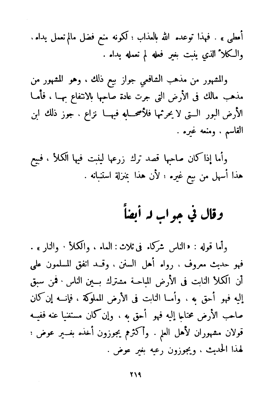 وَأَمَّا قَوْلُهُ: {النَّاسُ شُرَكَاءُ فِي ثَلَاثٍ: الْمَاءُ وَالْكَلَأُ وَالنَّارُ} . فَهُوَ حَدِيثٌ مَعْرُوفٌ رَوَاهُ أَهْلُ السُّنَنِ وَقَدْ اتَّفَقَ الْمُسْلِمُونَ عَلَى أَنَّ الْكَلَأَ النَّابِتَ فِي الْأَرْضِ الْمُبَاحَةِ مُشْتَرَكٌ بَيْنَ النَّاسِ فَمَنْ سَبَقَ إلَيْهِ فَهُوَ أَحَقُّ بِهِ وَأَمَّا النَّابِتُ فِي الْأَرْضِ الْمَمْلُوكَةِ فَإِنَّهُ إنْ كَانَ صَاحِبُ الْأَرْضِ مُحْتَاجًا إلَيْهِ فَهُوَ أَحَقُّ بِهِ وَإِنْ كَانَ مُسْتَغْنِيًا عَنْهُ فَفِيهِ قَوْلَانِ مَشْهُورَانِ لِأَهْلِ الْعِلْمِ. وَأَكْثَرُهُمْ يُجَوِّزُونَ أَخْذَهُ بِغَيْرِ عِوَضٍ؛ لِهَذَا الْحَدِيثِ وَيُجَوِّزُونَ رَعْيَهُ بِغَيْرِ عِوَضٍ.