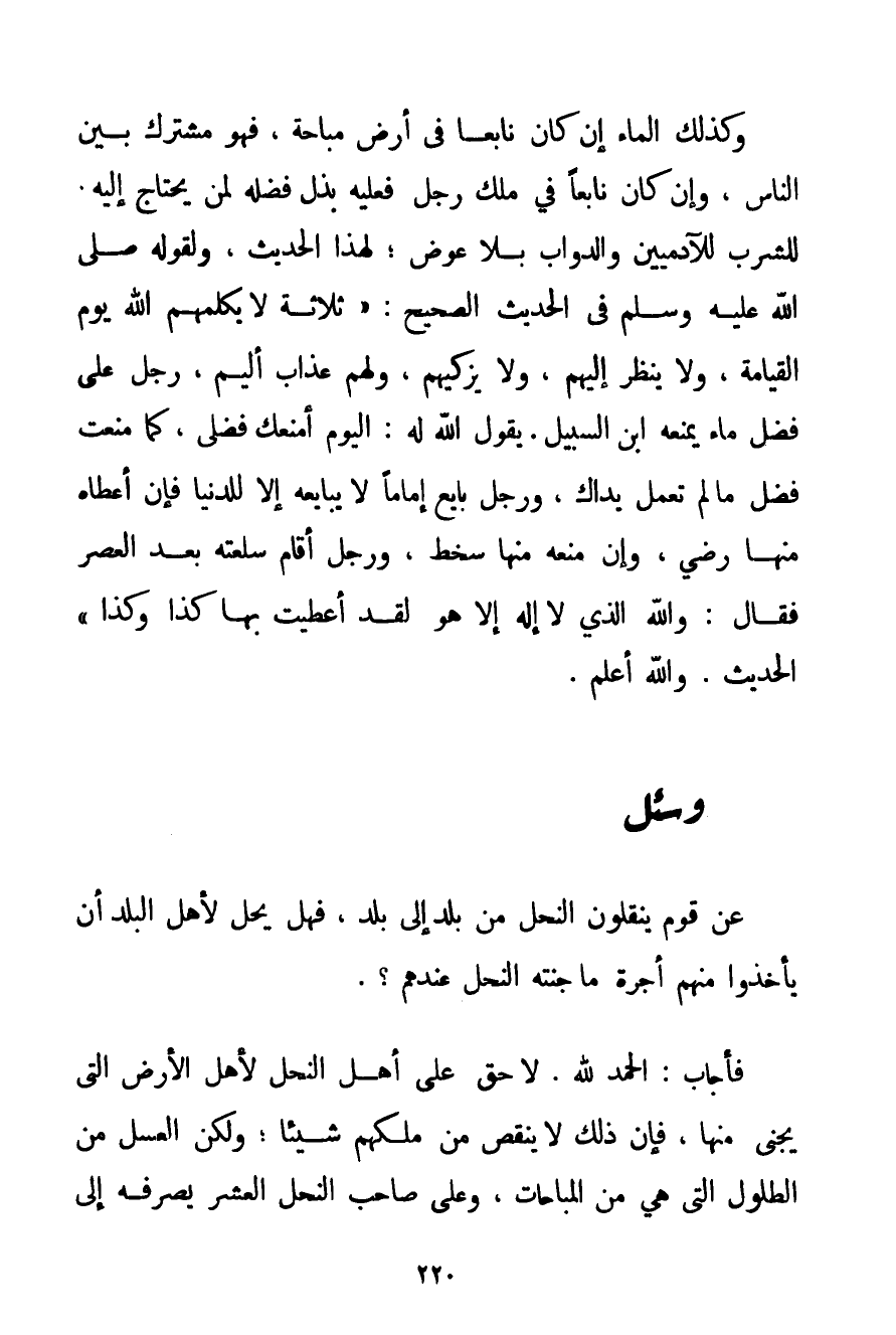 وَكَذَلِكَ الْمَاءُ إنْ كَانَ نَابِعًا فِي أَرْضٍ مُبَاحَةٍ فَهُوَ مُشْتَرَكٌ بَيْنَ النَّاسِ وَإِنْ كَانَ نَابِعًا فِي مِلْكِ رَجُلٍ فَعَلَيْهِ بَذْلُ فَضْلِهِ لِمَنْ يَحْتَاجُ إلَيْهِ لِلشُّرْبِ لِلْآدَمِيِّينَ وَالدَّوَابِّ بِلَا عِوَضٍ؛ لِهَذَا الْحَدِيثِ وَلِقَوْلِهِ صَلَّى اللَّهُ عَلَيْهِ وَسَلَّمَ فِي الْحَدِيثِ الصَّحِيحِ: {ثَلَاثَةٌ لَا يُكَلِّمُهُمْ اللَّهُ يَوْمَ الْقِيَامَةِ وَلَا يَنْظُرُ إلَيْهِمْ وَلَا يُزَكِّيهِمْ وَلَهُمْ عَذَابٌ أَلِيمٌ رَجُلٌ عَلَى فَضْلِ مَاءٍ يَمْنَعُهُ ابْنَ السَّبِيلِ، يَقُولُ اللَّهُ لَهُ: الْيَوْمَ أَمْنَعُك فَضْلِي كَمَا مَنَعْت فَضْلَ مَا لَمْ تَعْمَلْ يَدَاك وَرَجُلٌ بَايَعَ إمَامًا لَا يُبَايِعُهُ إلَّا لِلدُّنْيَا فَإِنْ أَعْطَاهُ مِنْهَا رَضِيَ وَإِنْ مَنَعَهُ مِنْهَا سَخِطَ وَرَجُلٌ أَقَامَ سِلْعَتَهُ بَعْدَ الْعَصْرِ فَقَالَ: وَاَللَّهِ الَّذِي لَا إلَهَ إلَّا هُوَ لَقَدْ أُعْطِيت بِهَا كَذَا وَكَذَا} الْحَدِيثَ. وَاَللَّهُ أَعْلَمُ.