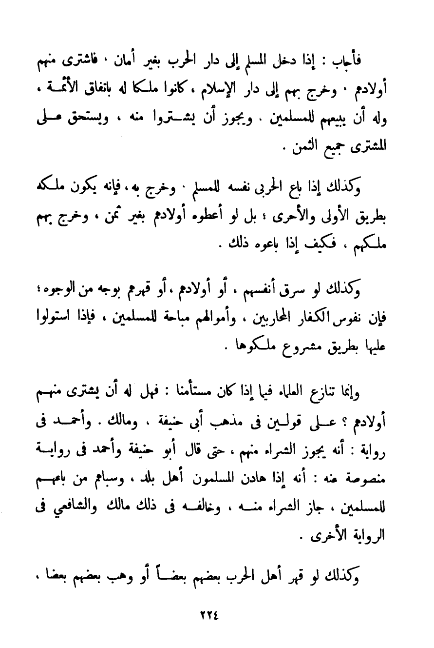 إذَا دَخَلَ الْمُسْلِمُ إلَى دَارِ الْحَرْبِ بِغَيْرِ أَمَانٍ فَاشْتَرَى مِنْهُمْ أَوْلَادَهُمْ وَخَرَجَ بِهِمْ إلَى دَارِ الْإِسْلَامِ كَانُوا مِلْكًا لَهُ بِاتِّفَاقِ الْأَئِمَّةِ وَلَهُ أَنْ يَبِيعَهُمْ لِلْمُسْلِمِينَ وَيَجُوزُ أَنْ يَشْتَرُوا مِنْهُ وَيَسْتَحِقَّ عَلَى الْمُشْتَرِي جَمِيعَ الثَّمَنِ. وَكَذَلِكَ إذَا بَاعَ الْحَرْبِيُّ نَفْسَهُ لِلْمُسْلِمِ وَخَرَجَ بِهِ فَإِنَّهُ يَكُونُ مِلْكَهُ بِطَرِيقِ الْأَوْلَى وَالْأَحْرَى؛ بَلْ لَوْ أَعْطَوْهُ أَوْلَادَهُمْ بِغَيْرِ ثَمَنٍ وَخَرَجَ بِهِمْ مَلِكُهُمْ فَكَيْفَ إذَا بَاعُوهُ ذَلِكَ. وَكَذَلِكَ لَوْ سَرَقَ أَنْفُسَهُمْ أَوْ أَوْلَادَهُمْ أَوْ قَهَرَهُمْ بِوَجْهٍ مِنْ الْوُجُوهِ؛ فَإِنَّ نُفُوسَ الْكُفَّارِ الْمُحَارَبِينَ وَأَمْوَالَهُمْ مُبَاحَةٌ لِلْمُسْلِمِينَ فَإِذَا اسْتَوْلَوْا عَلَيْهَا بِطَرِيقٍ مَشْرُوعٍ مَلَكُوهَا. وَإِنَّمَا تَنَازَعَ الْعُلَمَاءُ فِي إذَا كَانَ مُسْتَأْمَنًا: فَهَلْ لَهُ أَنْ يَشْتَرِيَ مِنْهُمْ أَوْلَادَهُمْ؟ عَلَى قَوْلَيْنِ فِي مَذْهَبِ أَبِي حَنِيفَةَ وَمَالِكٍ. وَأَحْمَد فِي رِوَايَةٍ: أَنَّهُ يَجُوزُ الشِّرَاءُ مِنْهُمْ حَتَّى قَالَ أَبُو حَنِيفَةَ وَأَحْمَد فِي رِوَايَةٍ مَنْصُوصَةٍ عَنْهُ: أَنَّهُ إذَا هَادَنَ الْمُسْلِمُونَ أَهْلَ بَلَدٍ وَسَبَاهُمْ مَنْ بَاعَهُمْ لِلْمُسْلِمِينَ جَازَ الشِّرَاءُ مِنْهُ وَخَالَفَهُ فِي ذَلِكَ مَالِكٌ وَالشَّافِعِيُّ فِي الرِّوَايَةِ الْأُخْرَى. وَكَذَلِكَ لَوْ قَهَرَ أَهْلُ الْحَرْبِ بَعْضُهُمْ بَعْضًا أَوْ وَهَبَ بَعْضُهُمْ بَعْضًا