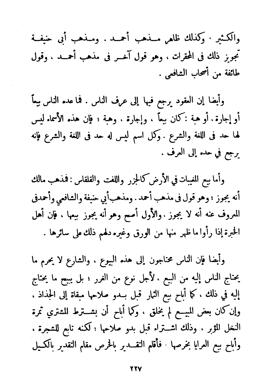 وَالْكَثِيرِ وَكَذَلِكَ ظَاهِرُ مَذْهَبِ أَحْمَد. وَمَذْهَبُ أَبِي حَنِيفَةَ تَجْوِيزُ ذَلِكَ فِي الْمُحَقَّرَاتِ وَهُوَ قَوْلٌ آخَرُ فِي مَذْهَبِ أَحْمَد وَقَوْلُ طَائِفَةٍ مِنْ أَصْحَابِ الشَّافِعِيِّ. وَأَيْضًا إنَّ الْعُقُودَ يُرْجَعُ فِيهَا إلَى عُرْفِ النَّاسِ. فَمَا عَدَّهُ النَّاسُ بَيْعًا أَوْ إجَارَةً أَوْ هِبَةً: كَانَ بَيْعًا وَإِجَارَةً وَهِبَةً؛ فَإِنَّ هَذِهِ الْأَسْمَاءَ لَيْسَ لَهَا حَدٌّ فِي اللُّغَةِ وَالشَّرْعِ. وَكُلُّ اسْمٍ لَيْسَ لَهُ حَدٌّ فِي اللُّغَةِ وَالشَّرْعِ فَإِنَّهُ يُرْجَعُ فِي حَدِّهِ إلَى الْعُرْفِ. وَأَمَّا بَيْعُ الْمُغَيَّبَاتِ فِي الْأَرْضِ كَالْجَزَرِ وَاللِّفْتِ وَالْقُلْقَاسِ: فَمَذْهَبُ مَالِكٍ أَنَّهُ يَجُوزُ؛ وَهُوَ قَوْلٌ فِي مَذْهَبِ أَحْمَد. وَمَذْهَبُ أَبِي حَنِيفَةَ وَالشَّافِعِيِّ وَأَحْمَد فِي الْمَعْرُوفِ عَنْهُ أَنَّهُ لَا يَجُوزُ وَالْأَوَّلُ أَصَحُّ وَهُوَ أَنَّهُ يَجُوزُ بَيْعُهَا فَإِنَّ أَهْلَ الْخِبْرَةِ إذَا رَأَوْا مَا ظَهَرَ مِنْهَا مِنْ الْوَرَقِ وَغَيْرِهِ دَلَّهُمْ ذَلِكَ عَلَى سَائِرِهَا. وَأَيْضًا فَإِنَّ النَّاسَ مُحْتَاجُونَ إلَى هَذِهِ الْبُيُوعِ وَالشَّارِعُ لَا يُحَرِّمُ مَا يَحْتَاجُ النَّاسُ إلَيْهِ مِنْ الْبَيْعِ لِأَجْلِ نَوْعٍ مِنْ الْغَرَرِ؛ بَلْ يُبِيحُ مَا يَحْتَاجُ إلَيْهِ فِي ذَلِكَ كَمَا أَبَاحَ بَيْعَ الثِّمَارِ قَبْلَ بُدُوِّ صَلَاحِهَا مُبْقَاةً إلَى الْجُذَاذِ وَإِنْ كَانَ بَعْضُ الْمَبِيعِ لَمْ يُخْلَقْ وَكَمَا أَبَاحَ أَنْ يَشْتَرِطَ الْمُشْتَرِي ثَمَرَةَ النَّخْلِ الْمُؤَبَّرِ وَذَلِكَ اشْتِرَاءٌ قَبْلَ بُدُوِّ صَلَاحِهَا؛ لَكِنَّهُ تَابِعٌ لِلشَّجَرَةِ وَأَبَاحَ بَيْعَ الْعَرَايَا بِخَرْصِهَا. فَأَقَامَ التَّقْدِيرَ بِالْخَرْصِ مَقَامَ التَّقْدِيرِ بِالْكَيْلِ