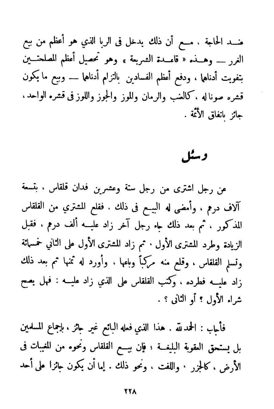 عِنْدَ الْحَاجَةِ مَعَ أَنَّ ذَلِكَ يَدْخُلُ فِي الرِّبَا الَّذِي هُوَ أَعْظَمُ مِنْ بَيْعِ الْغَرَرِ - وَهَذِهِ " قَاعِدَةُ الشَّرِيعَةِ " وَهُوَ تَحْصِيلُ أَعْظَمِ الْمَصْلَحَتَيْنِ بِتَفْوِيتِ أَدْنَاهُمَا وَدَفْعُ أَعْظَمِ الفسادين بِالْتِزَامِ أَدْنَاهُمَا - وَبَيْعُ مَا يَكُونُ قِشْرُهُ صَوْنًا لَهُ كَالْعِنَبِ وَالرُّمَّانِ وَالْمَوْزِ وَالْجَوْزِ وَاللَّوْزِ فِي قِشْرِهِ الْوَاحِدِ جَائِزٌ بِاتِّفَاقِ الْأَئِمَّةِ.