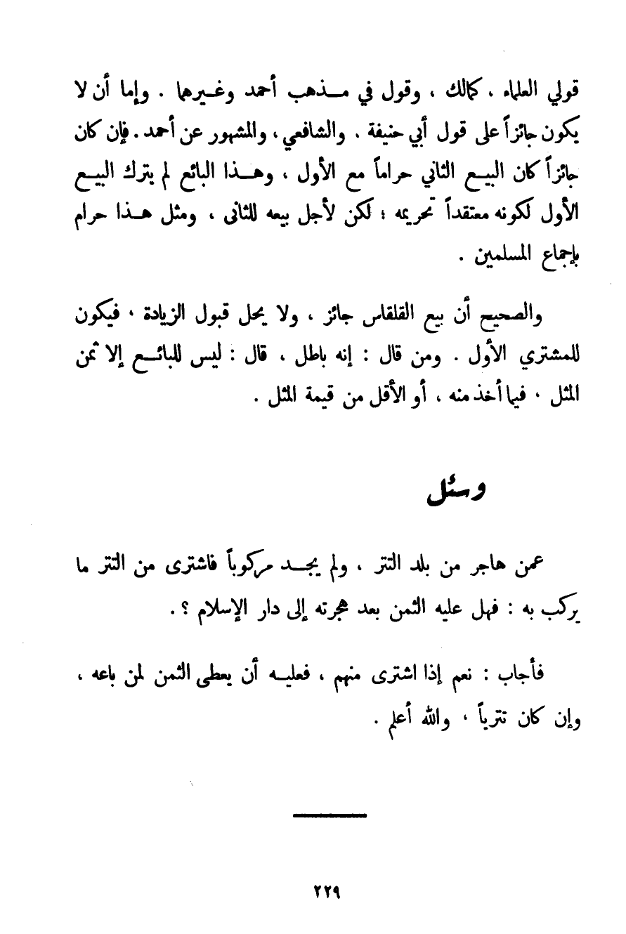 قَوْلَيْ الْعُلَمَاءِ كَمَالِكٍ وَقَوْلٍ فِي مَذْهَبِ أَحْمَد وَغَيْرِهِمَا. وَإِمَّا أَنْ لَا يَكُونَ جَائِزًا عَلَى قَوْلِ أَبِي حَنِيفَةَ وَالشَّافِعِيِّ وَالْمَشْهُورِ عَنْ أَحْمَد. فَإِنْ كَانَ جَائِزًا كَانَ الْبَيْعُ الثَّانِي حَرَامًا مَعَ الْأَوَّلِ وَهَذَا الْبَائِعُ لَمْ يَتْرُكْ الْبَيْعَ الْأَوَّلَ لِكَوْنِهِ مُعْتَقِدًا تَحْرِيمَهُ؛ لَكِنْ لِأَجْلِ بَيْعِهِ لِلثَّانِي وَمِثْلُ هَذَا حَرَامٌ بِإِجْمَاعِ الْمُسْلِمِينَ. وَالصَّحِيحُ أَنَّ بَيْعَ الْقُلْقَاسِ جَائِزٌ وَلَا يَحِلُّ قَبُولُ الزِّيَادَةِ فَيَكُونُ لِلْمُشْتَرِي الْأَوَّلِ. وَمَنْ قَالَ: إنَّهُ بَاطِلٌ قَالَ: لَيْسَ لِلْبَائِعِ إلَّا ثَمَنُ الْمِثْلِ فِيمَا أُخِذَ مِنْهُ أَوْ الْأَقَلُّ مِنْ قِيمَةِ الْمِثْلِ.