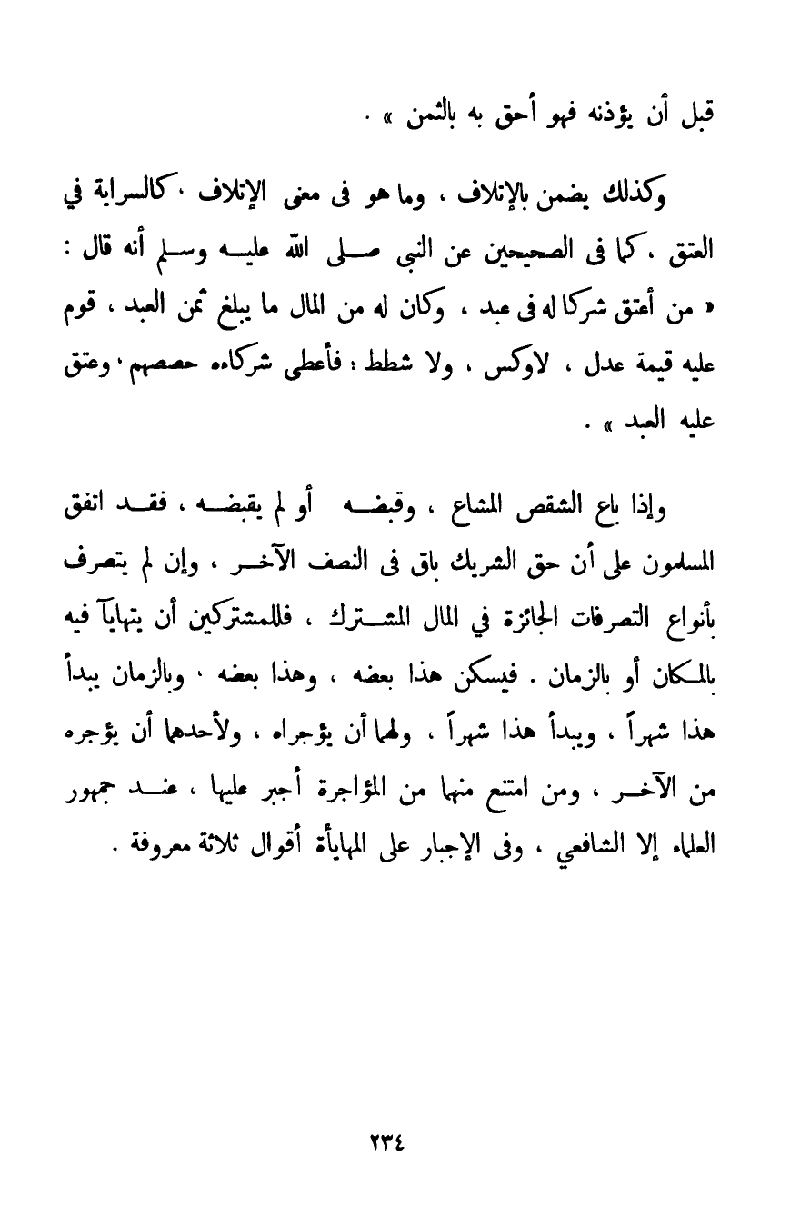 قَبْلَ أَنْ يُؤْذِنَهُ فَهُوَ أَحَقُّ بِهِ بِالثَّمَنِ} . وَكَذَلِكَ يُضَمَّنُ بِالْإِتْلَافِ وَمَا هُوَ فِي مَعْنَى الْإِتْلَافِ كَالسِّرَايَةِ فِي الْعِتْقِ كَمَا فِي الصَّحِيحَيْنِ عَنْ النَّبِيِّ صَلَّى اللَّهُ عَلَيْهِ وَسَلَّمَ أَنَّهُ قَالَ: {مَنْ أَعْتَقَ شِرْكًا لَهُ فِي عَبْدٍ وَكَانَ لَهُ مِنْ الْمَالِ مَا يَبْلُغُ ثَمَنَ الْعَبْدِ قُوِّمَ عَلَيْهِ قِيمَةَ عَدْلٍ لَا وَكْسَ وَلَا شَطَطَ؛ فَأَعْطَى شُرَكَاءَهُ حِصَصَهُمْ وَعَتَقَ عَلَيْهِ الْعَبْدُ} . وَإِذَا بَاعَ الشِّقْصَ الْمُشَاعَ وَقَبَضَهُ أَوْ لَمْ يَقْبِضْهُ فَقَدْ اتَّفَقَ الْمُسْلِمُونَ عَلَى أَنَّ حَقَّ الشَّرِيكِ بَاقٍ فِي النِّصْفِ الْآخَرِ وَإِنْ لَمْ يَتَصَرَّفْ بِأَنْوَاعِ التَّصَرُّفَاتِ الْجَائِزَةِ فِي الْمَالِ الْمُشْتَرَكِ فللمشتركين أَنْ يَتَهَايَآ فِيهِ بِالْمَكَانِ أَوْ بِالزَّمَانِ. فَيَسْكُنُ هَذَا بَعْضَهُ وَهَذَا بَعْضَهُ وَبِالزَّمَانِ يَبْدَأُ هَذَا شَهْرًا وَيَبْدَأُ هَذَا شَهْرًا وَلَهُمَا أَنْ يُؤَجِّرَاهُ وَلِأَحَدِهِمَا أَنْ يُؤَجِّرَهُ مِنْ الْآخَرِ وَمَنْ امْتَنَعَ مِنْهُمَا مِنْ الْمُؤَاجَرَةِ أُجْبِرَ عَلَيْهَا عِنْدَ جُمْهُورِ الْعُلَمَاءِ إلَّا الشَّافِعِيَّ وَفِي الْإِجْبَارِ عَلَى الْمُهَايَأَةِ أَقْوَالٌ ثَلَاثَةٌ مَعْرُوفَةٌ.